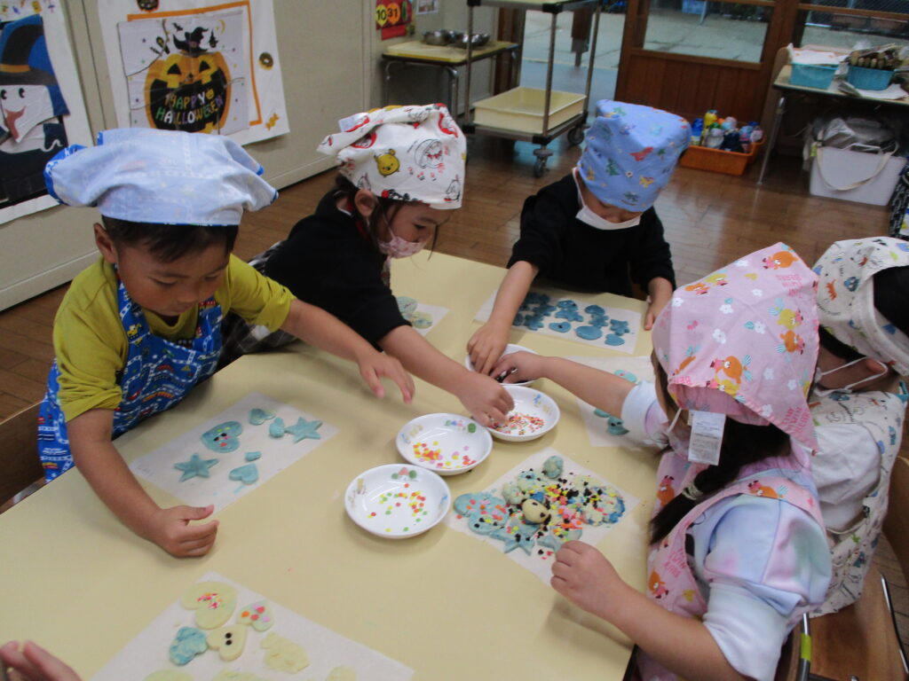 令和7年10月31日(金) りす組がレストランごっこで、クッキー作りに挑戦しました! まずは、身支度から(^^)/エプロン・三角巾・マスク等、どこまで自分でできるかな~と、見守って…