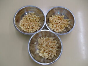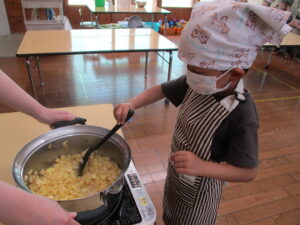 油で揚げる工程は まだ危ないので、給食の先生にお願いしました。
