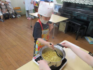 以前、おやつで食べたサンドイッチが美味しくて、給食の先生にジャムの作り方を教えてもらったくま組さん。