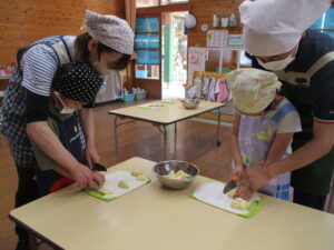 今日は、ピーラーや、包丁を使うので、最初に、安全な調理器具の使い方のお話をしっかり聞きました。