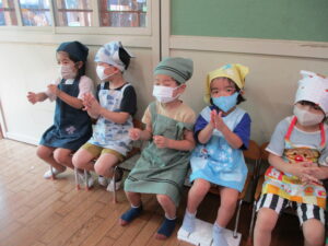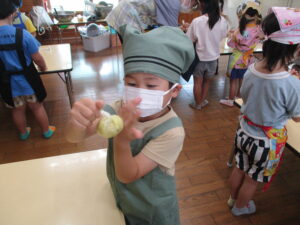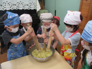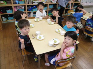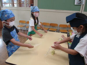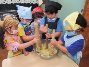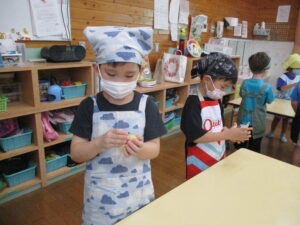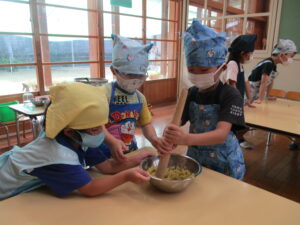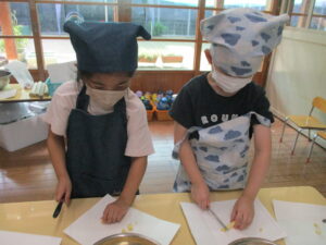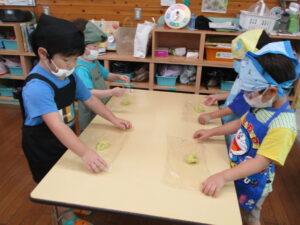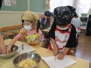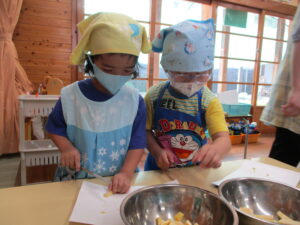 今月のくま組のレストランごっこは、さつま芋を使ったおやつ『茶巾絞り』作りに挑戦!!