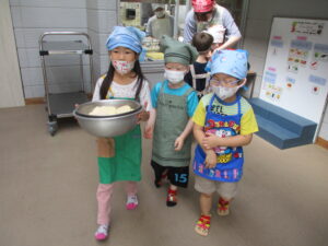 給食室へ、材料や道具をもらいに行きます。