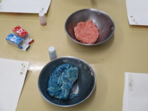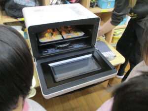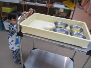 材料や、使う道具などを自分たちで給食室にもらいに行きます。