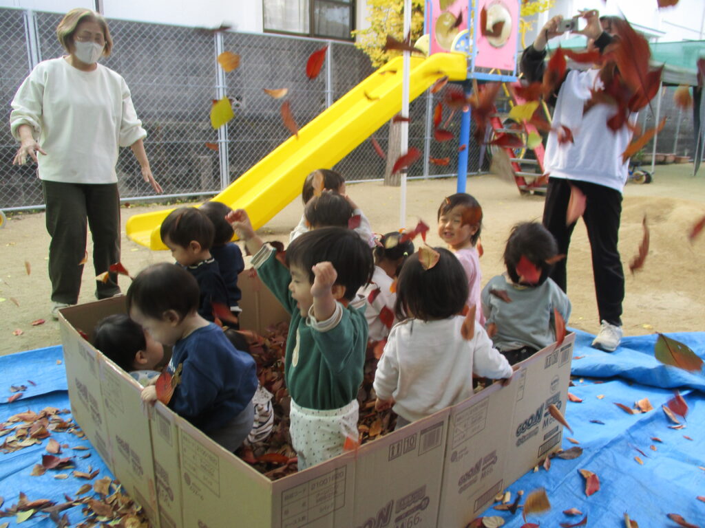 うさぎ・ひよこ組は、園庭で「落ち葉で遊ぼう!」