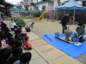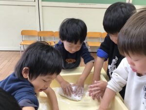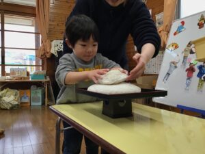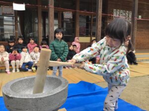 ぞう組とくま組は、杵をもっておもちつき体験をしました(^O^)/