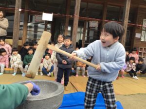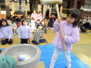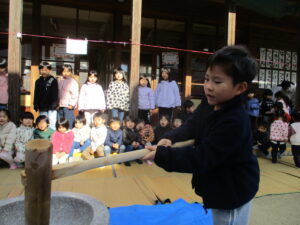 ぞう組とくま組は、杵をもっておもちつき体験をしました(^O^)/