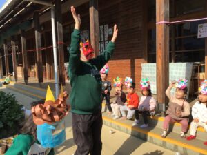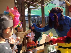今年は、お面を付けた保育士がオニ役です👹