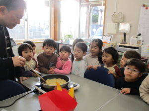 子どもたち、豆まきを前に、興味津々です。