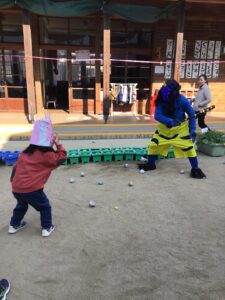 「鬼の目に豆をぶつけるんよ!」