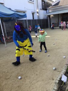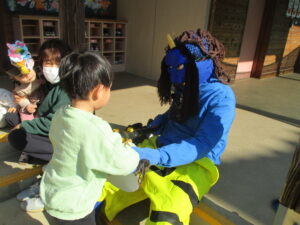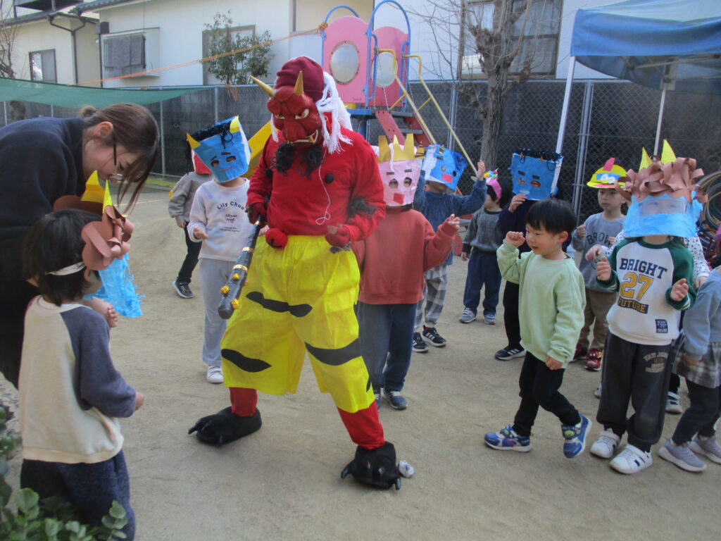 今年は、お面を付けた保育士がオニ役です👹