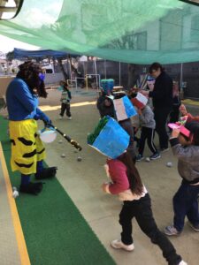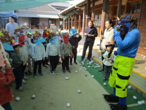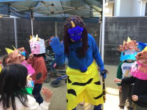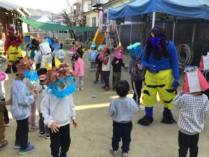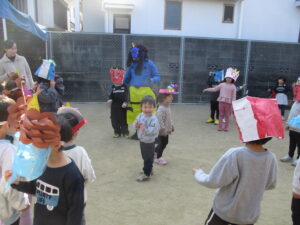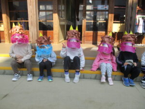 園庭には、お面を付けた子どもたちが準備万端です✨