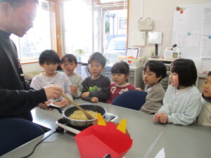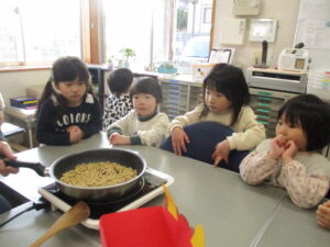 子どもたち、豆まきを前に、興味津々です。