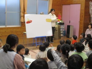 集会では、節分の話や、豆まきについてのお話を聞きました。