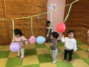 ひよこ組・うさぎ組は、お部屋で風船オニや、追いかけ豆まきゲームを楽しみました(*^▽^*)