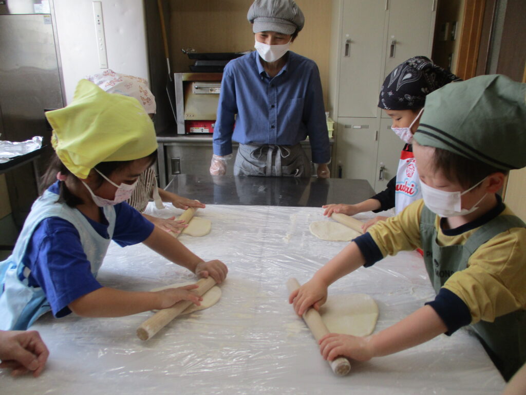 生地を両手で押しつぶしたら、麺棒を使って薄く伸ばしていきますよ~