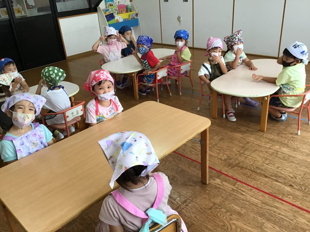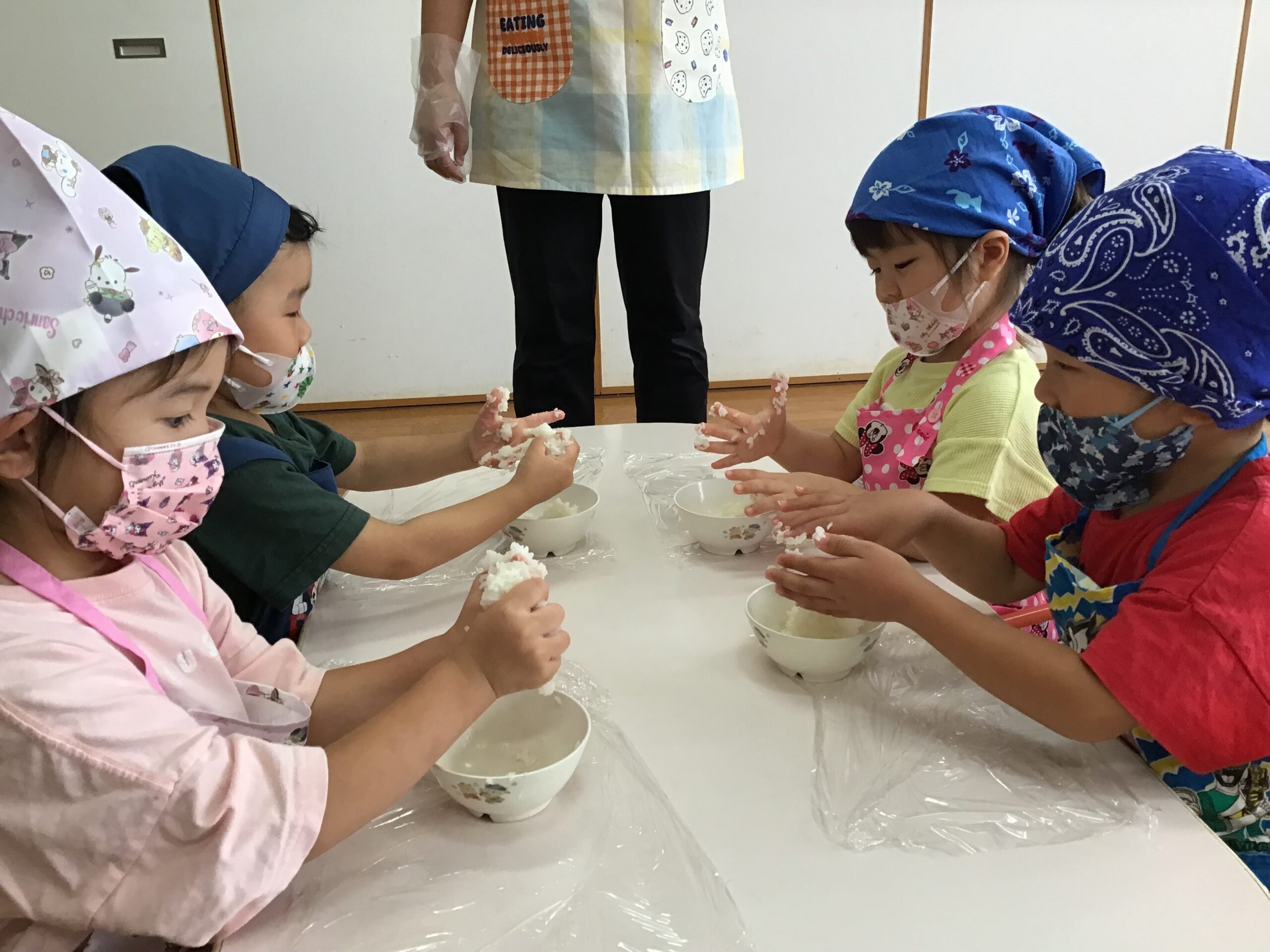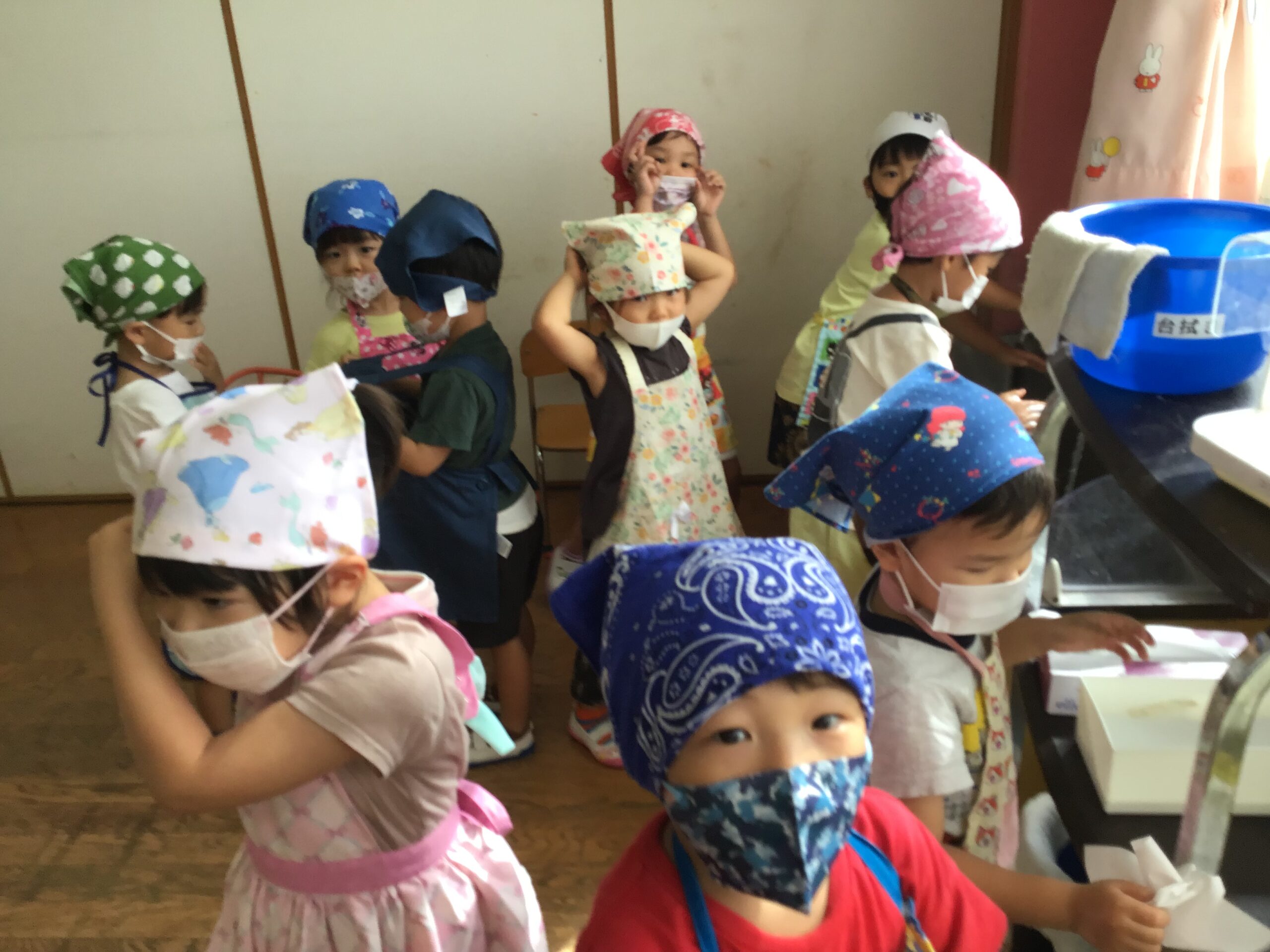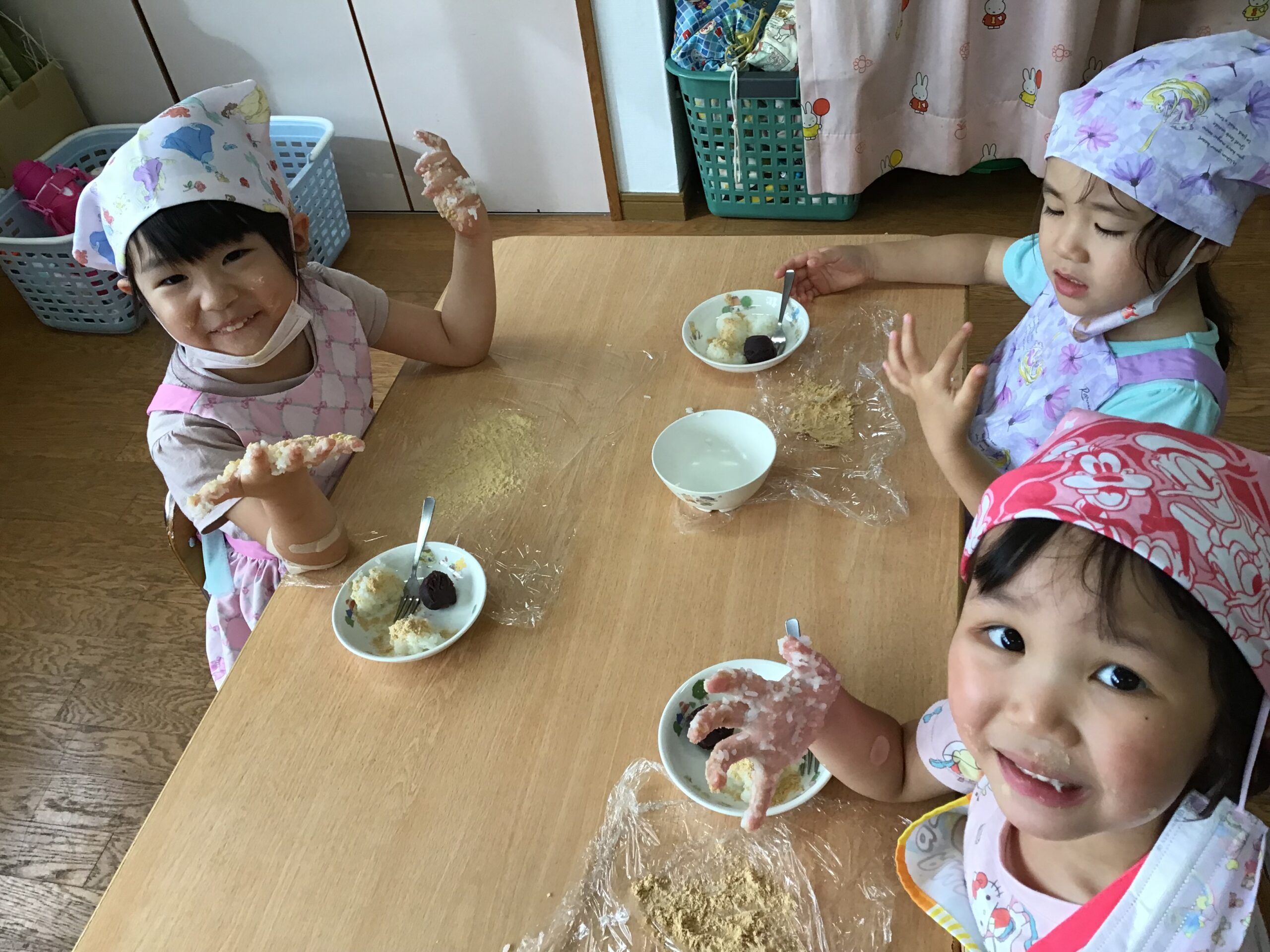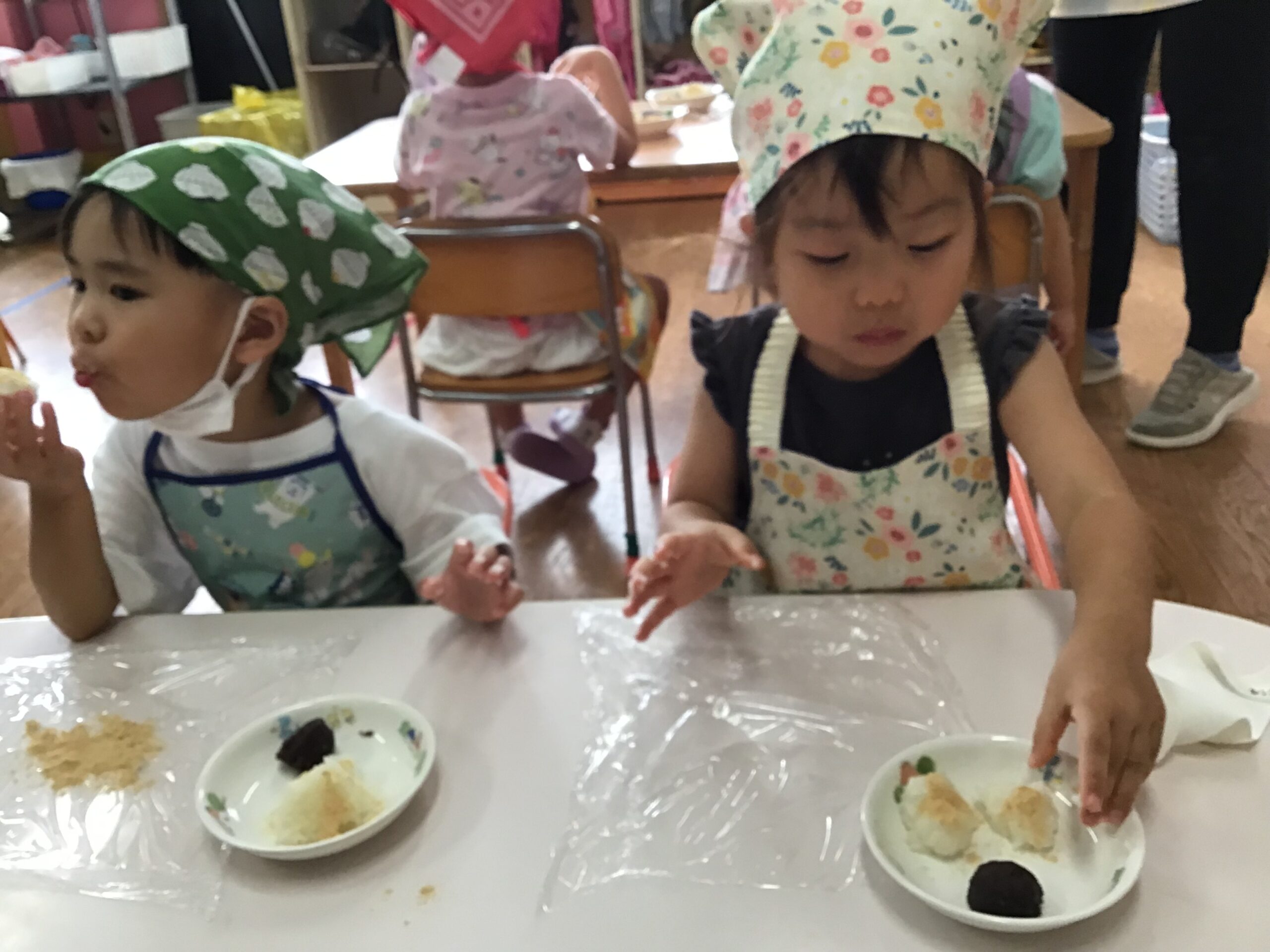 数日前から「おはぎ作りするよ。」と声をかけ、みんなと一緒に小麦粉粘土を使って団子を作り、予行練習もして当日をウキウキで迎えました😆前日の夜、何度もリュックにエプロンが入っているかの確認をしたお友だちもいたみたいです😊