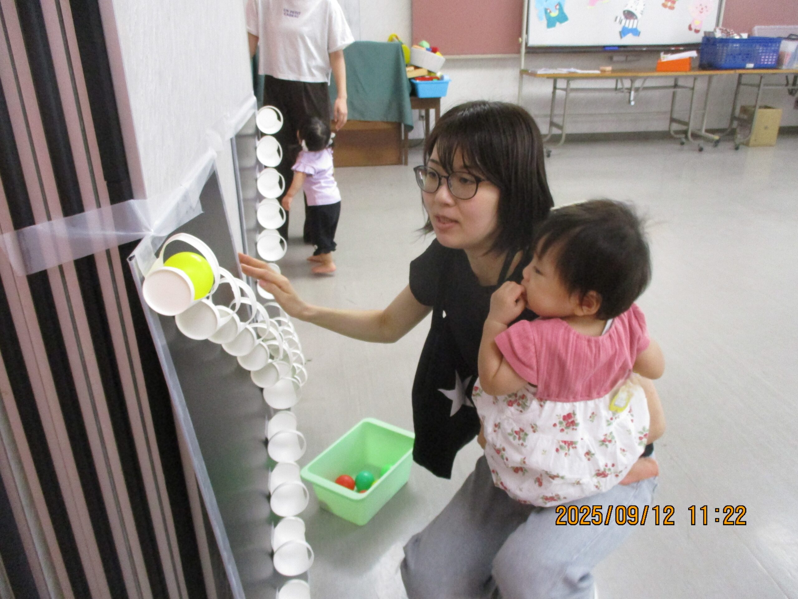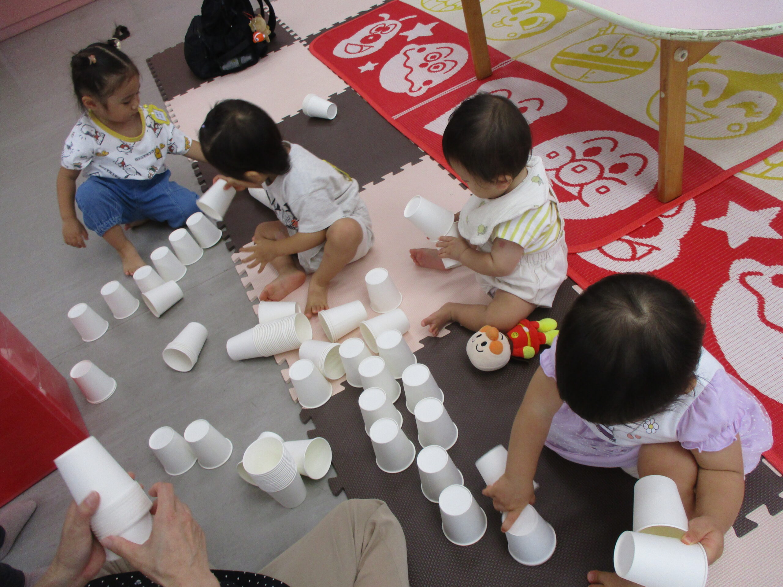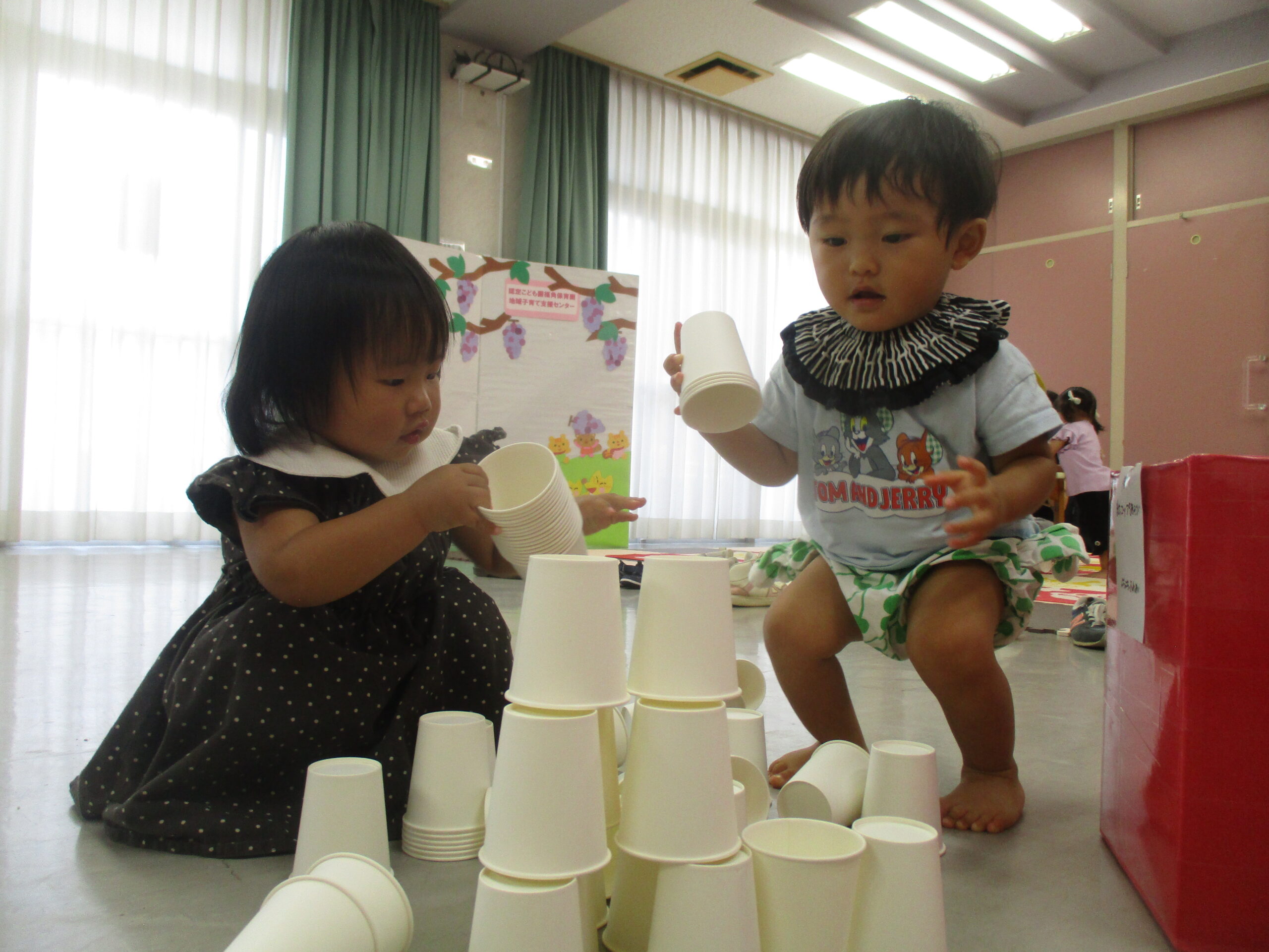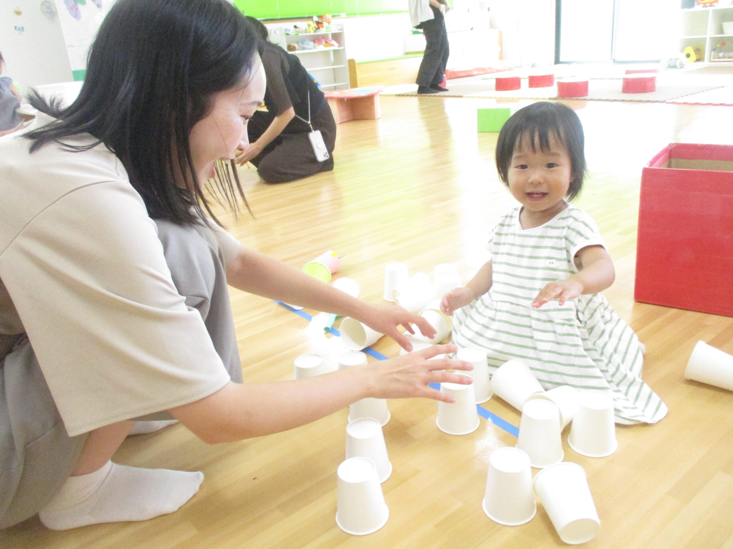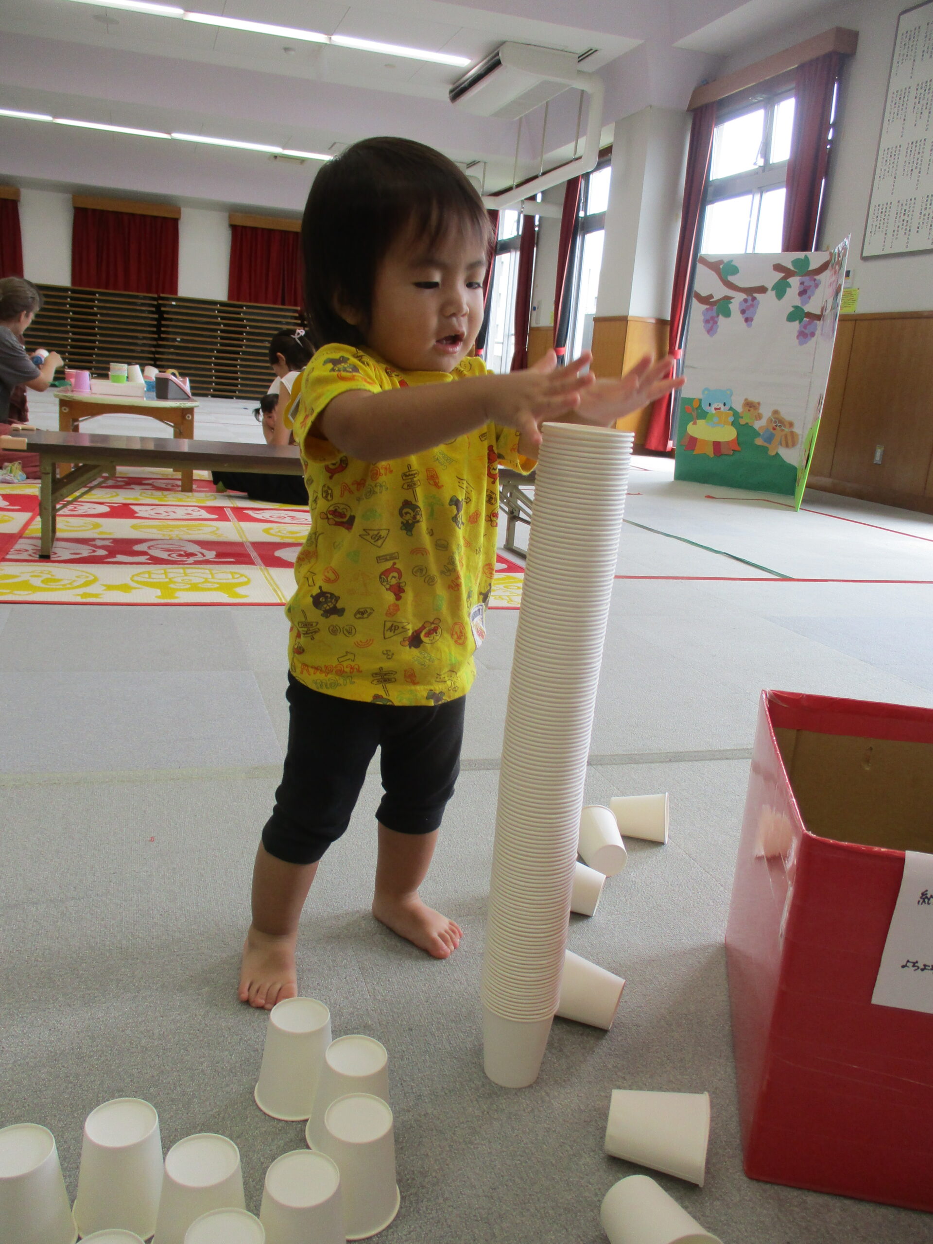 お母さんたちが積み上げていたものを見ながら真似をしていますが…