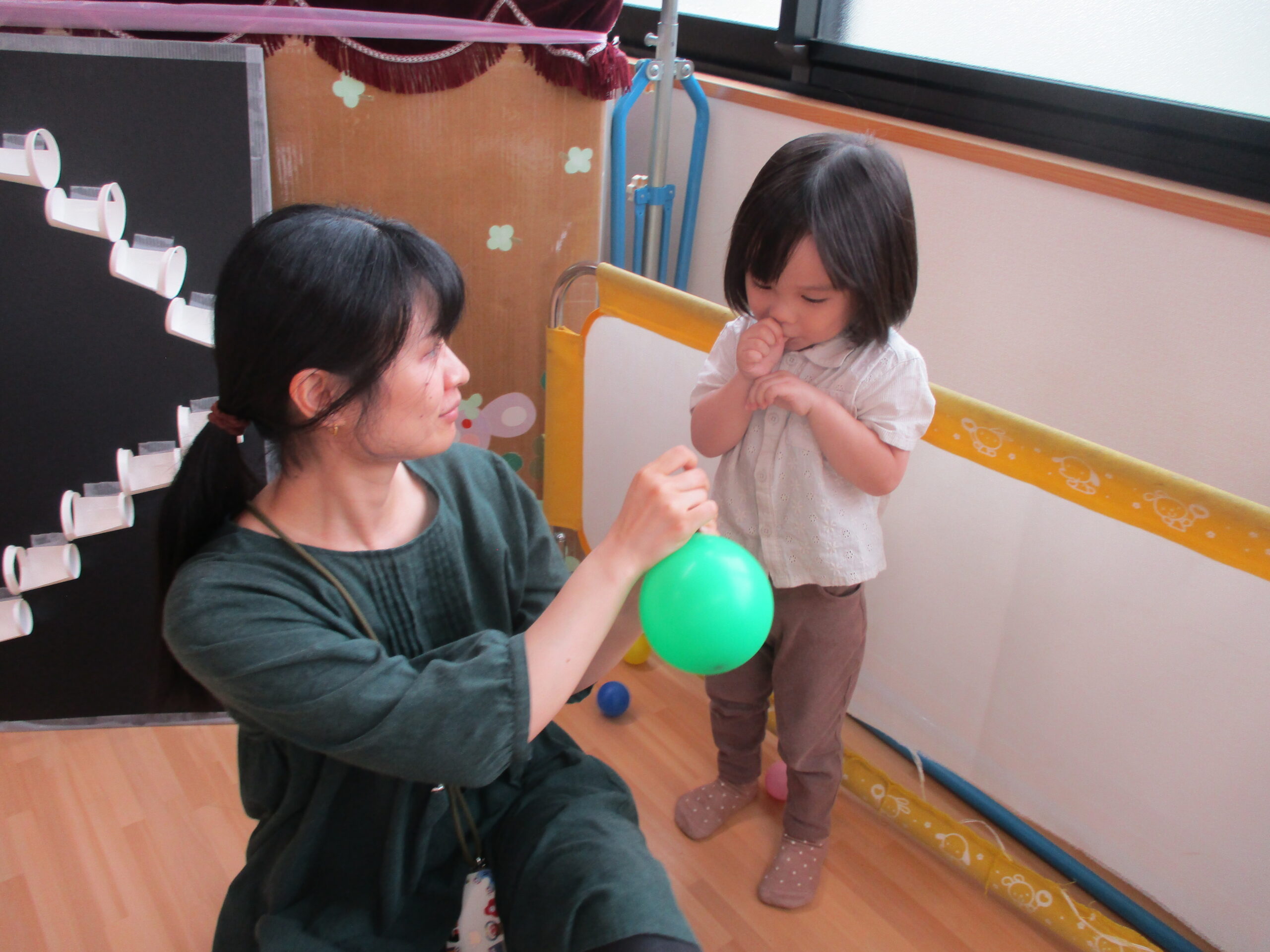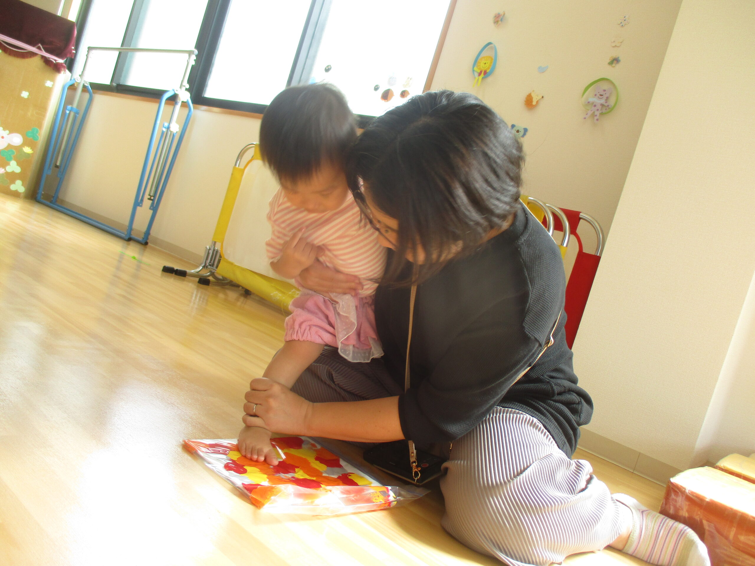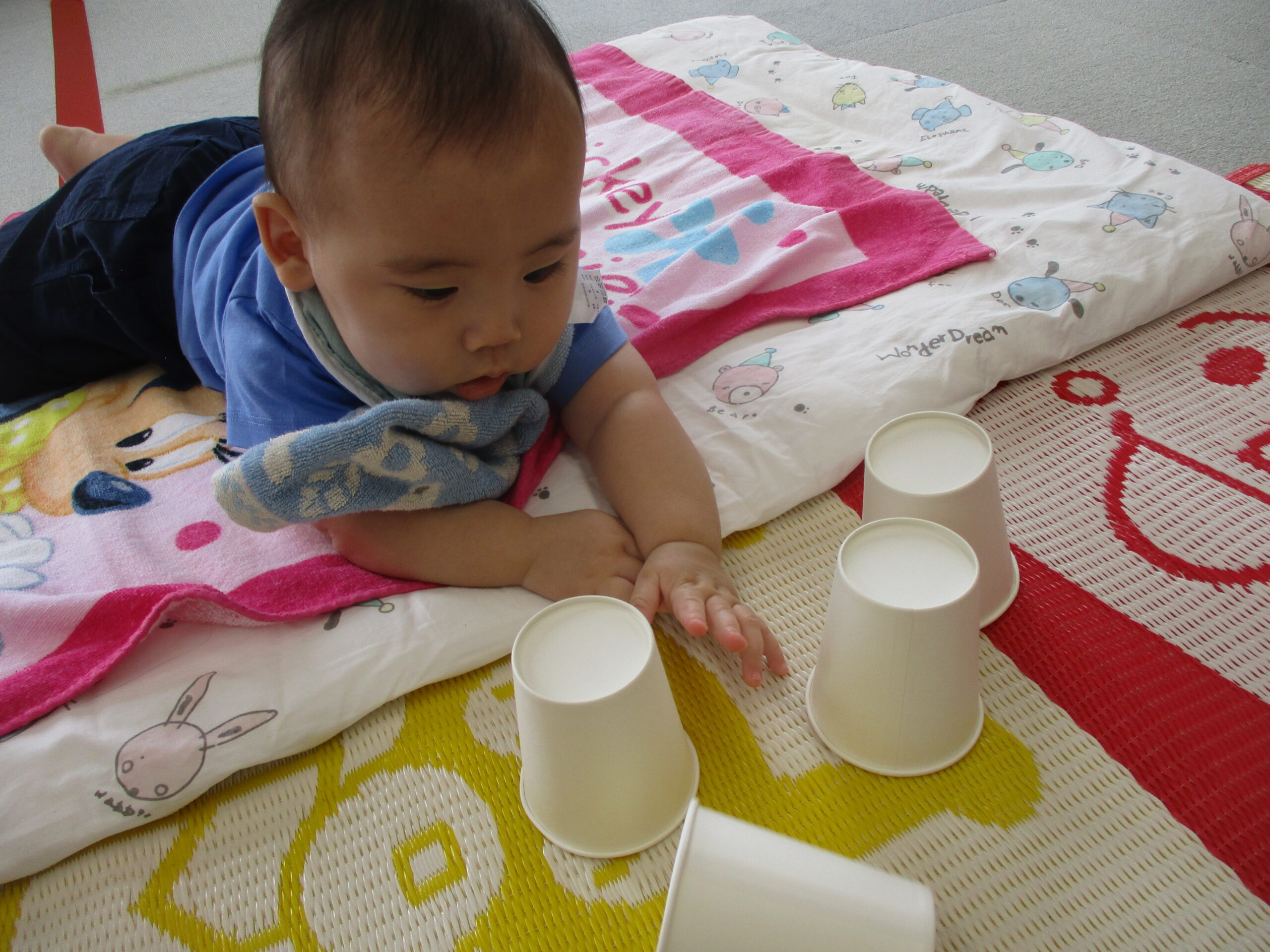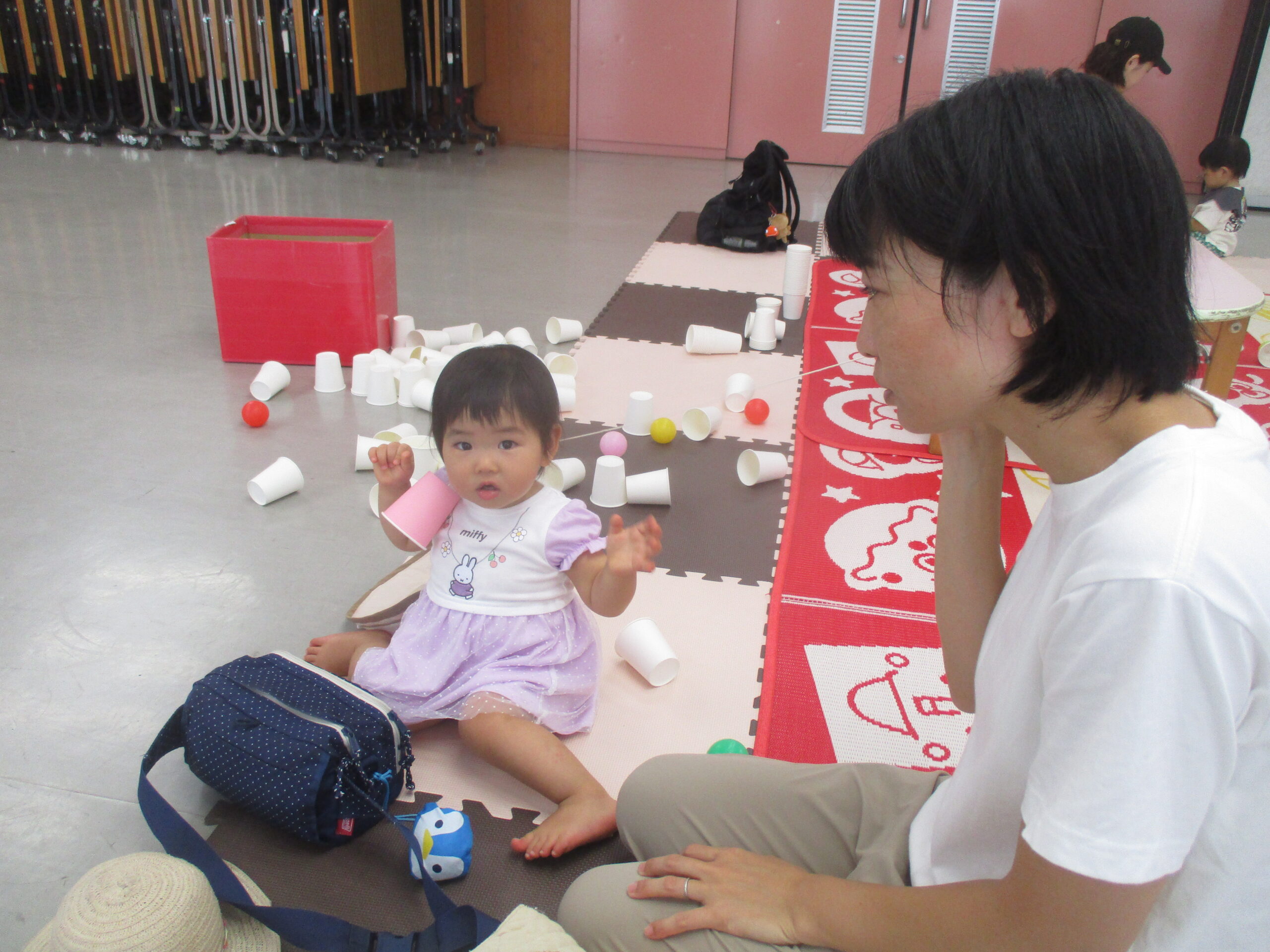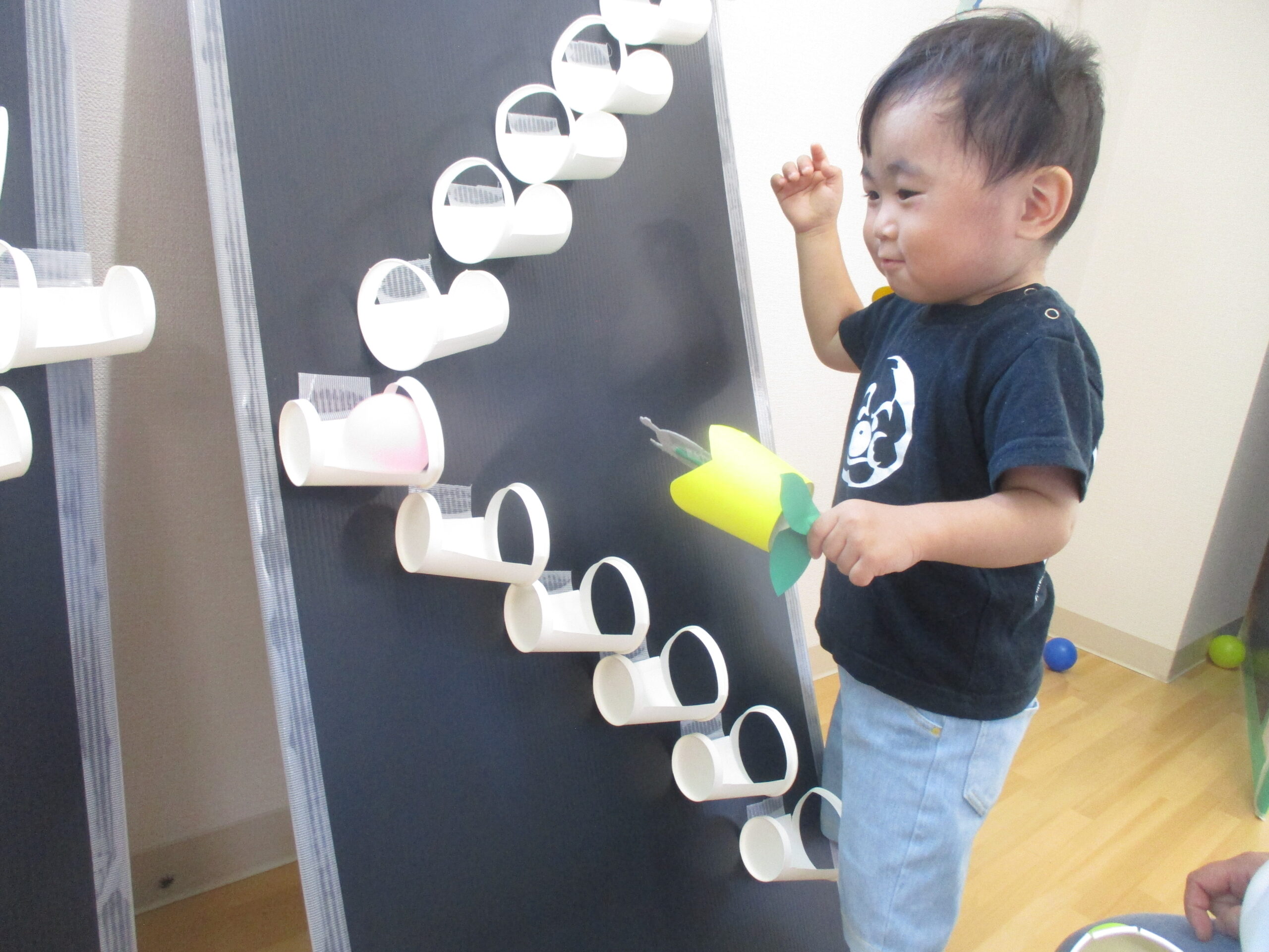 お母さんたちが積み上げていたものを見ながら真似をしていますが…