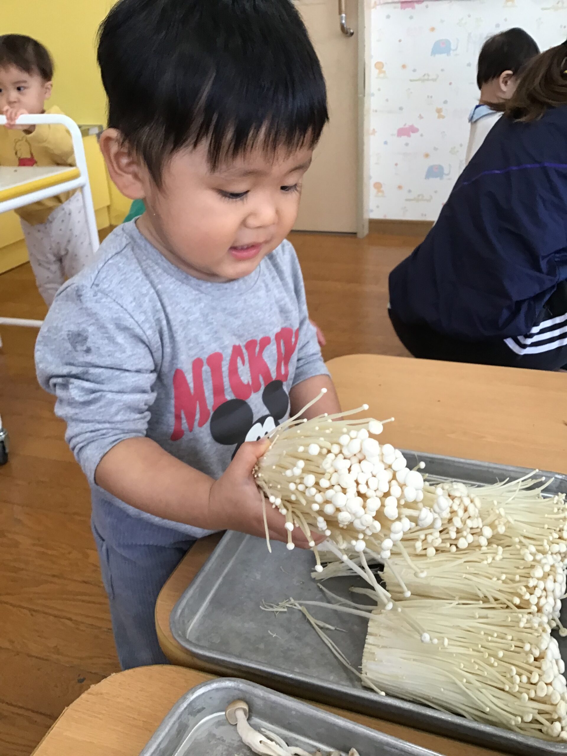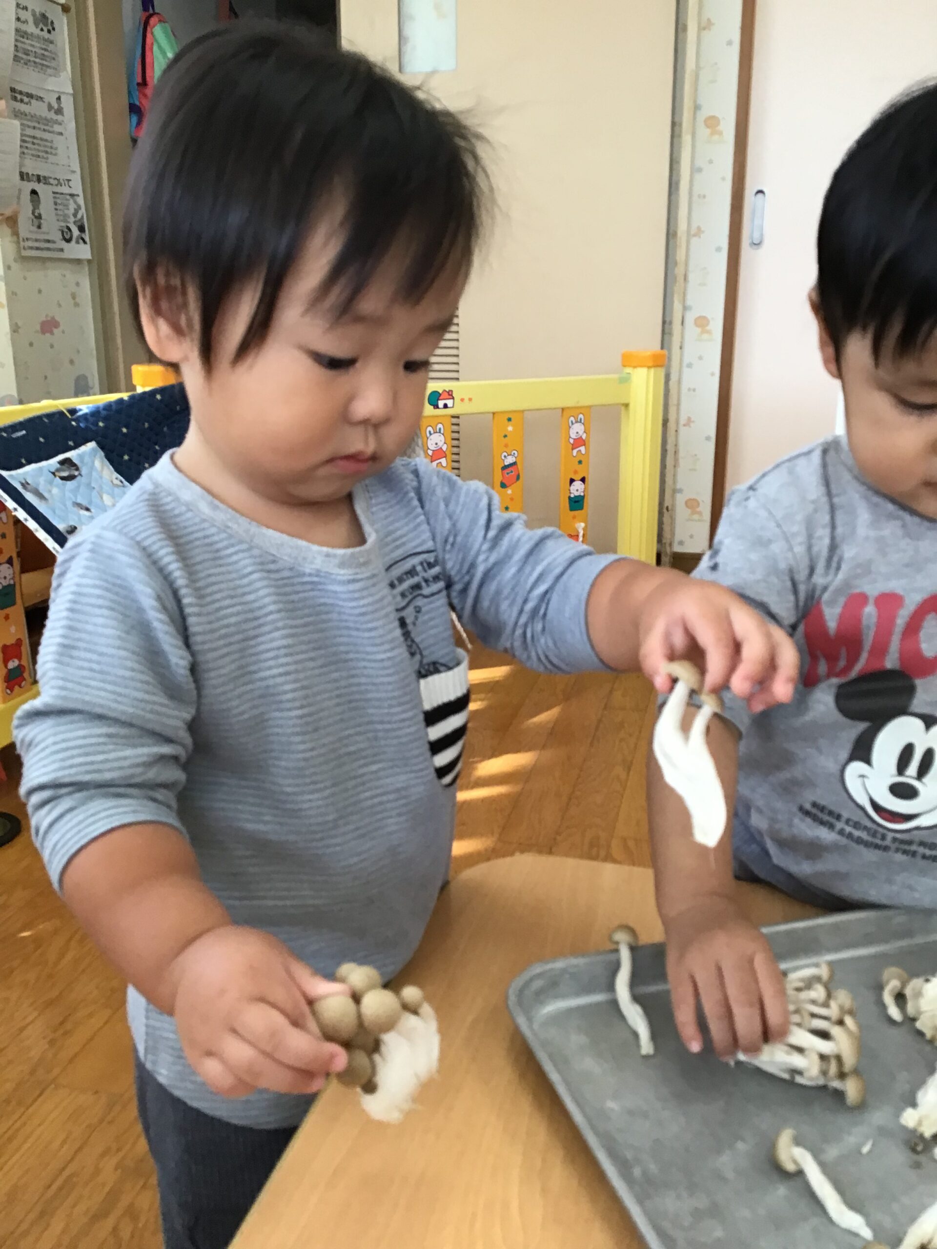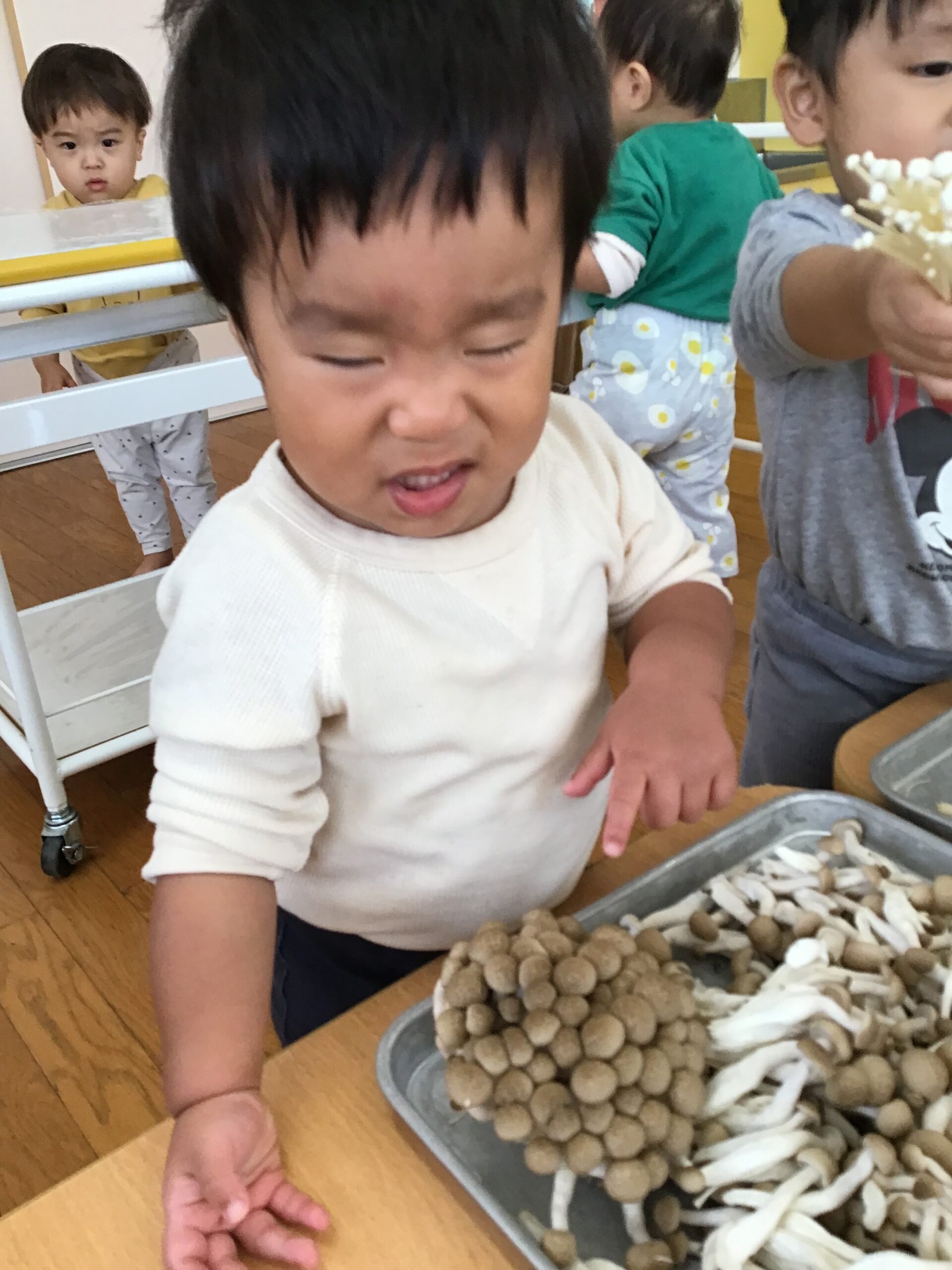 「きのこ?」「むきむきする?」と、どんなことをするのかなぁ…と気になる様子。
