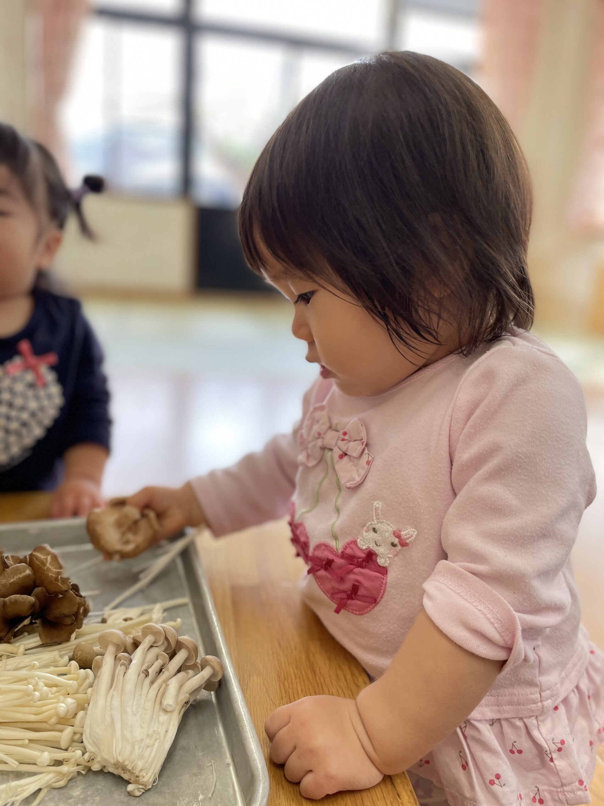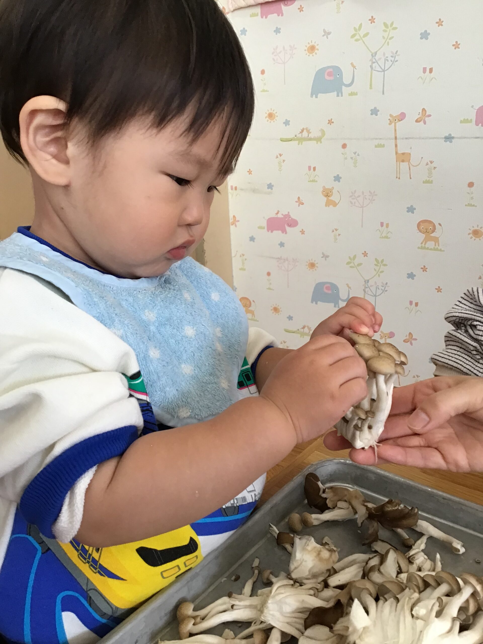 「きのこ?」「むきむきする?」と、どんなことをするのかなぁ…と気になる様子。