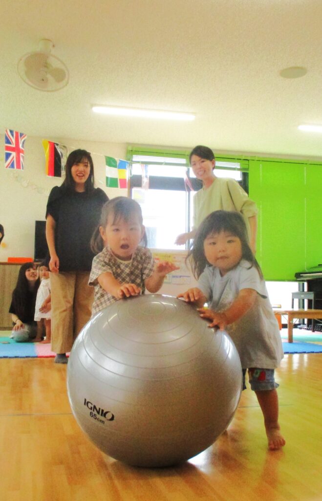 大きな玉を上手く押せずに手こずる子もいれば、お友だちと一緒にコロコロと転がす子もいました。