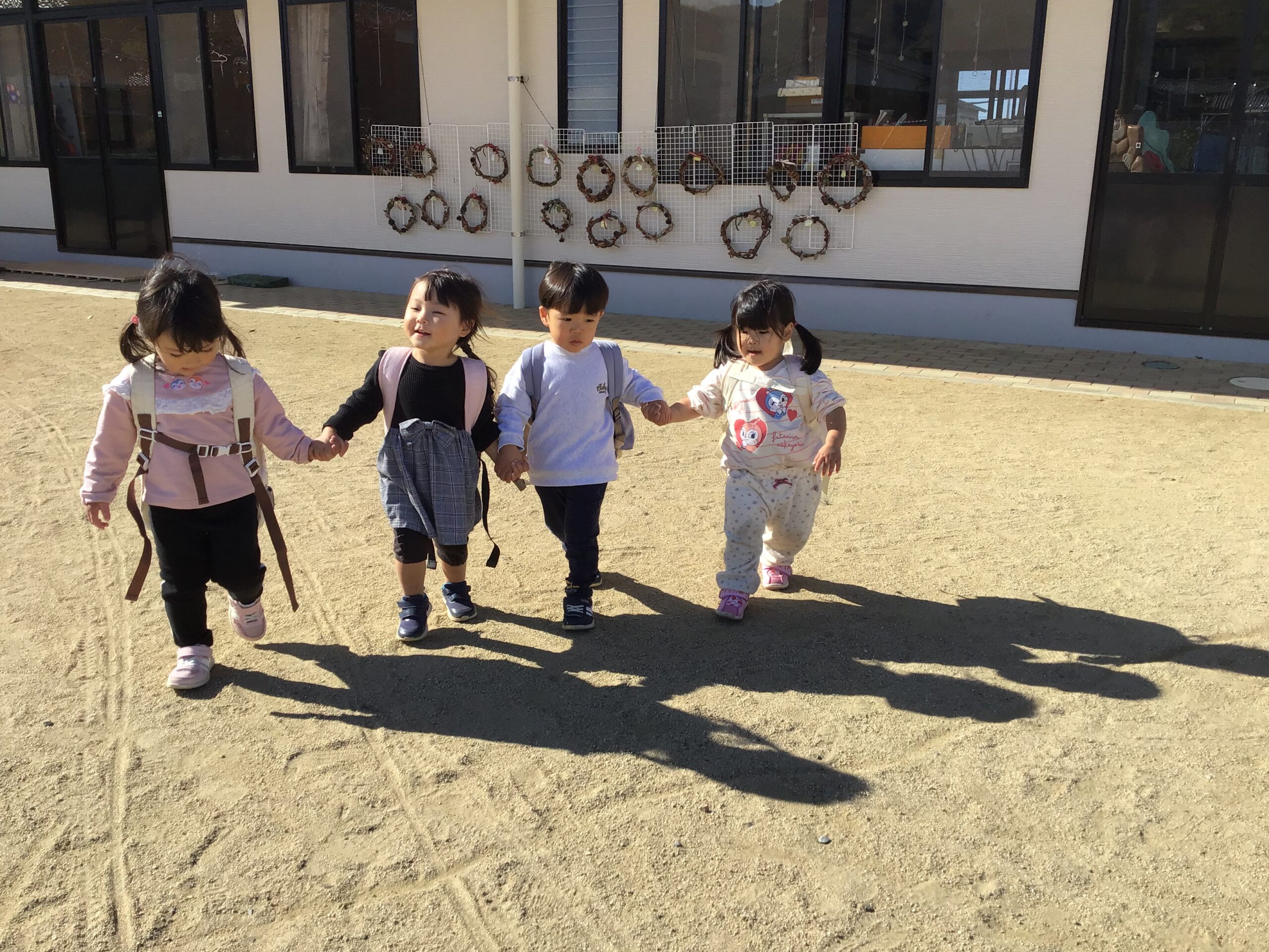 お友だちや保育教諭と手を繋いだり、お散歩カートに乗って出発!!