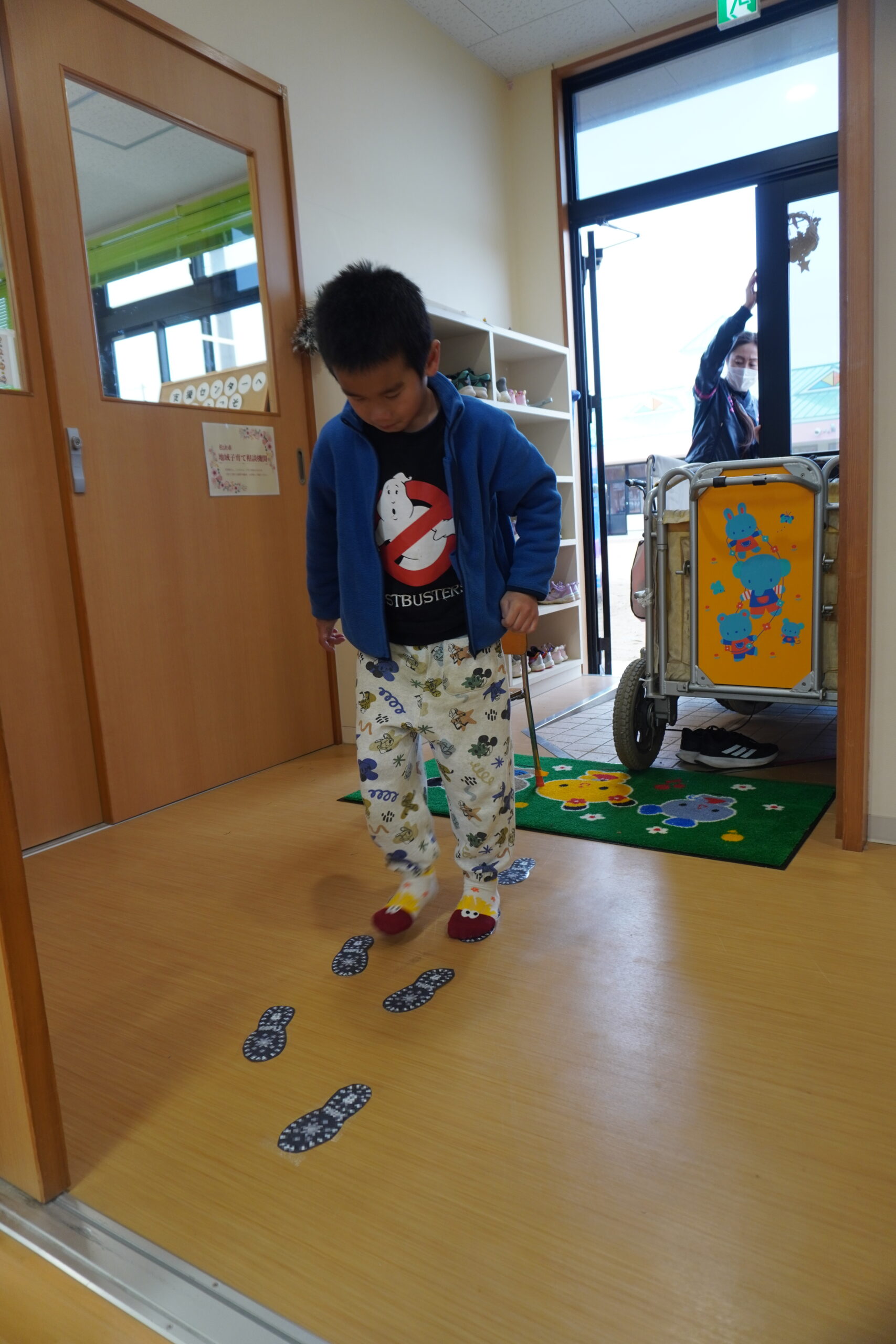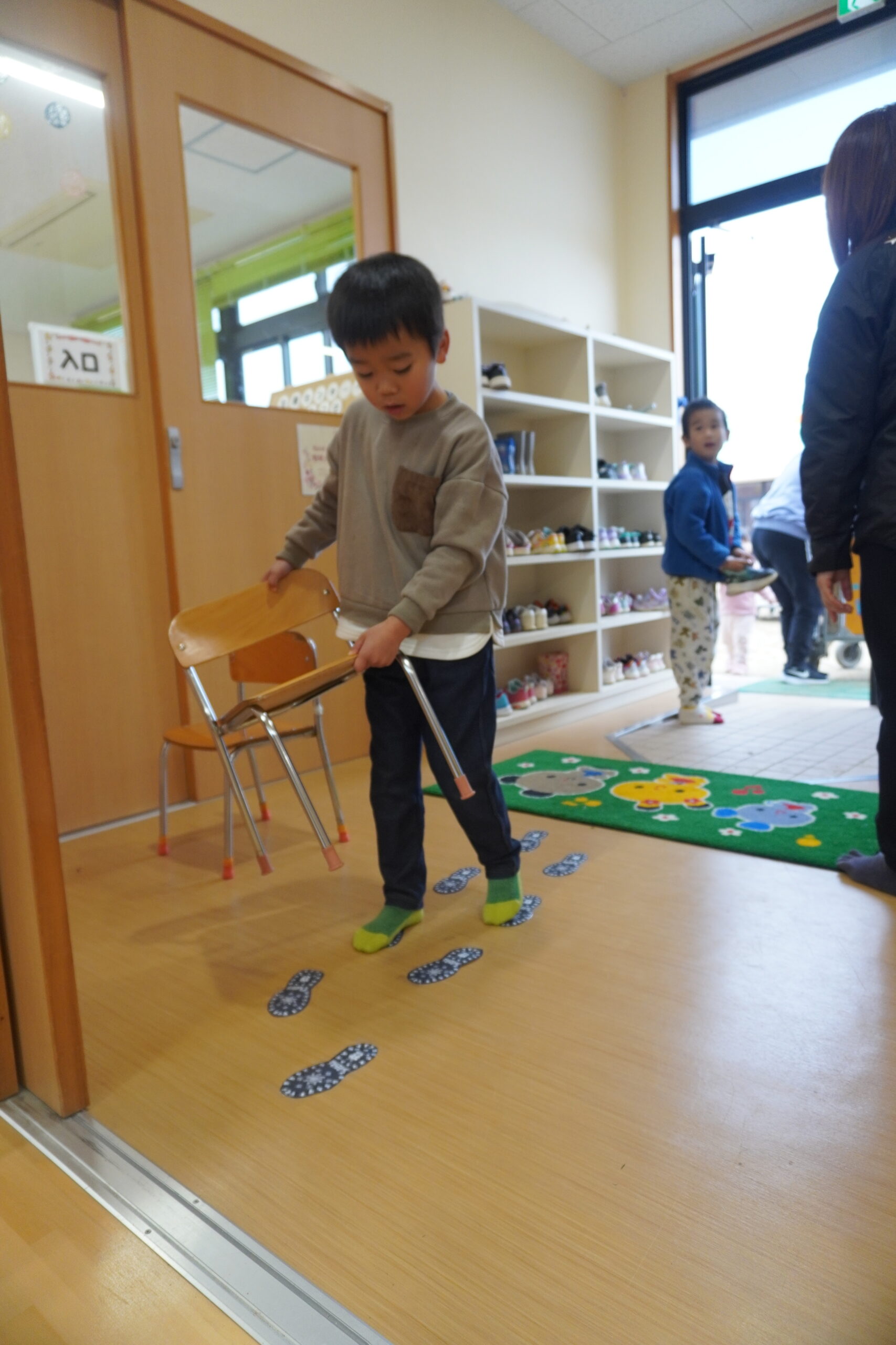 部屋の入口に足跡があるぞ・・・??さっそく気付く子どもたち。