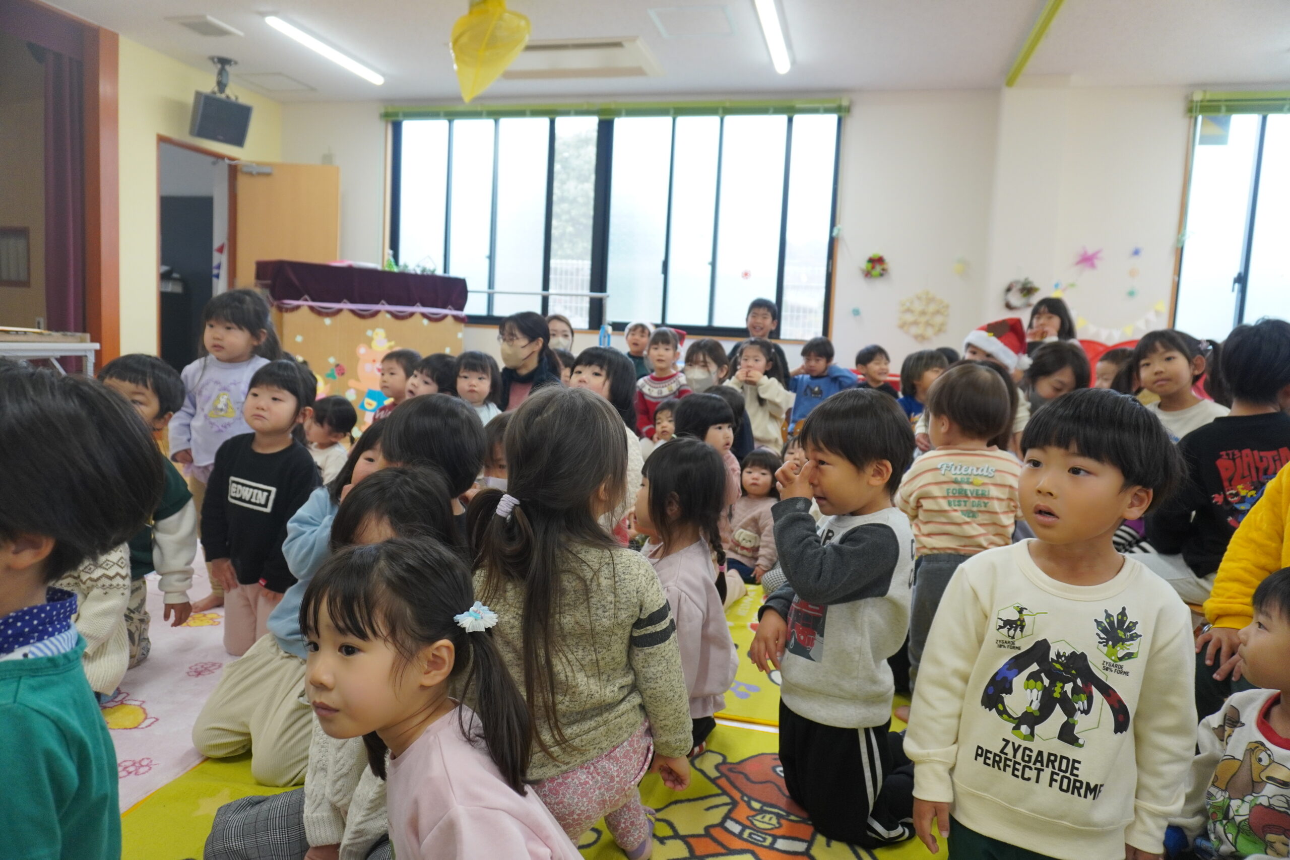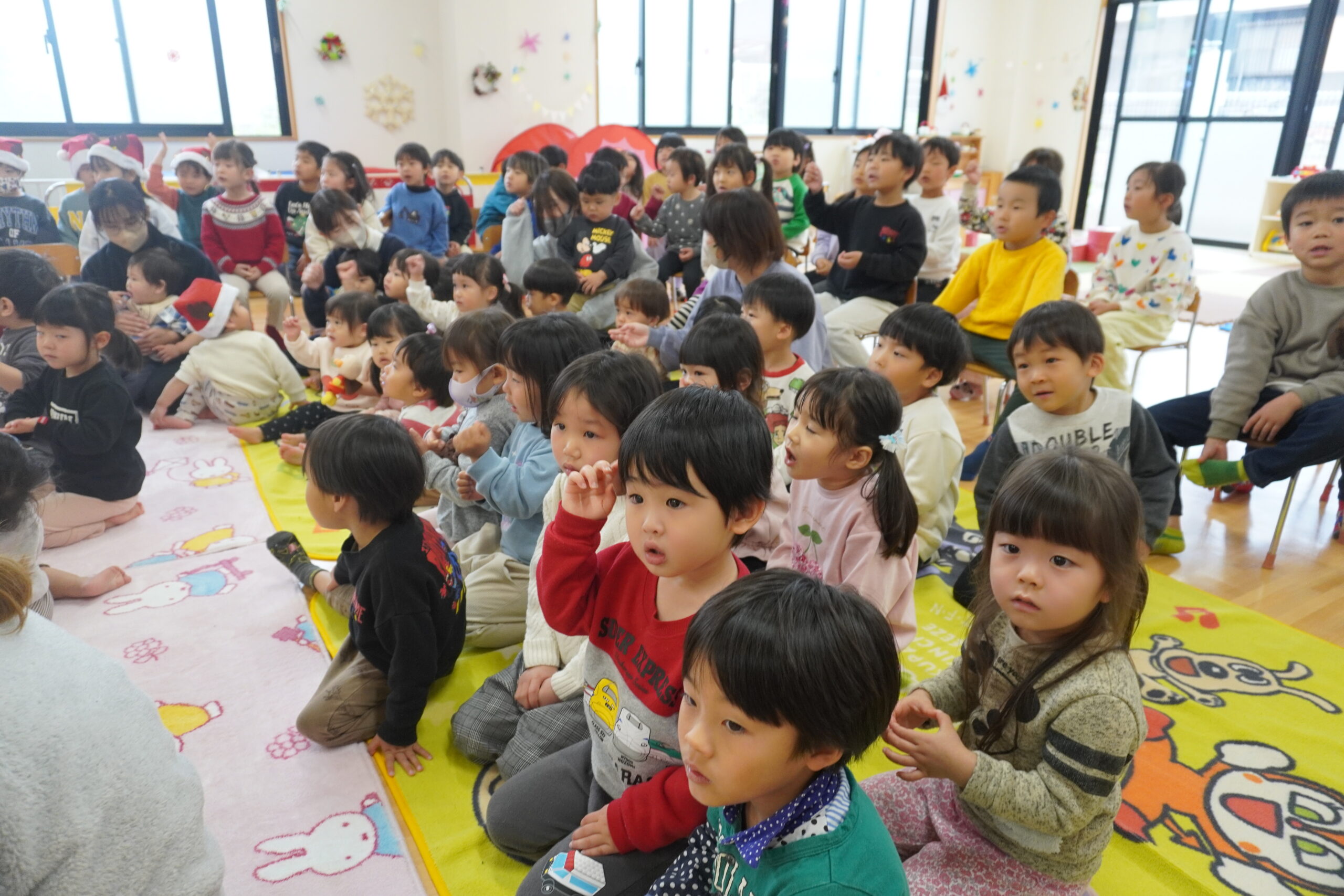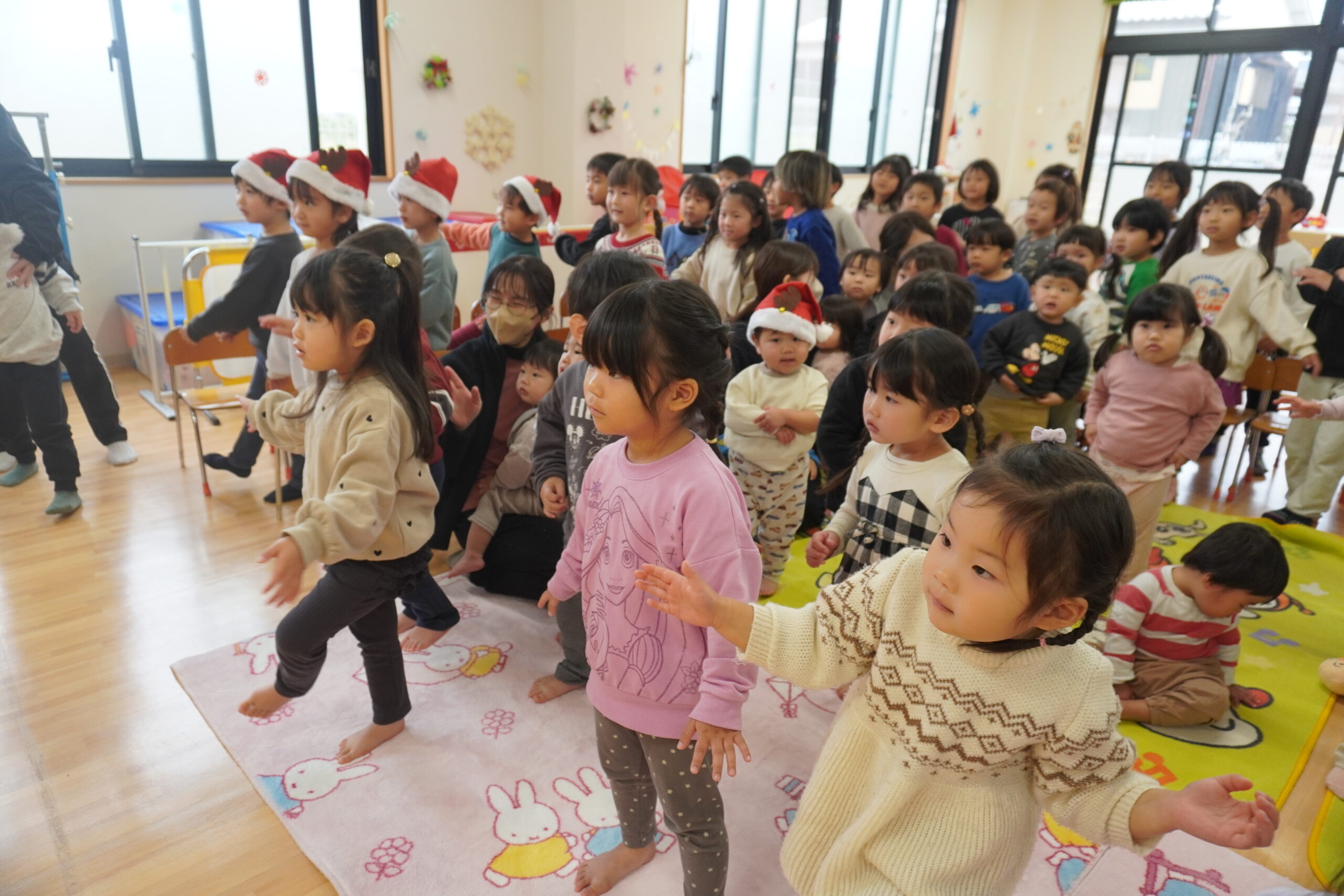 かわいいサンタの帽子を被った、12月生まれのお友だちのお祝いをみんなでしました✨