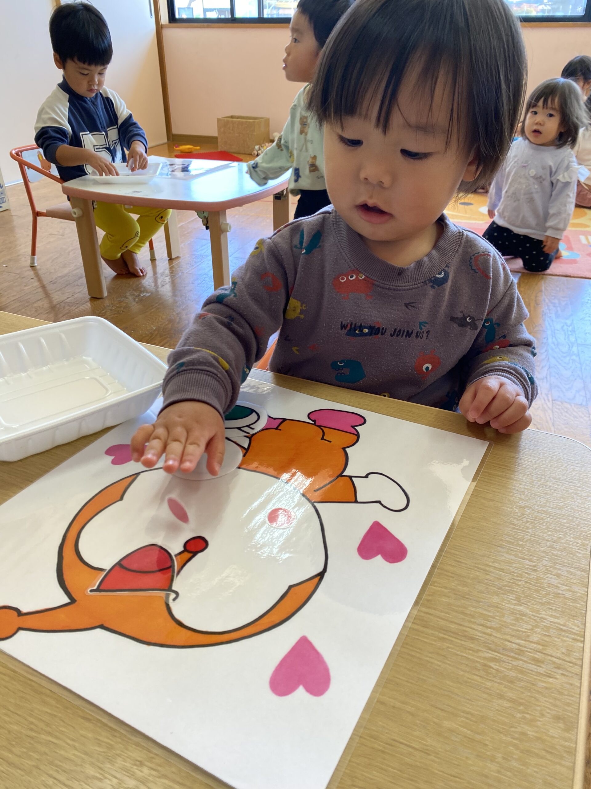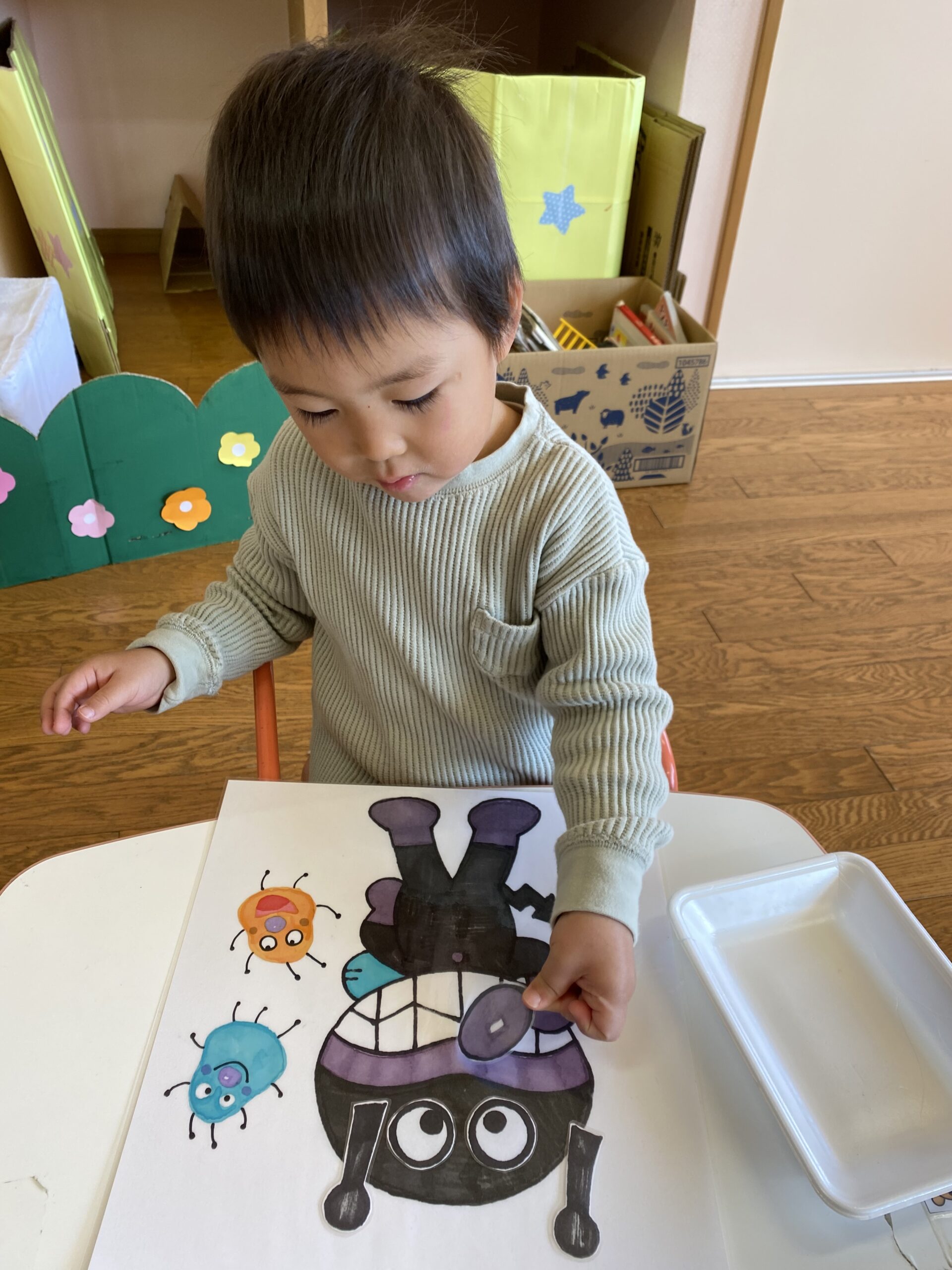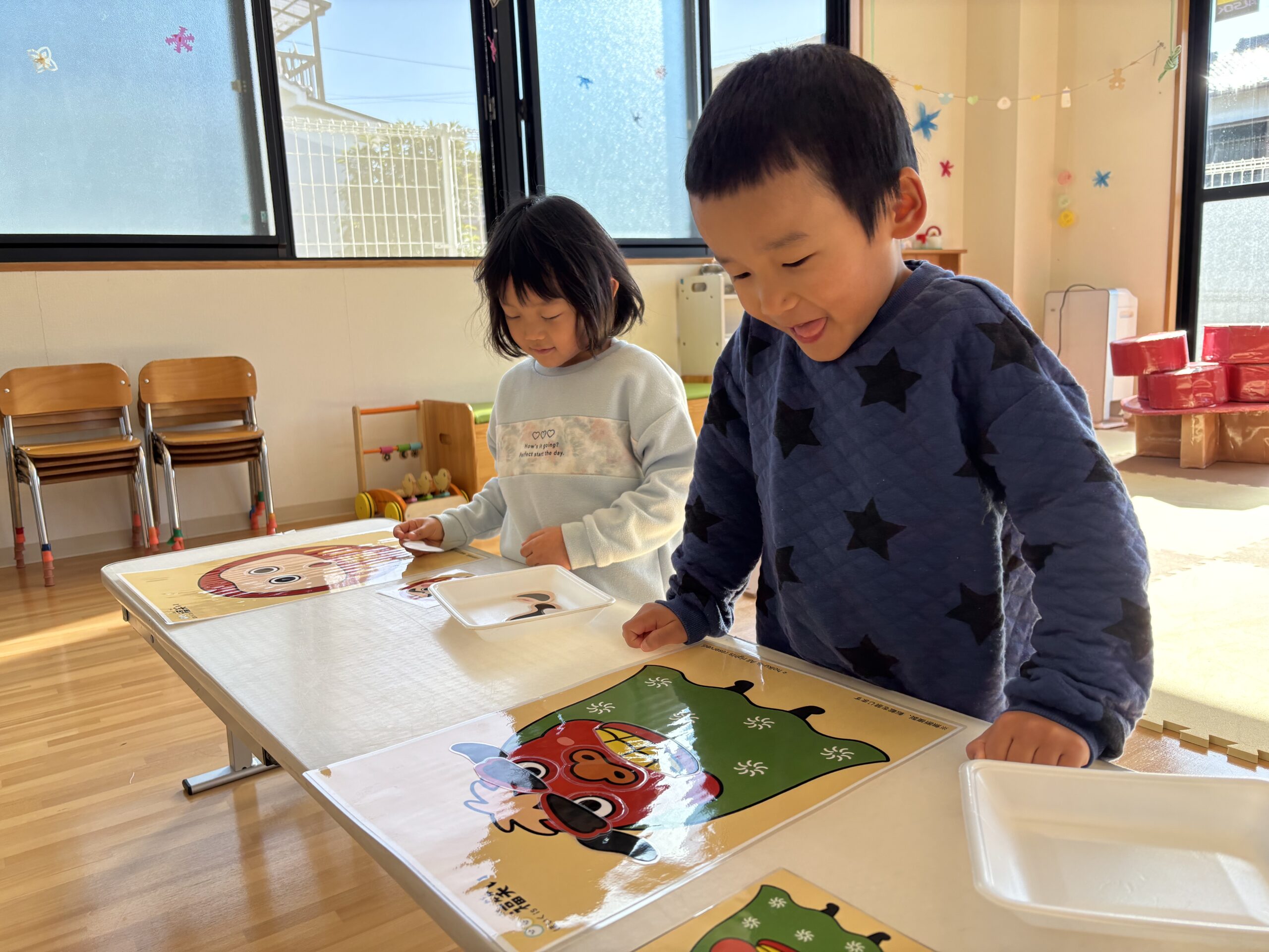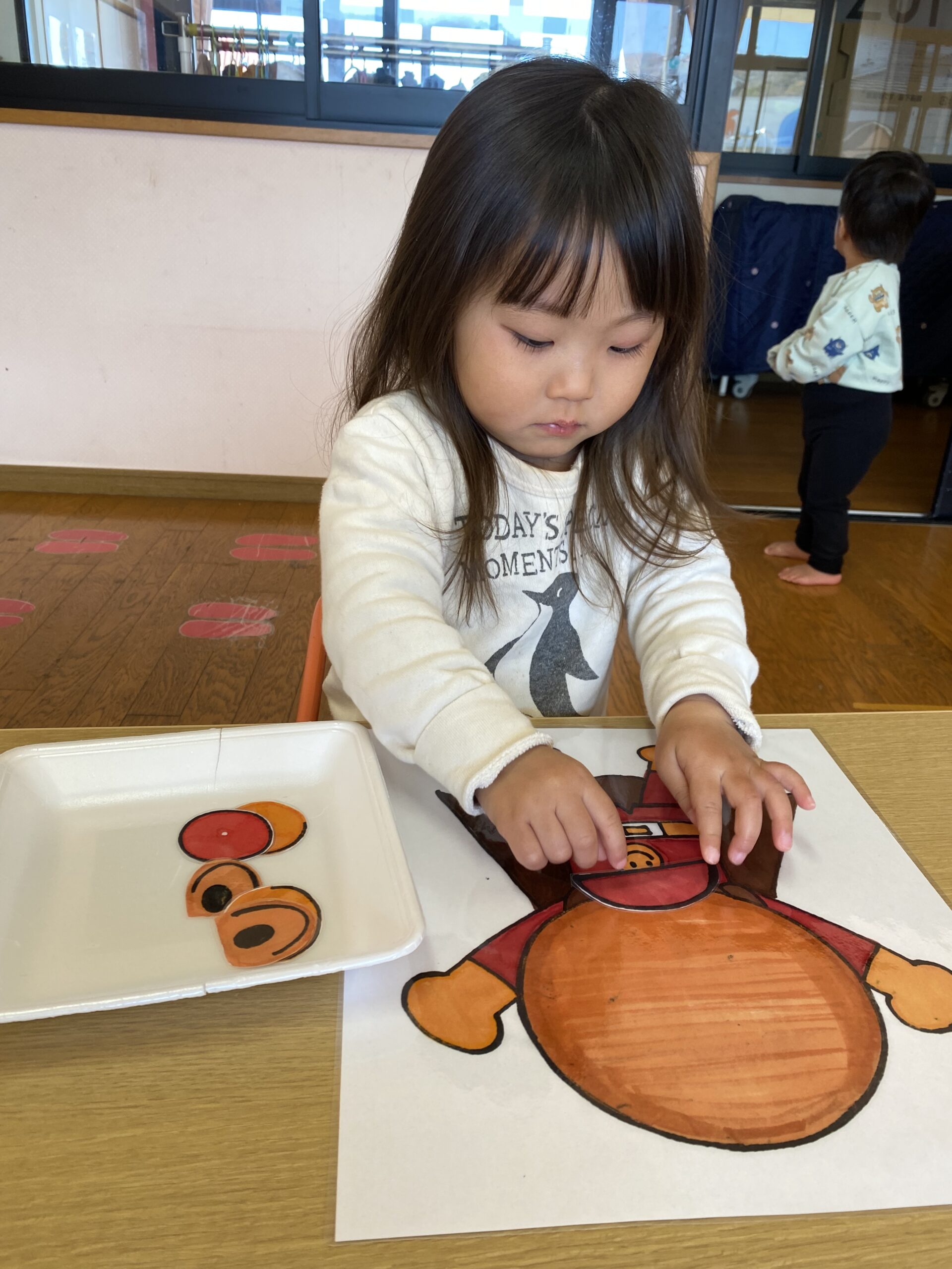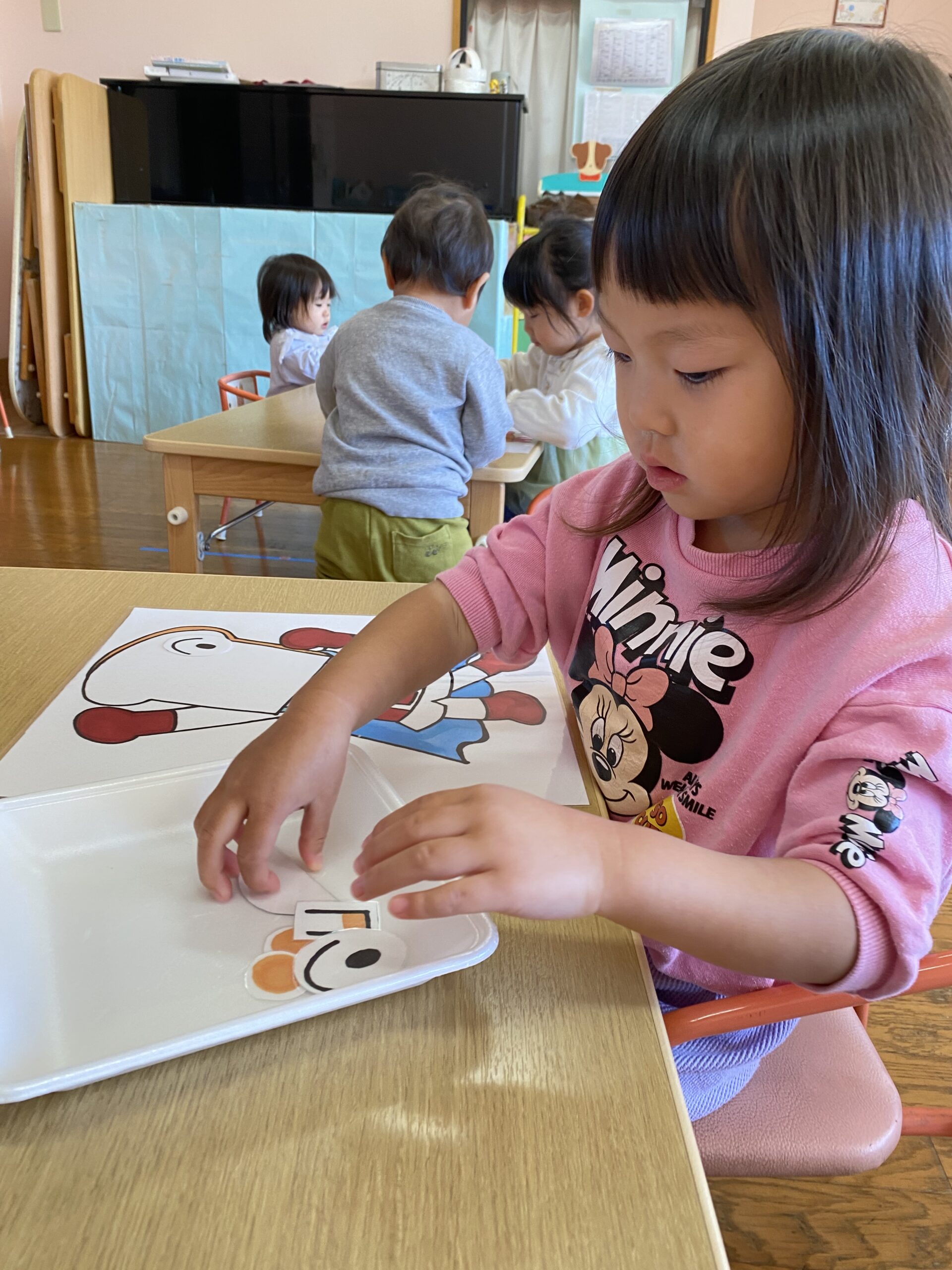 「お口はどこかな~?」「これはお鼻かな?」と保育士とやり取りをしながら挑戦しています。