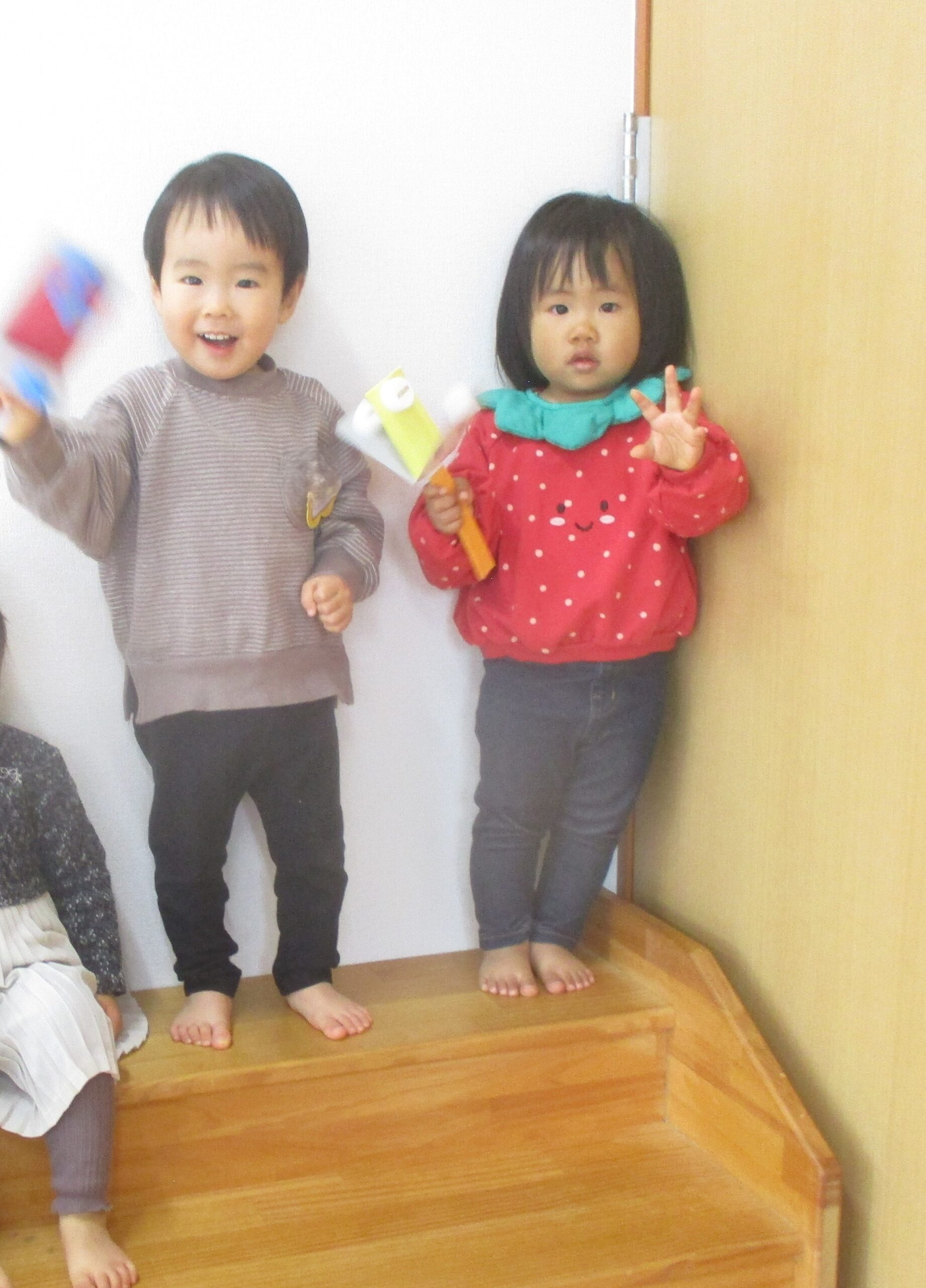 布を頭にのせて獅子舞になりきり、のっしのっし歩いてみたり、 布を高くあげてふわふわ飛ぶ“凧揚げ”を表現してみたり😊