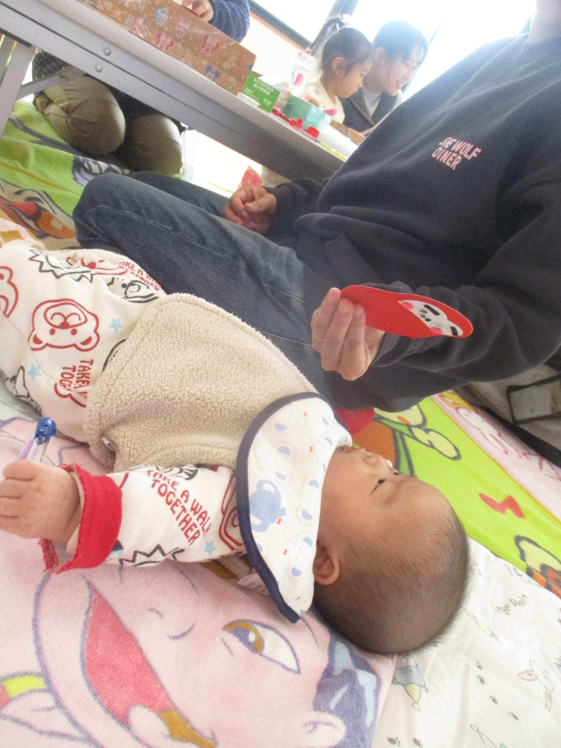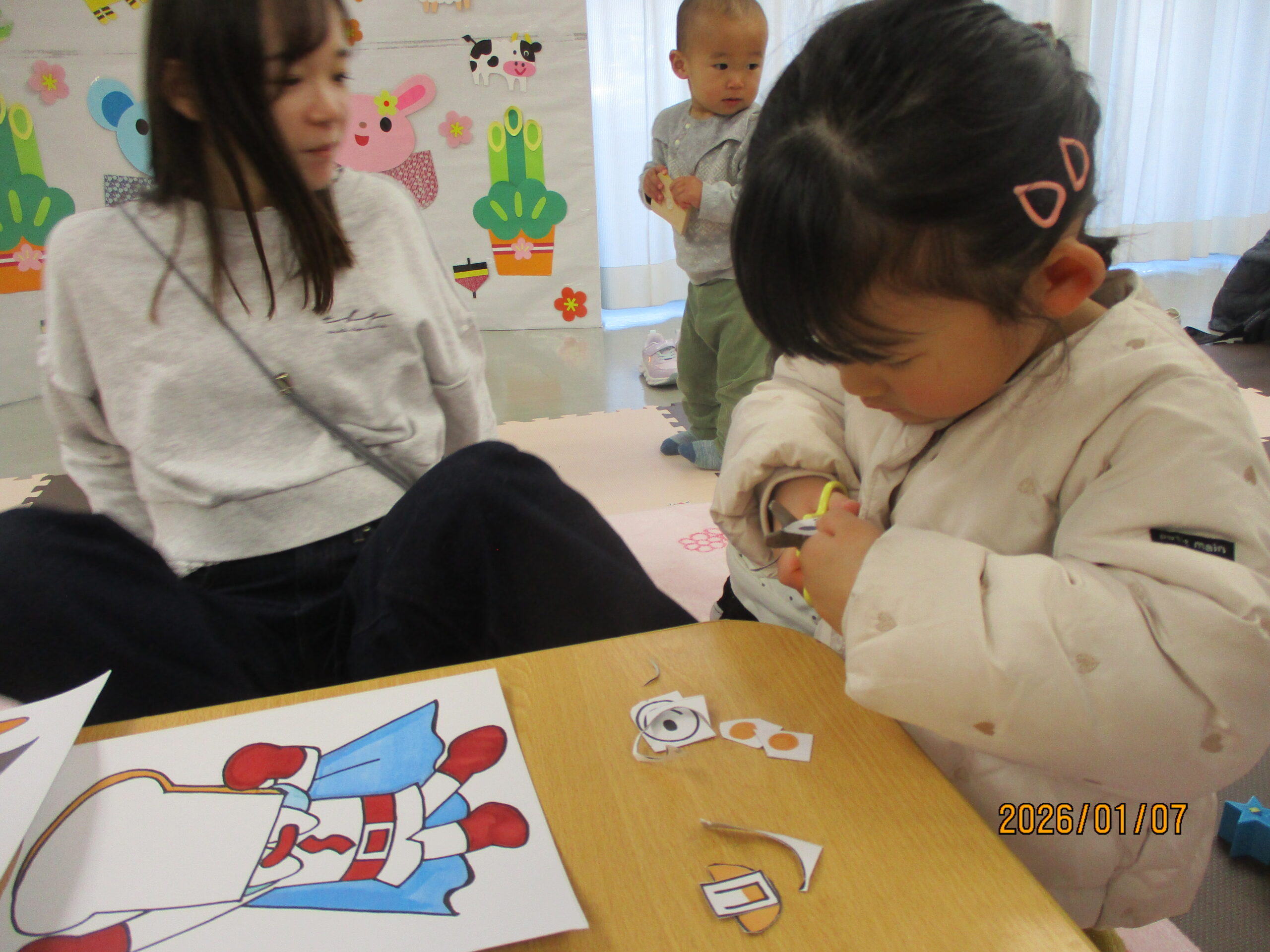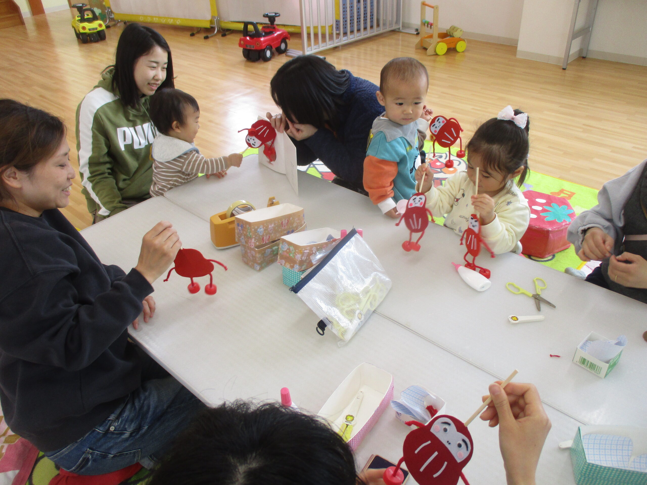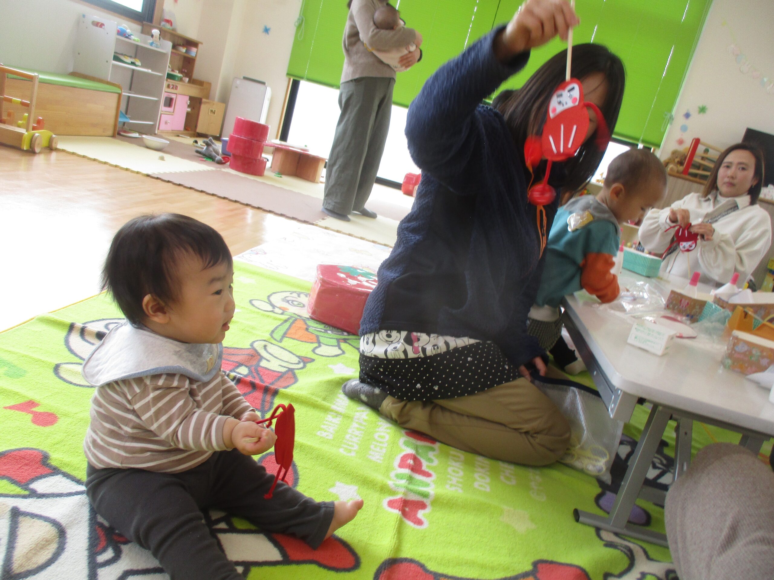 まだ目を隠して遊ぶ福笑いは少し難しいので、お母さんたちと一緒に 「目はどこかな?」「口はここかな?」とパーツを確認しながら楽しんでくれました😊