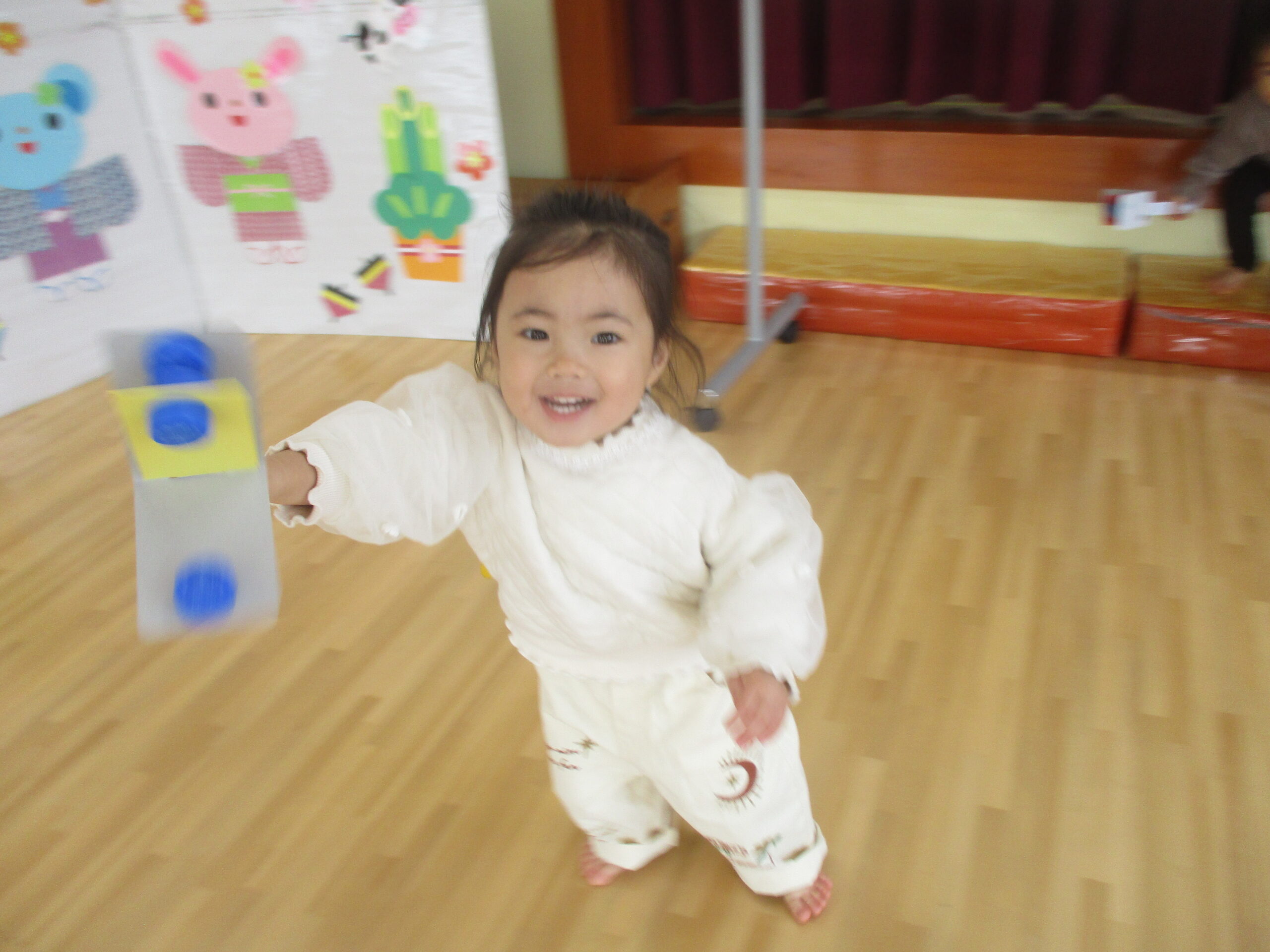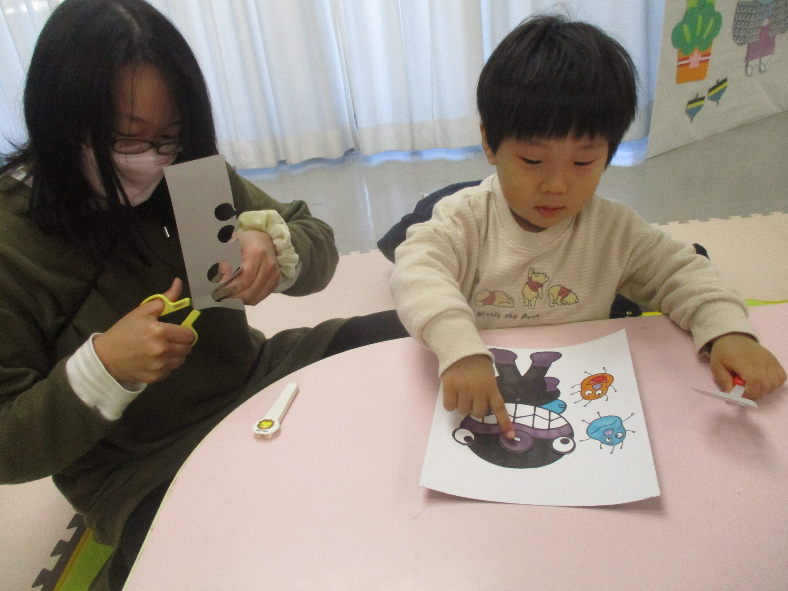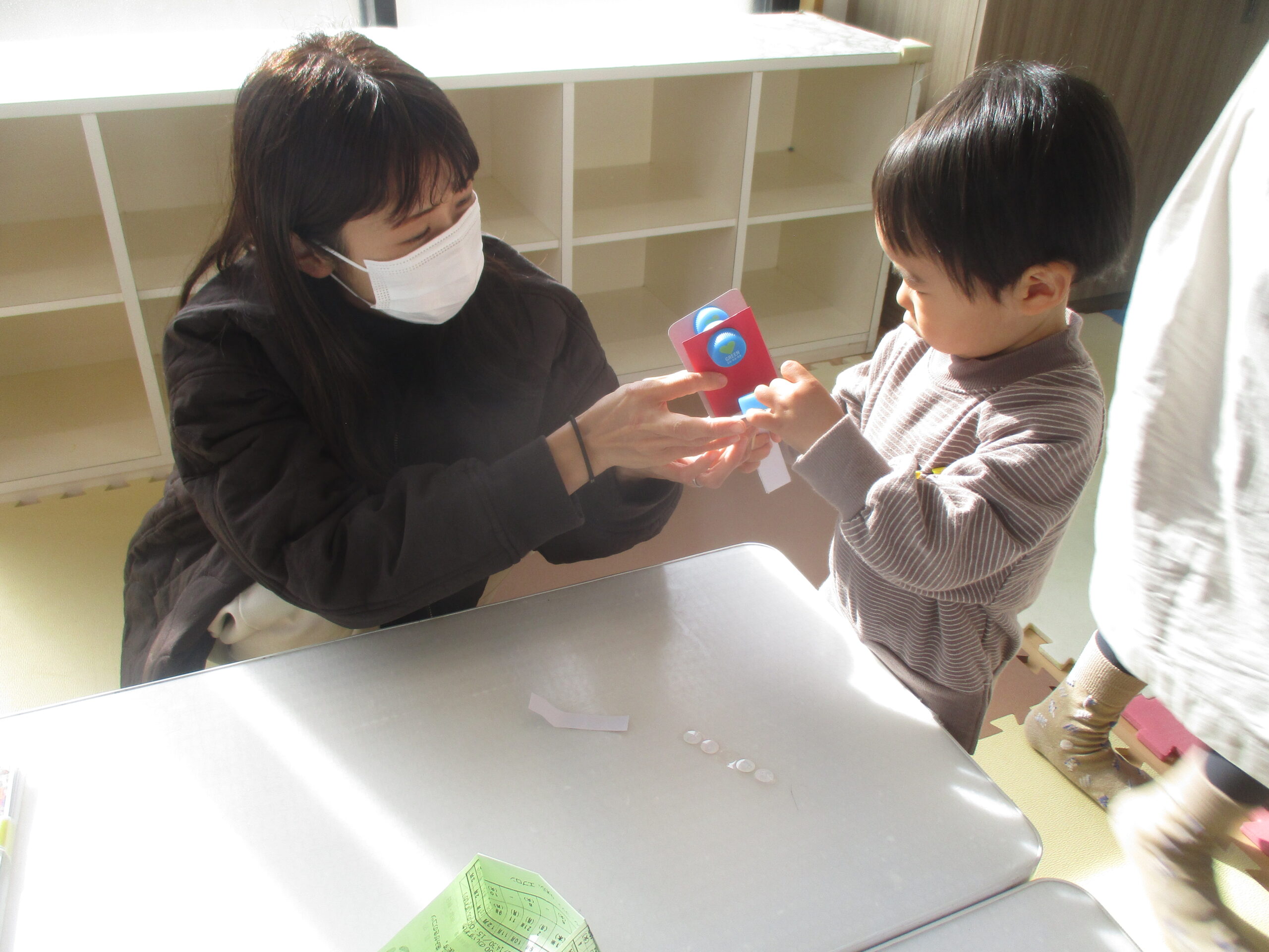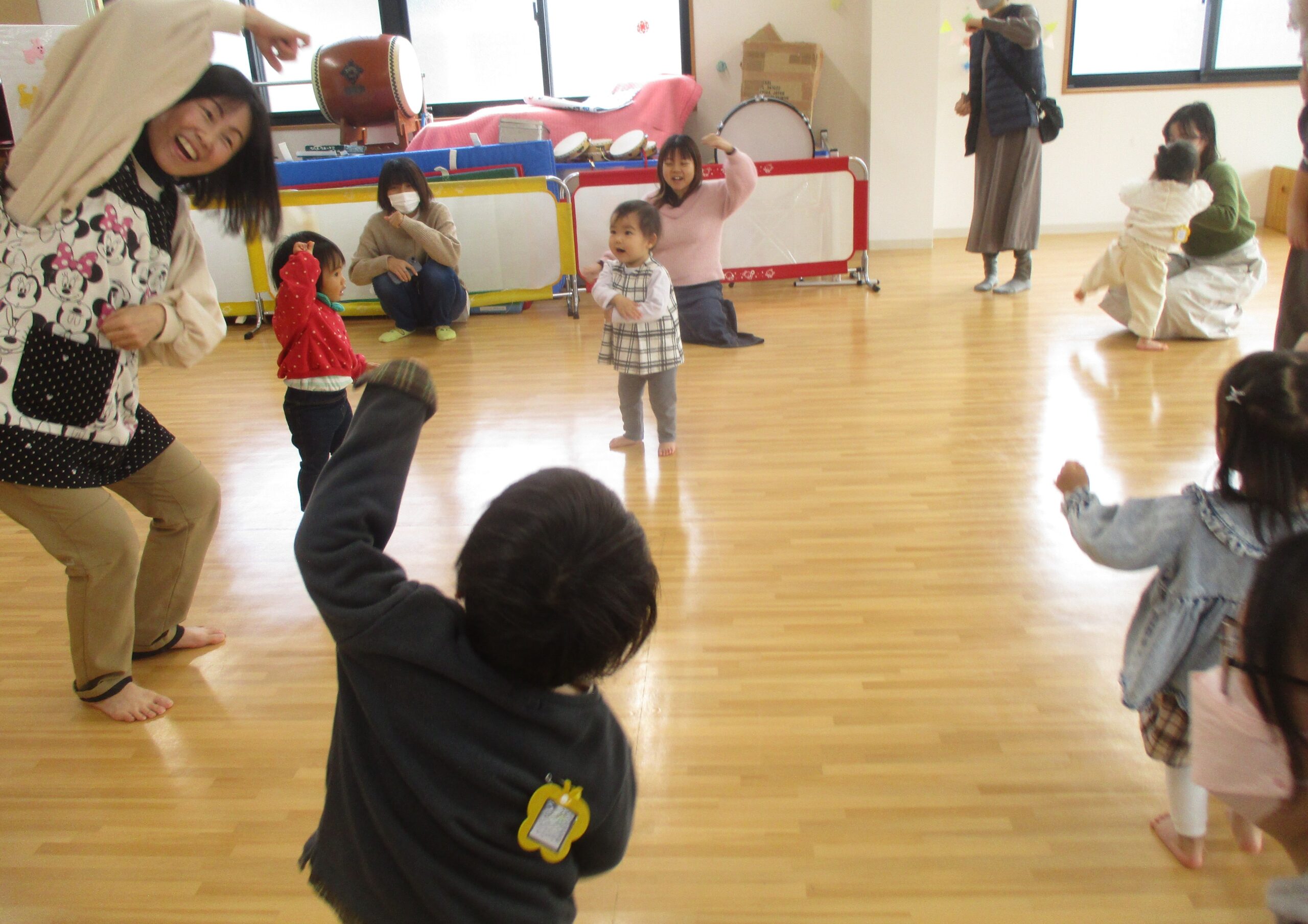 まだ目を隠して遊ぶ福笑いは少し難しいので、お母さんたちと一緒に 「目はどこかな?」「口はここかな?」とパーツを確認しながら楽しんでくれました😊