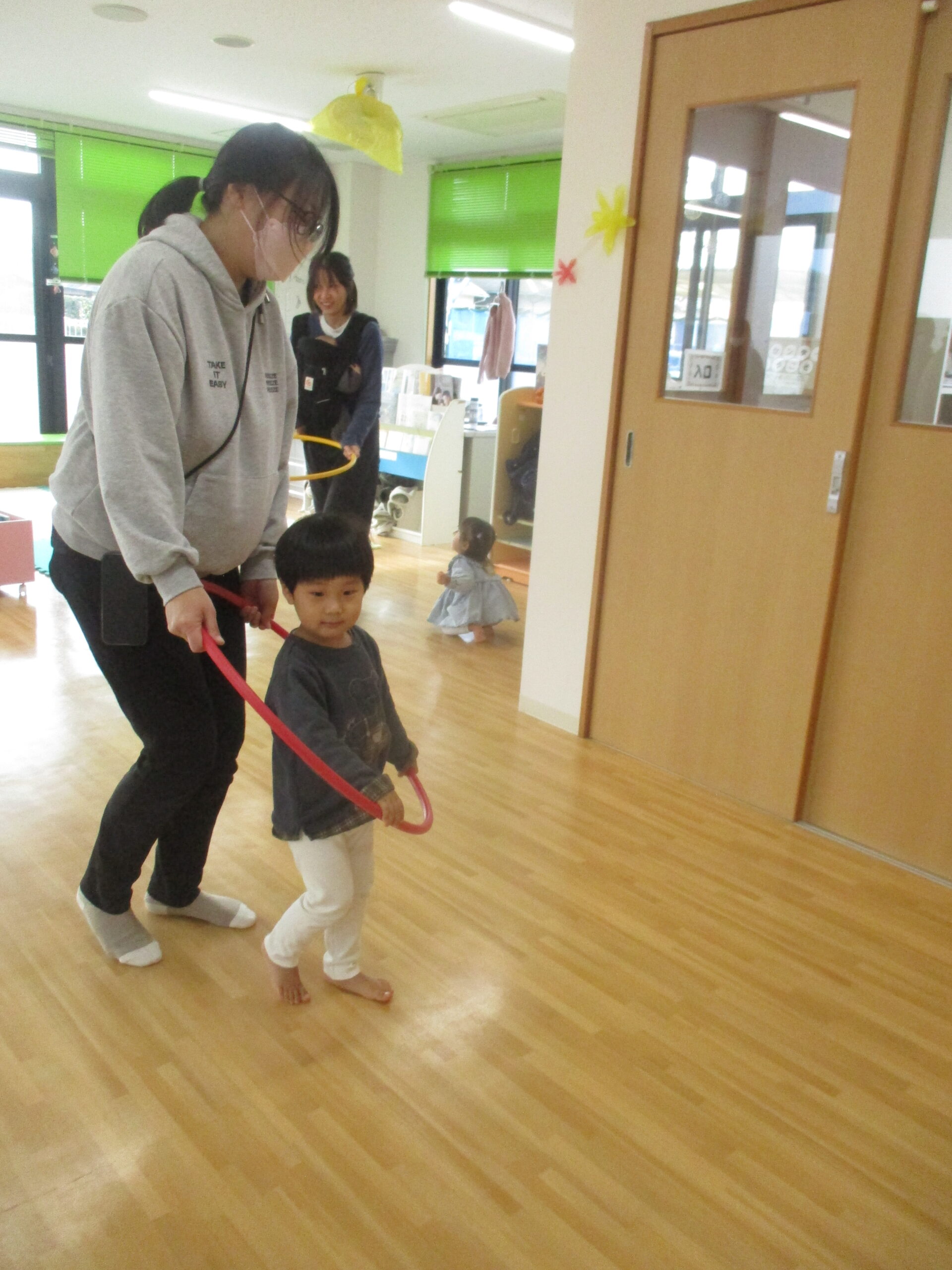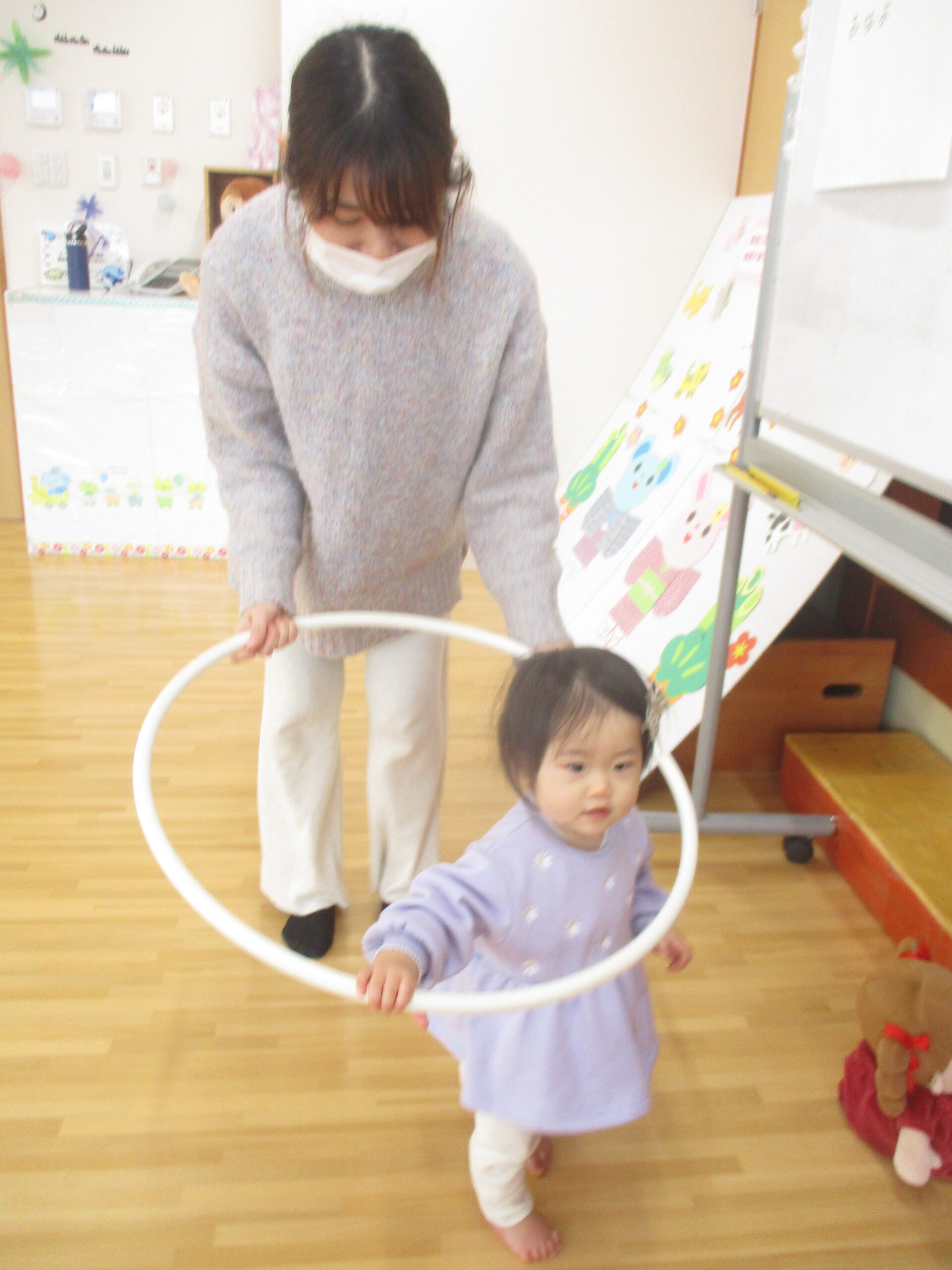 リズムに合わせてフープを左右にゆらゆら揺らしたり、スピードを変えてみたり。 「ガタンゴトン」のイメージで、電車になりきって体全体を使って表現します😊