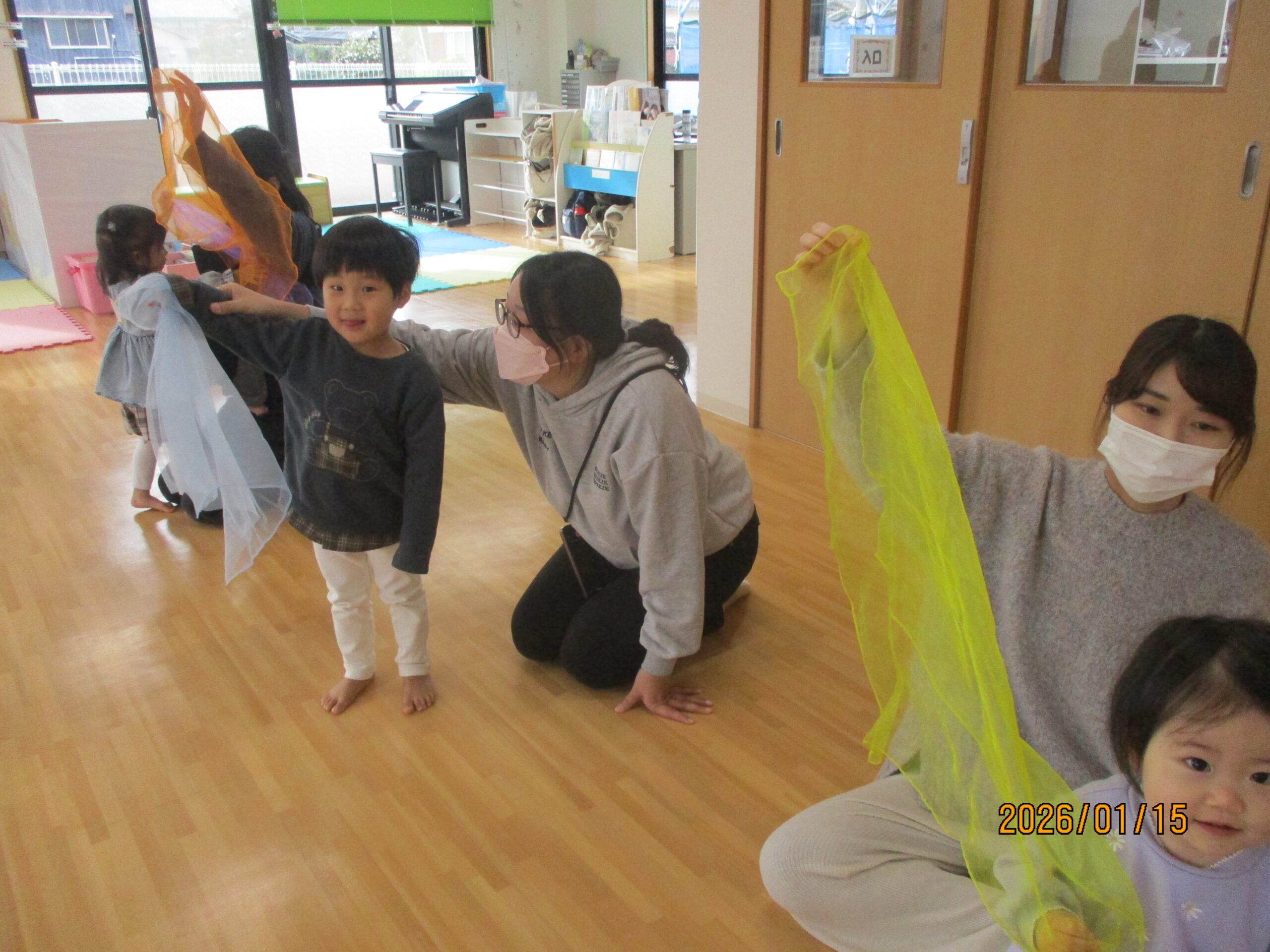 今月は1月ということで、お正月にまつわる遊びをシフォン布に取り入れて楽しみました🎍✨
