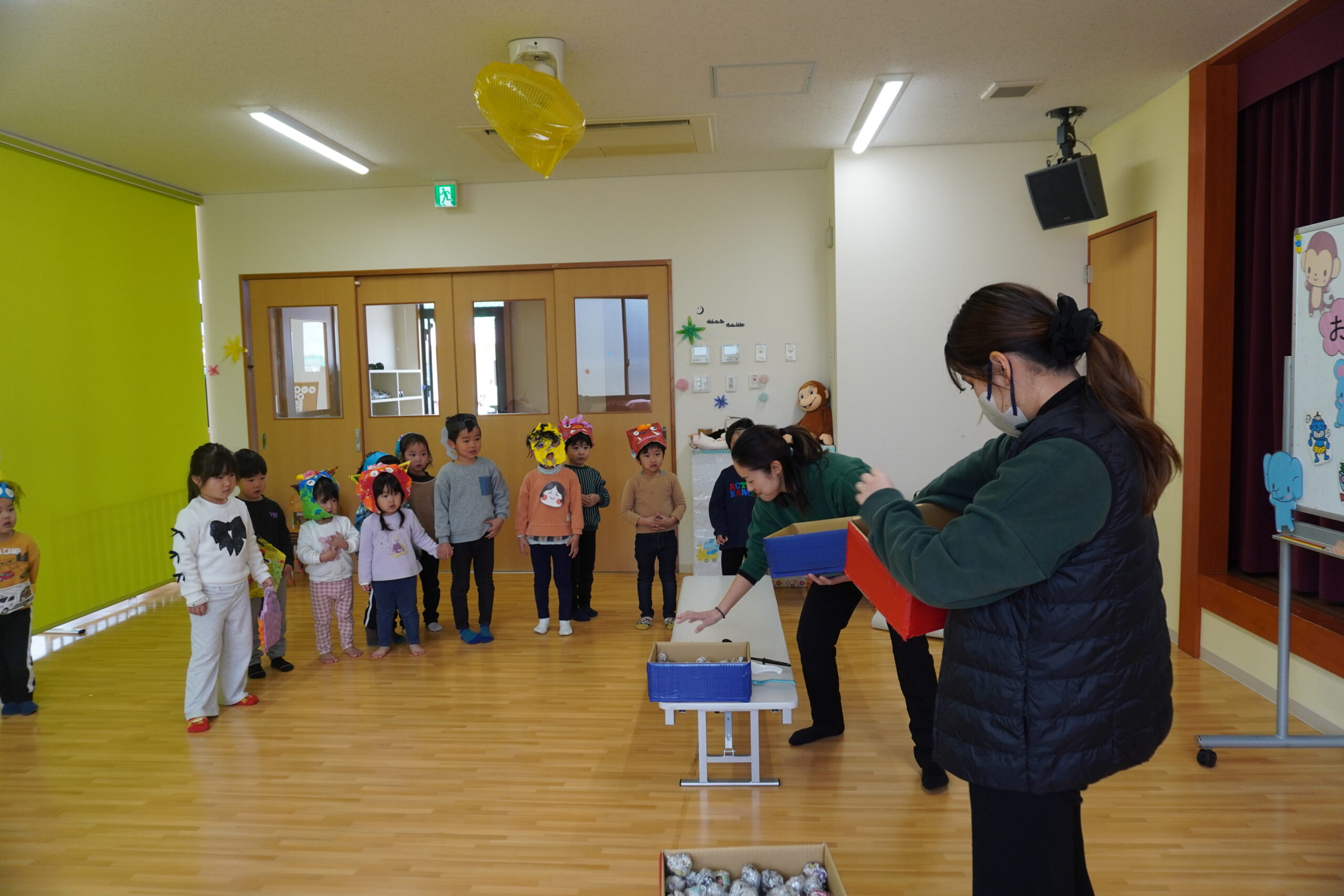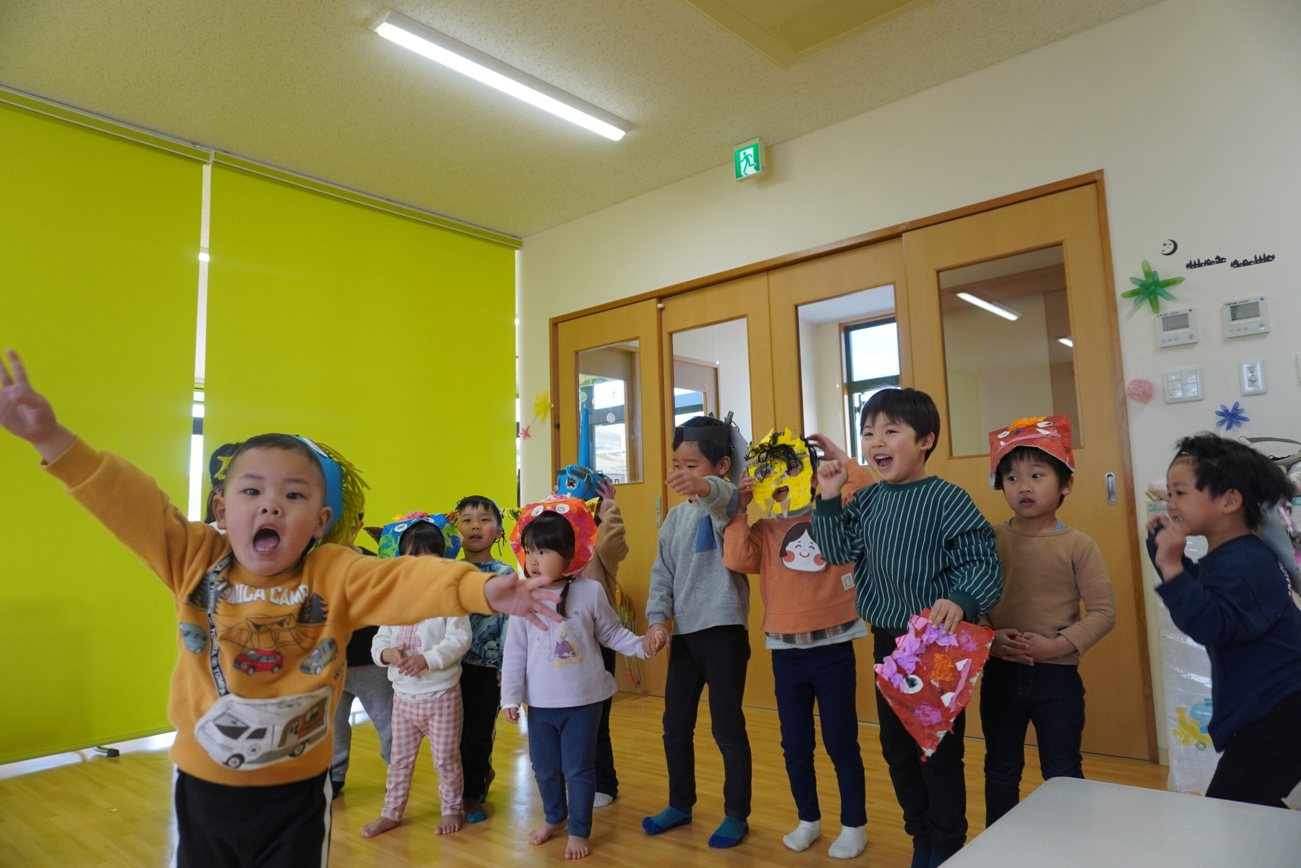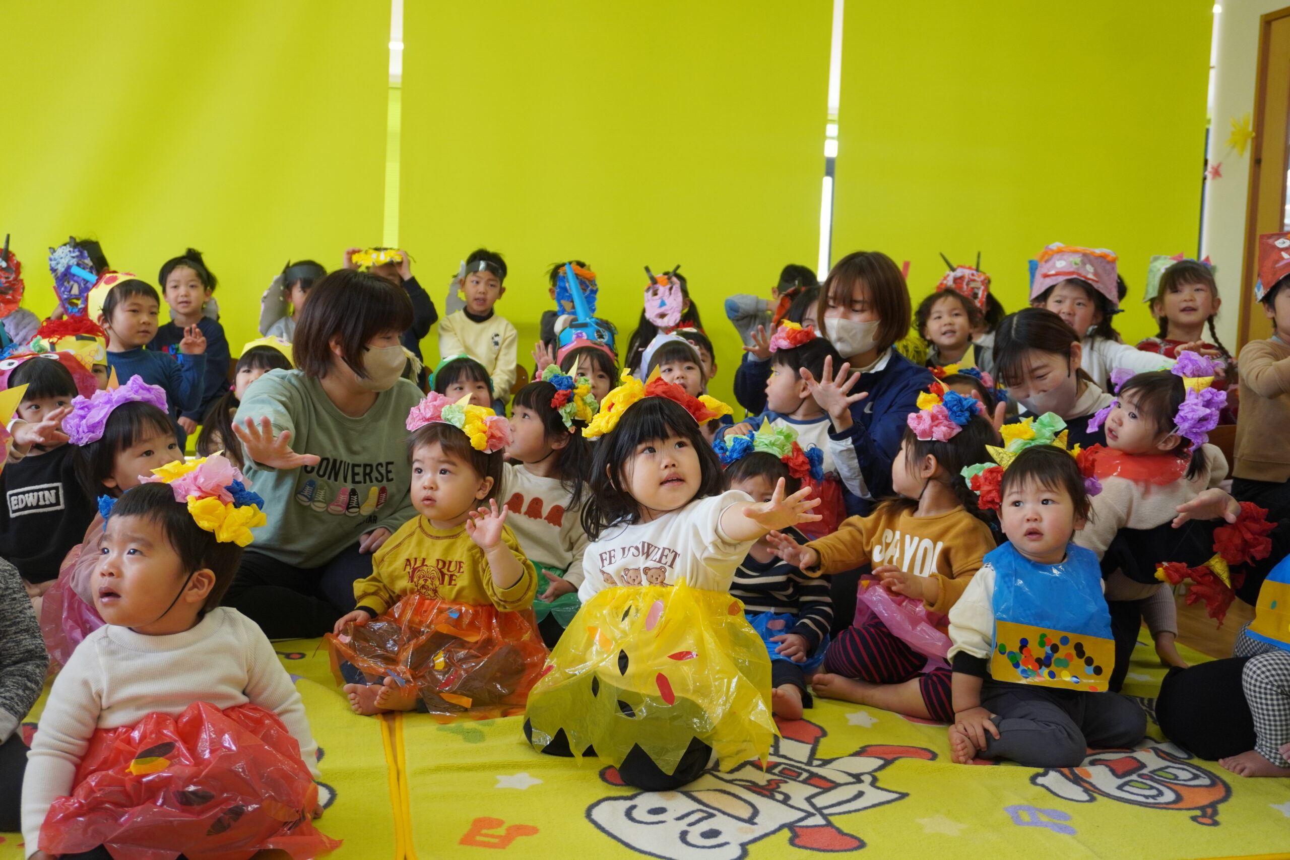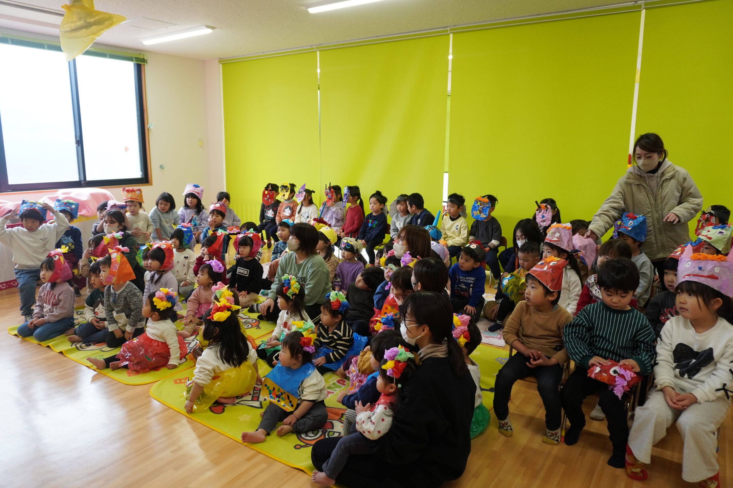 集会では節分についてのお話をしたり、歌ったり踊ったりして楽しみました。