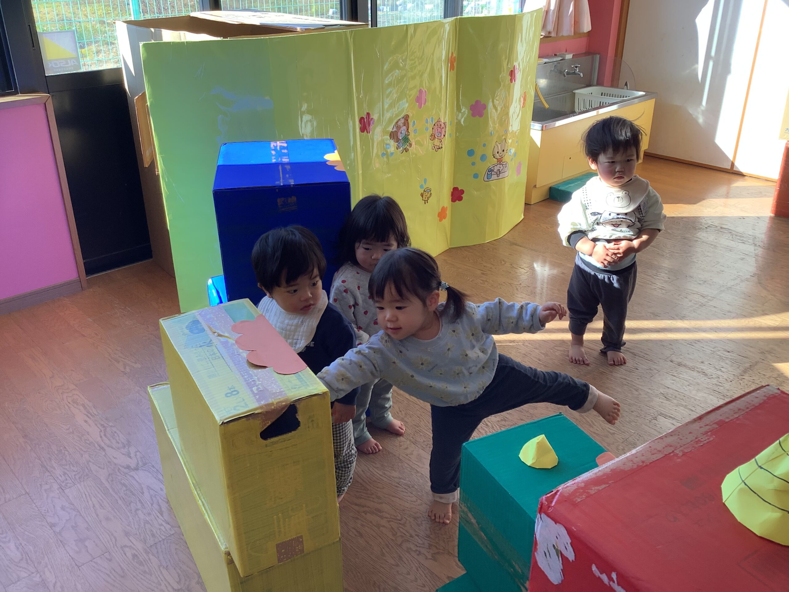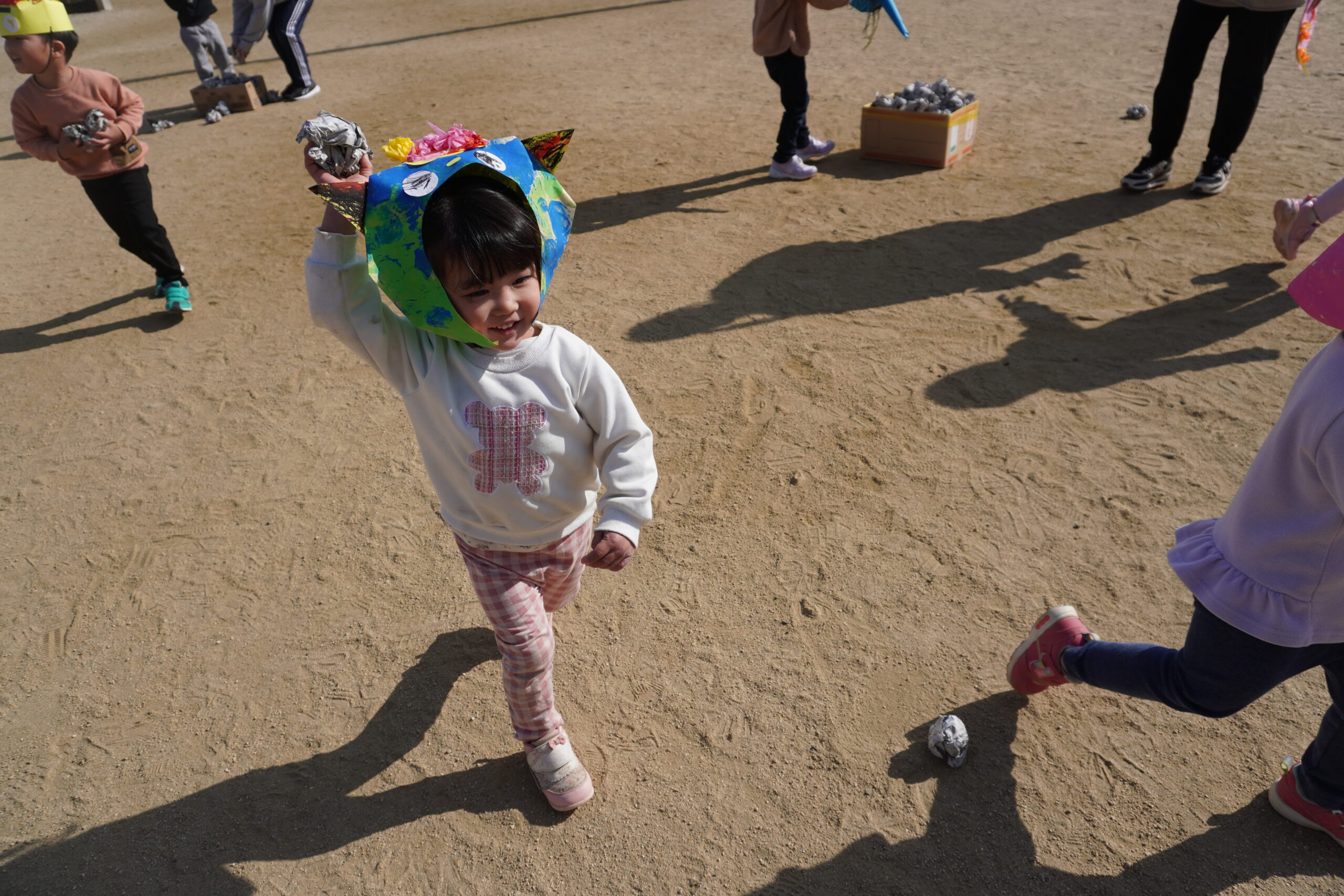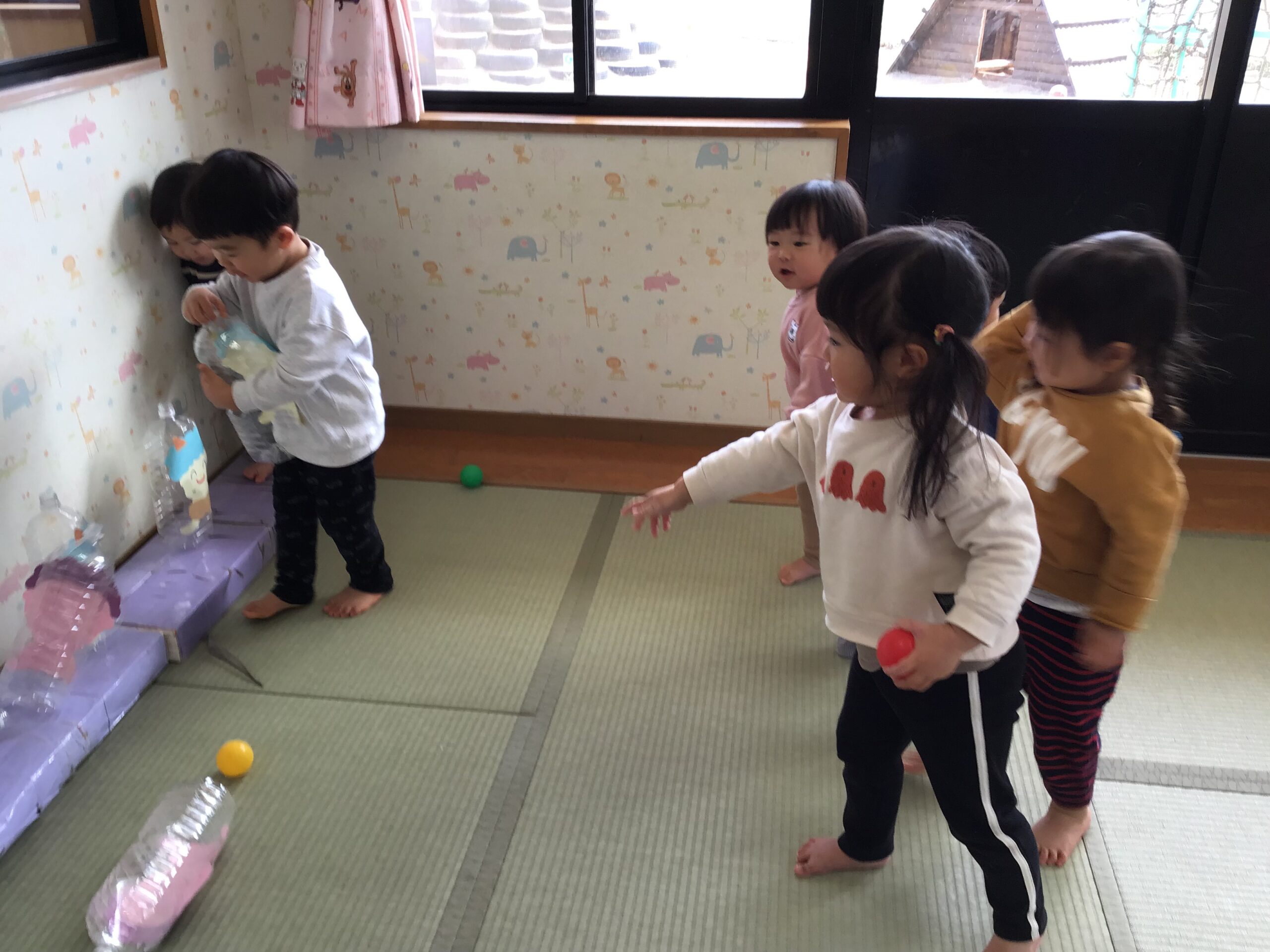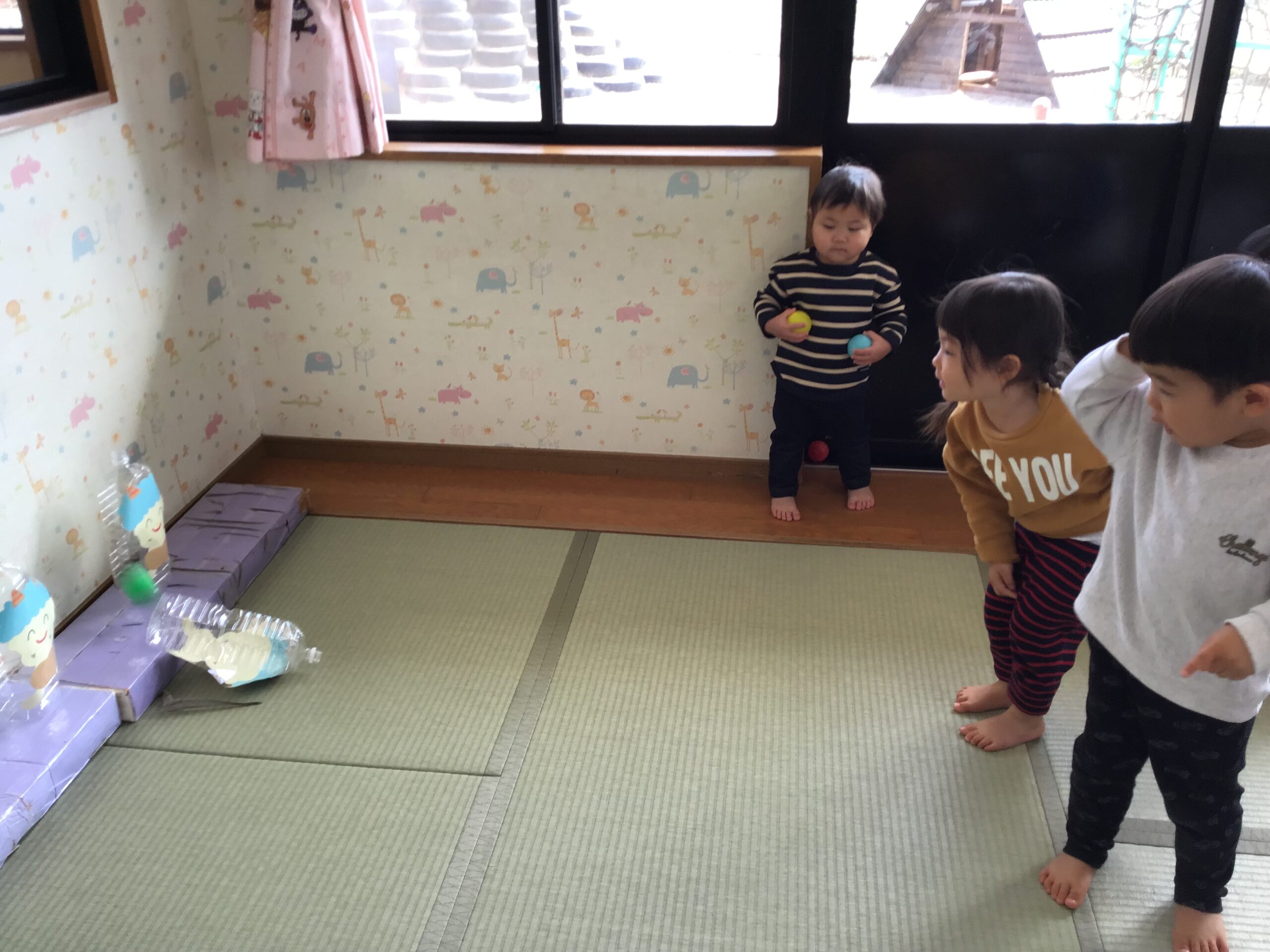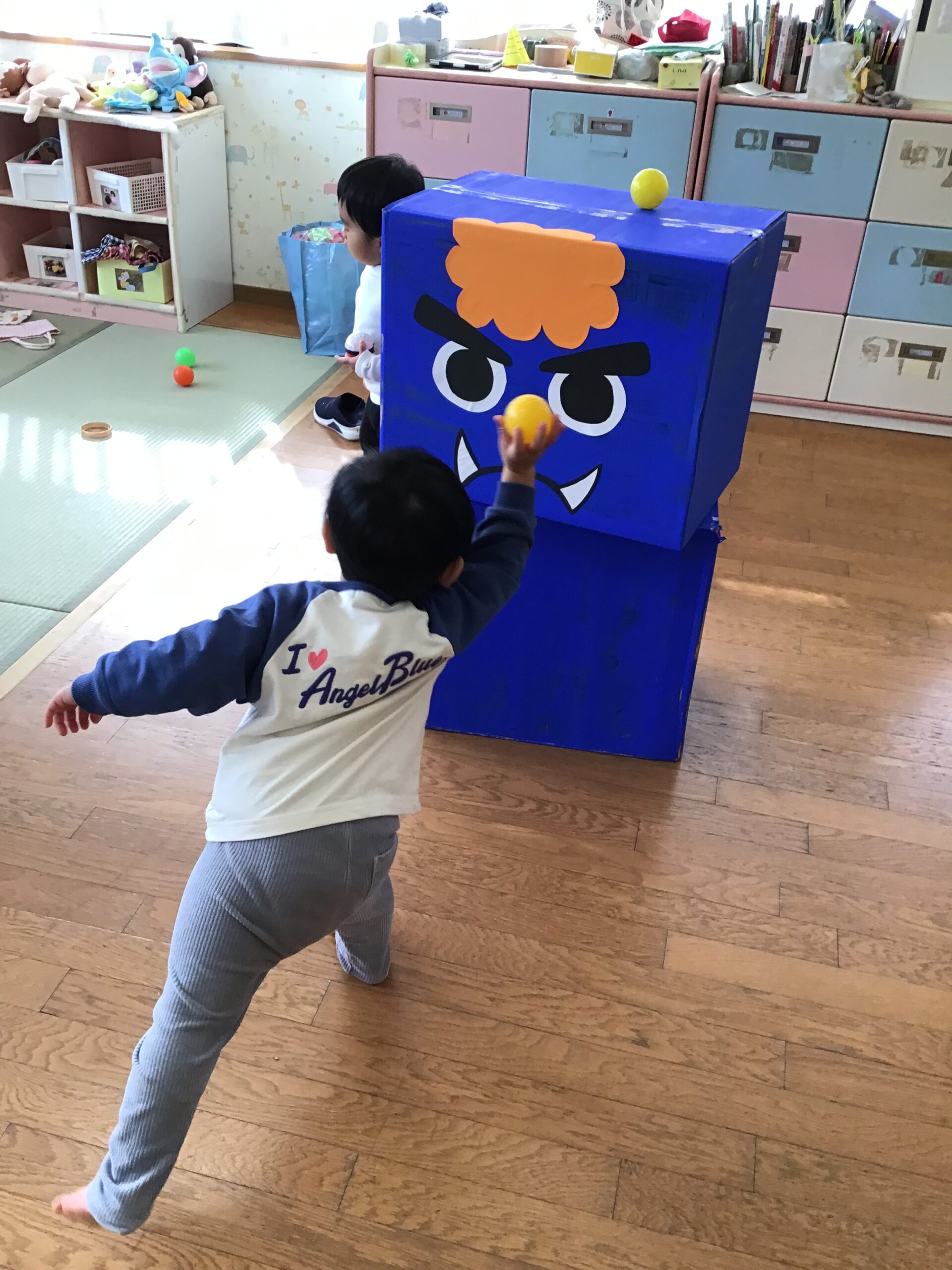 ペットボトルや段ボールの鬼をボールを使ったり、体を使ったりして倒しました。