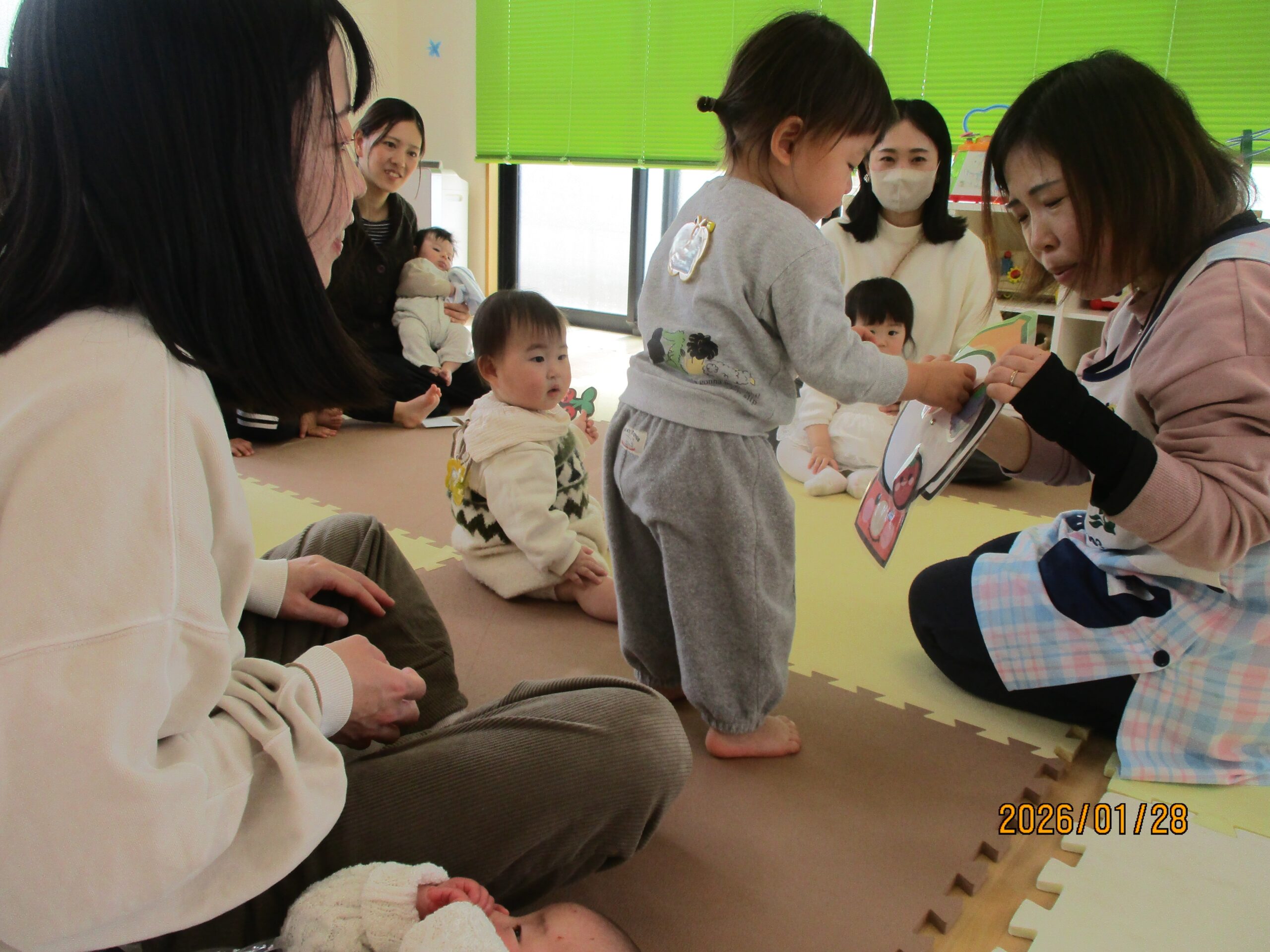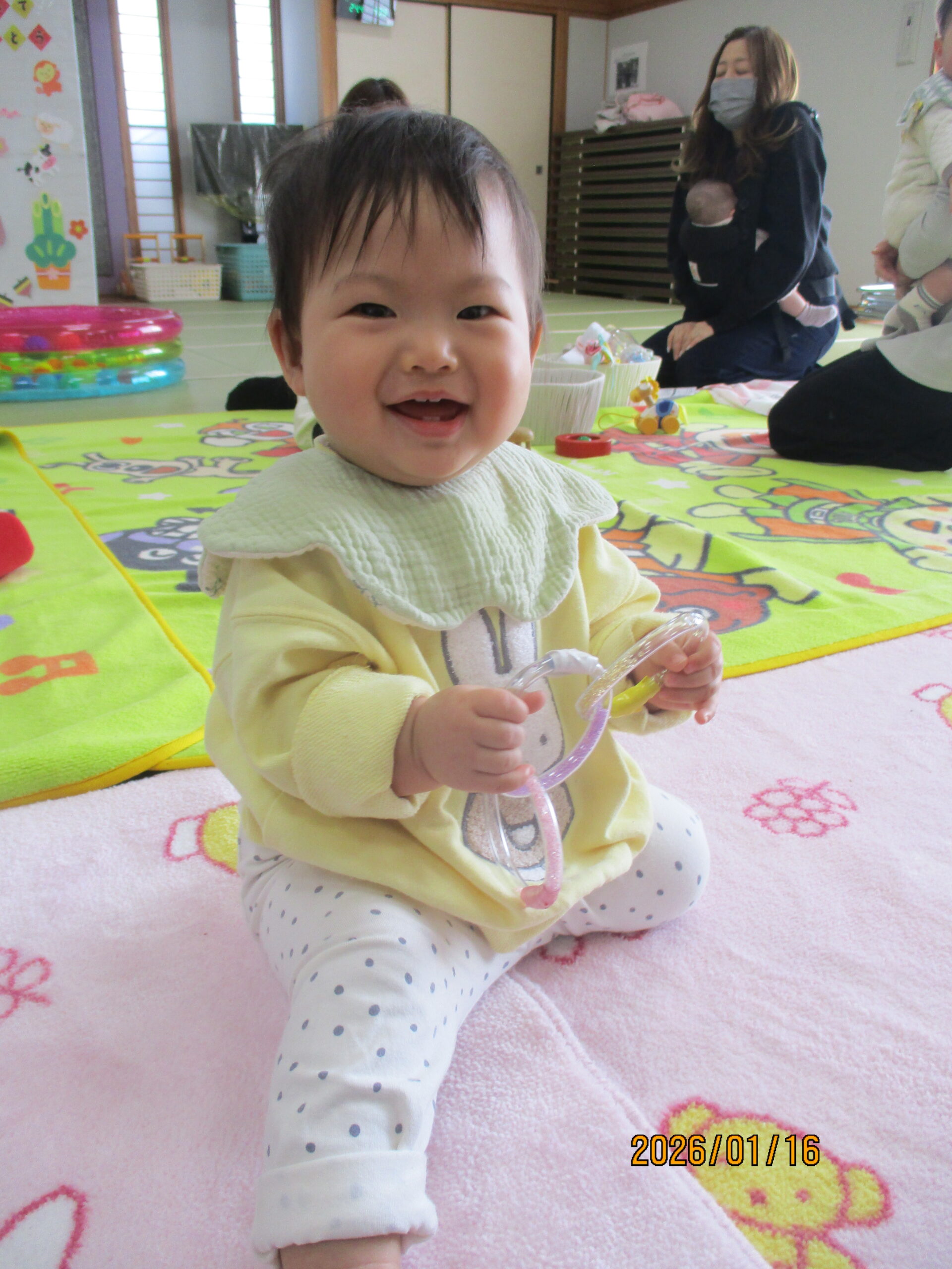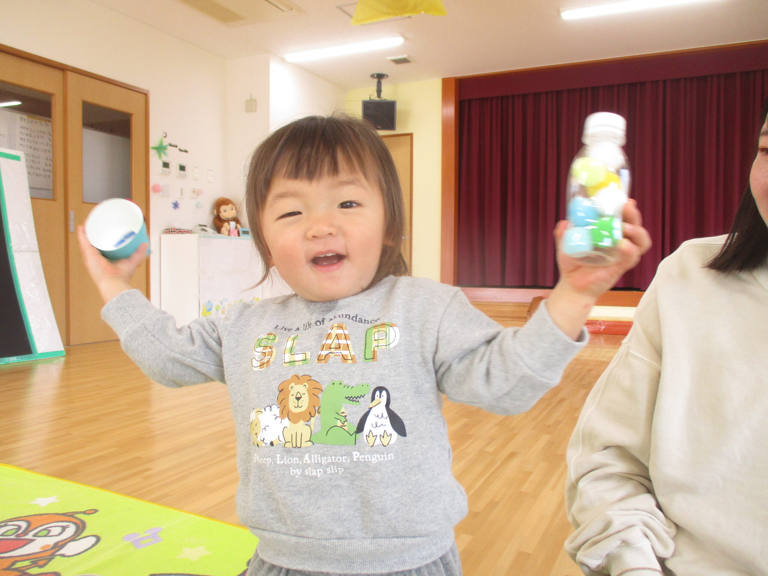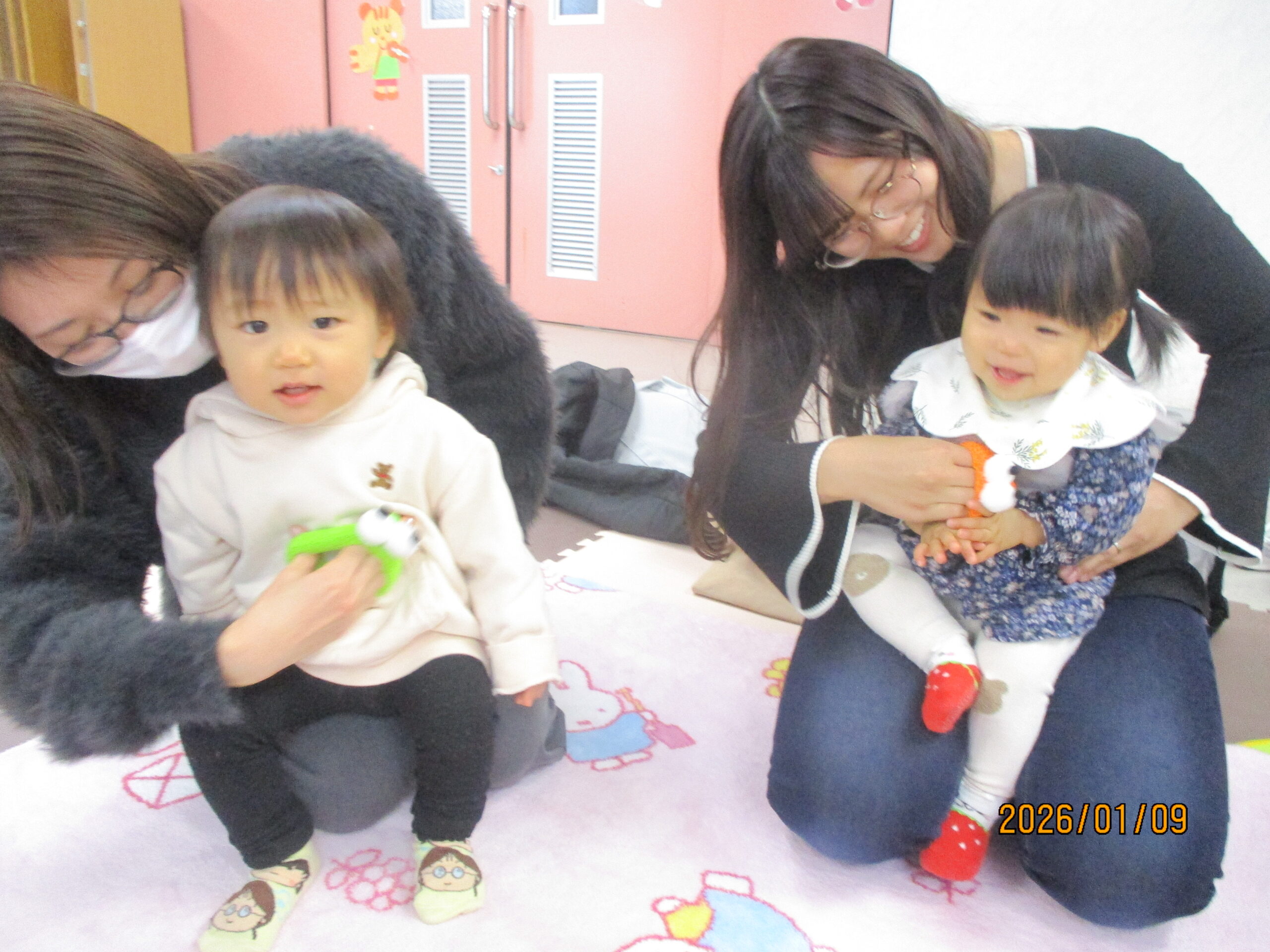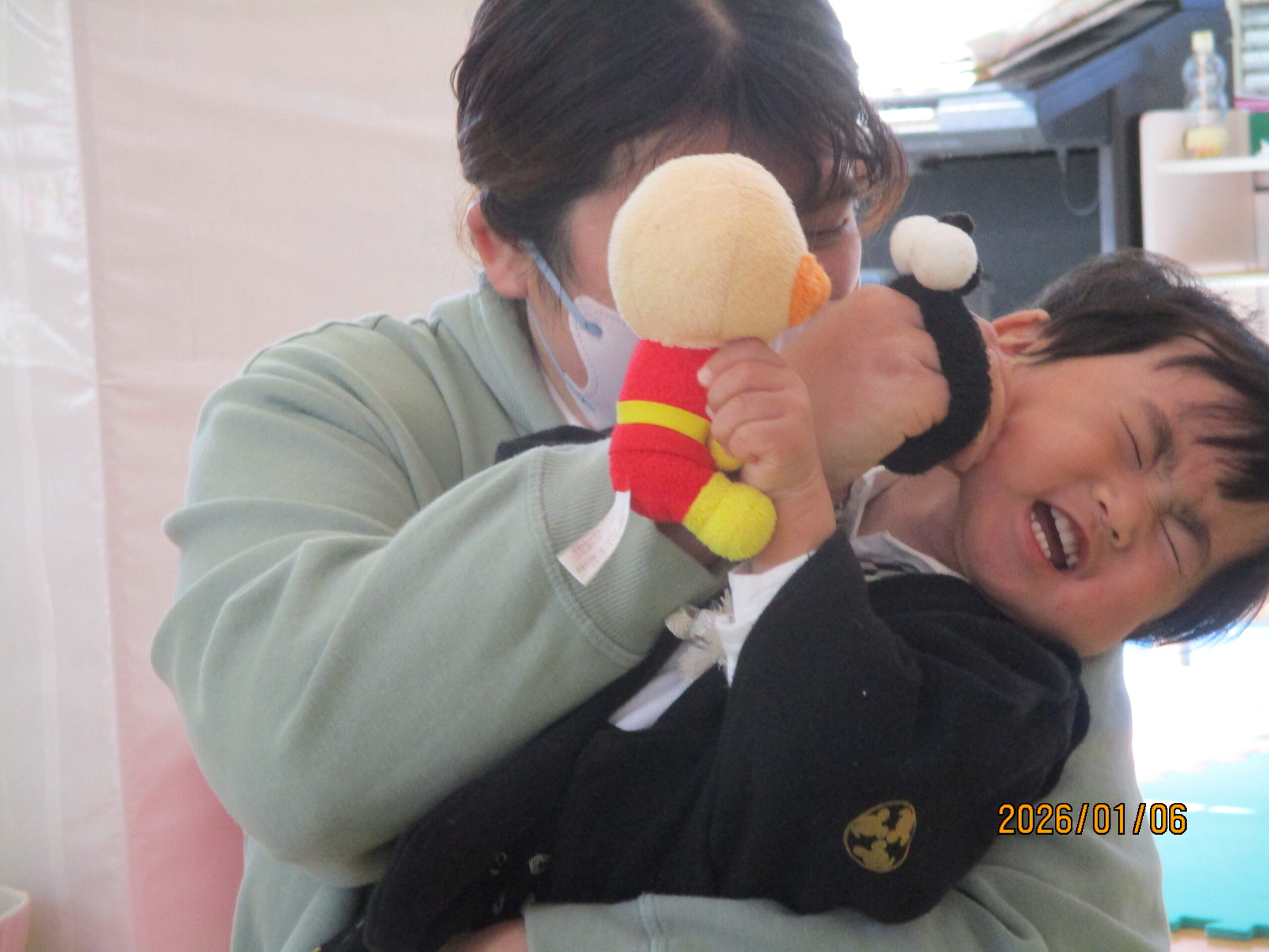 ふれあい遊びをしました!お母さんが手に持っているのは「はらぺこがぶちょ」!食いしん坊なのでなんでも食べちゃいます🍭
