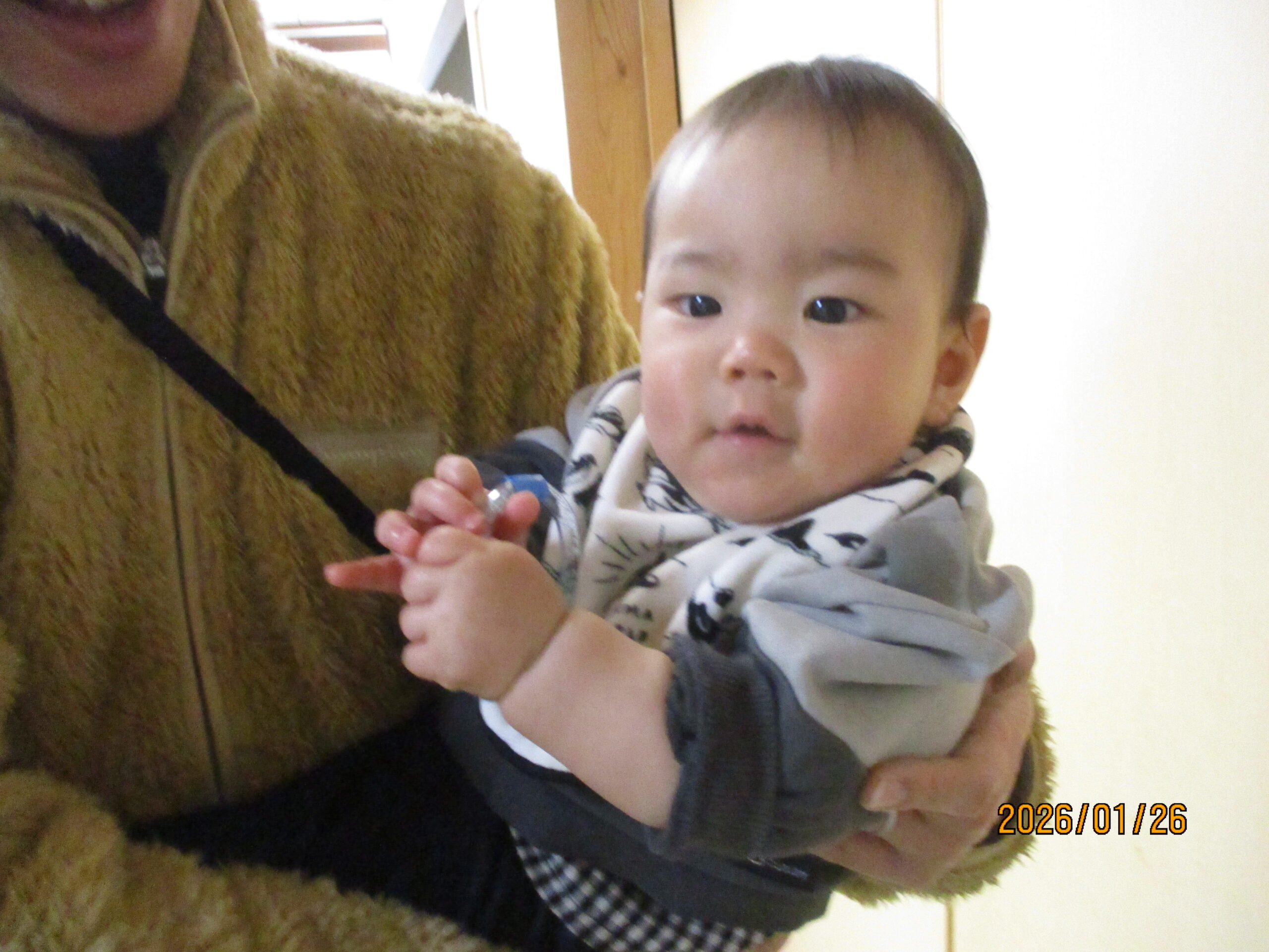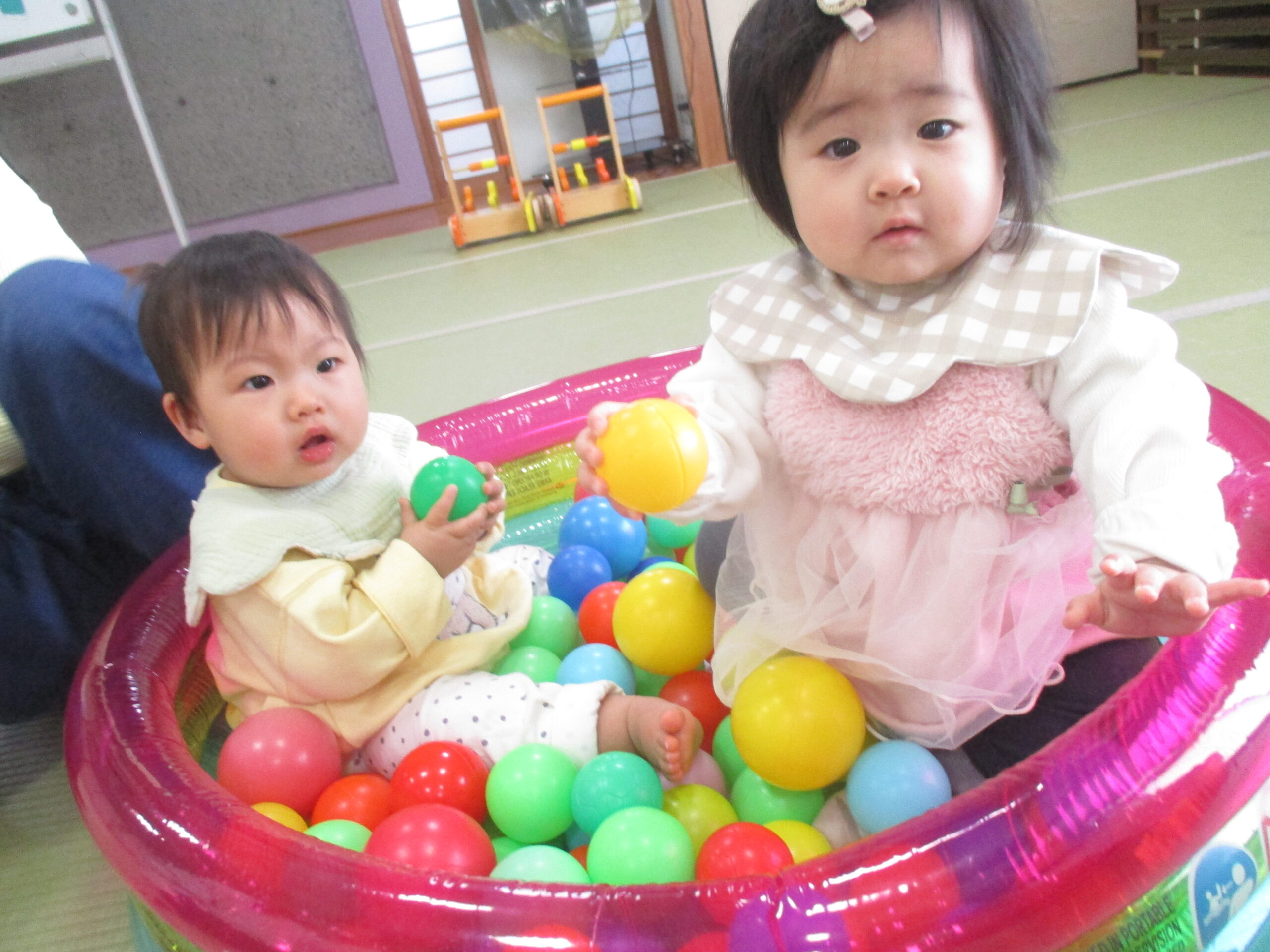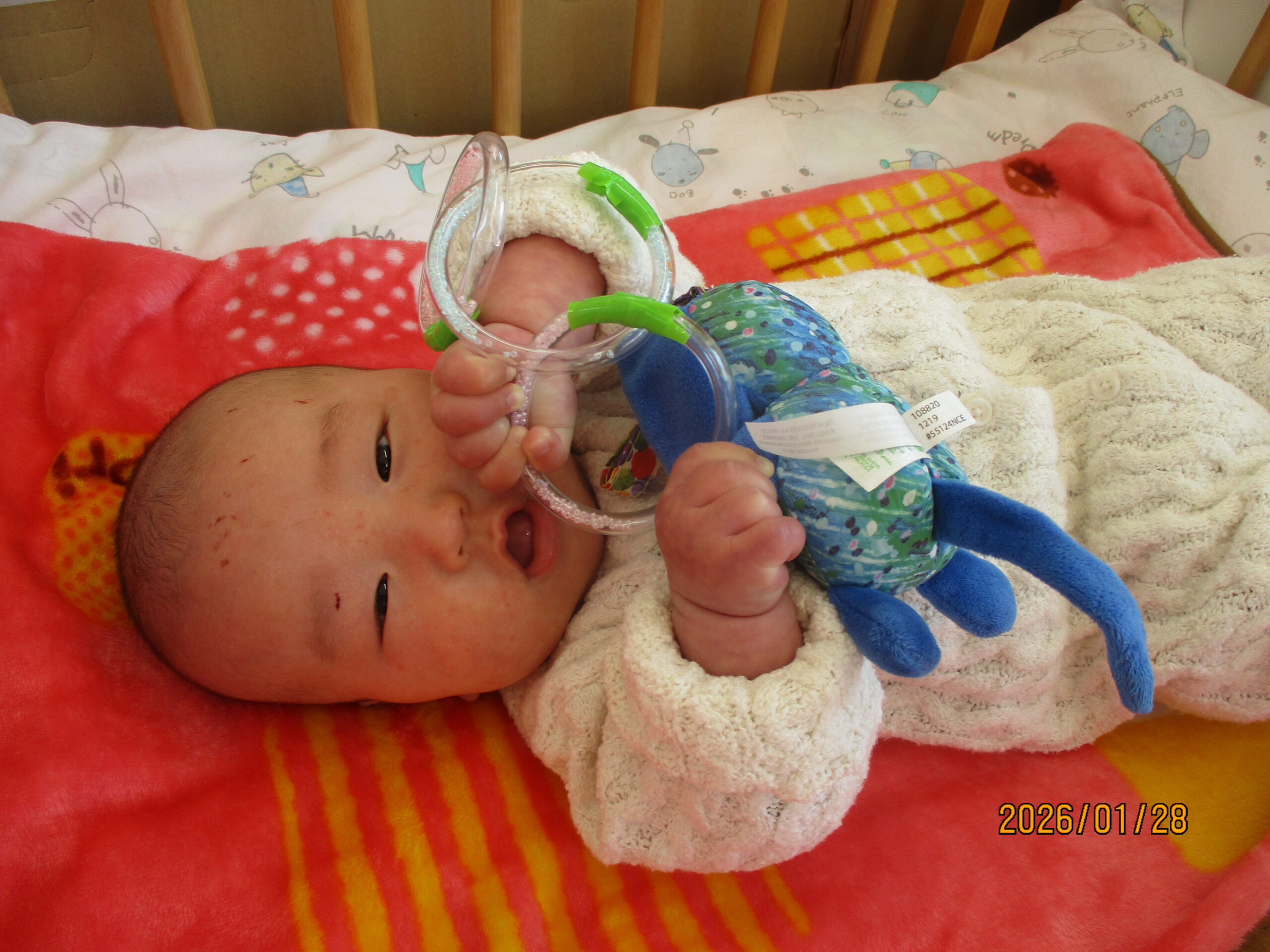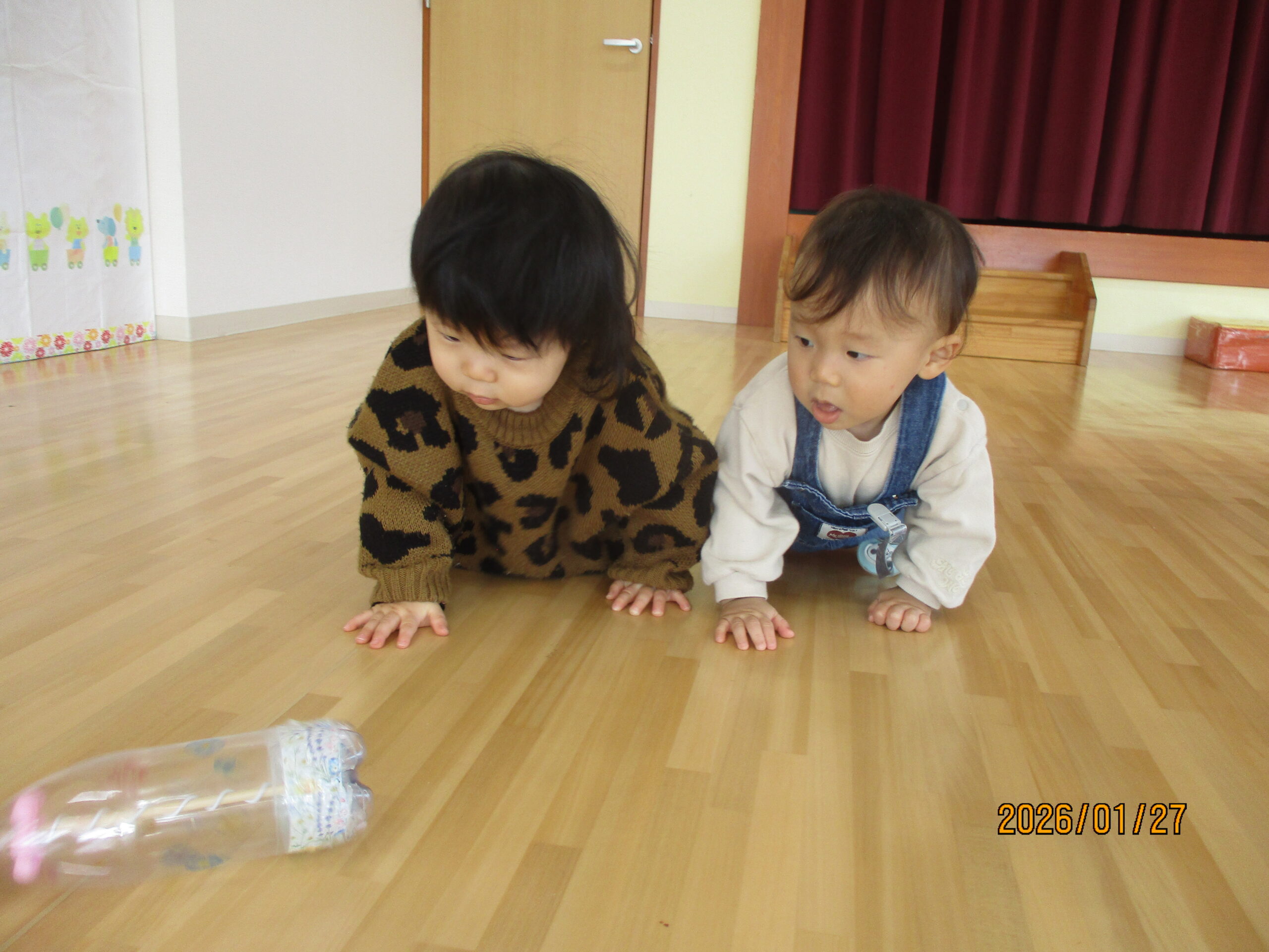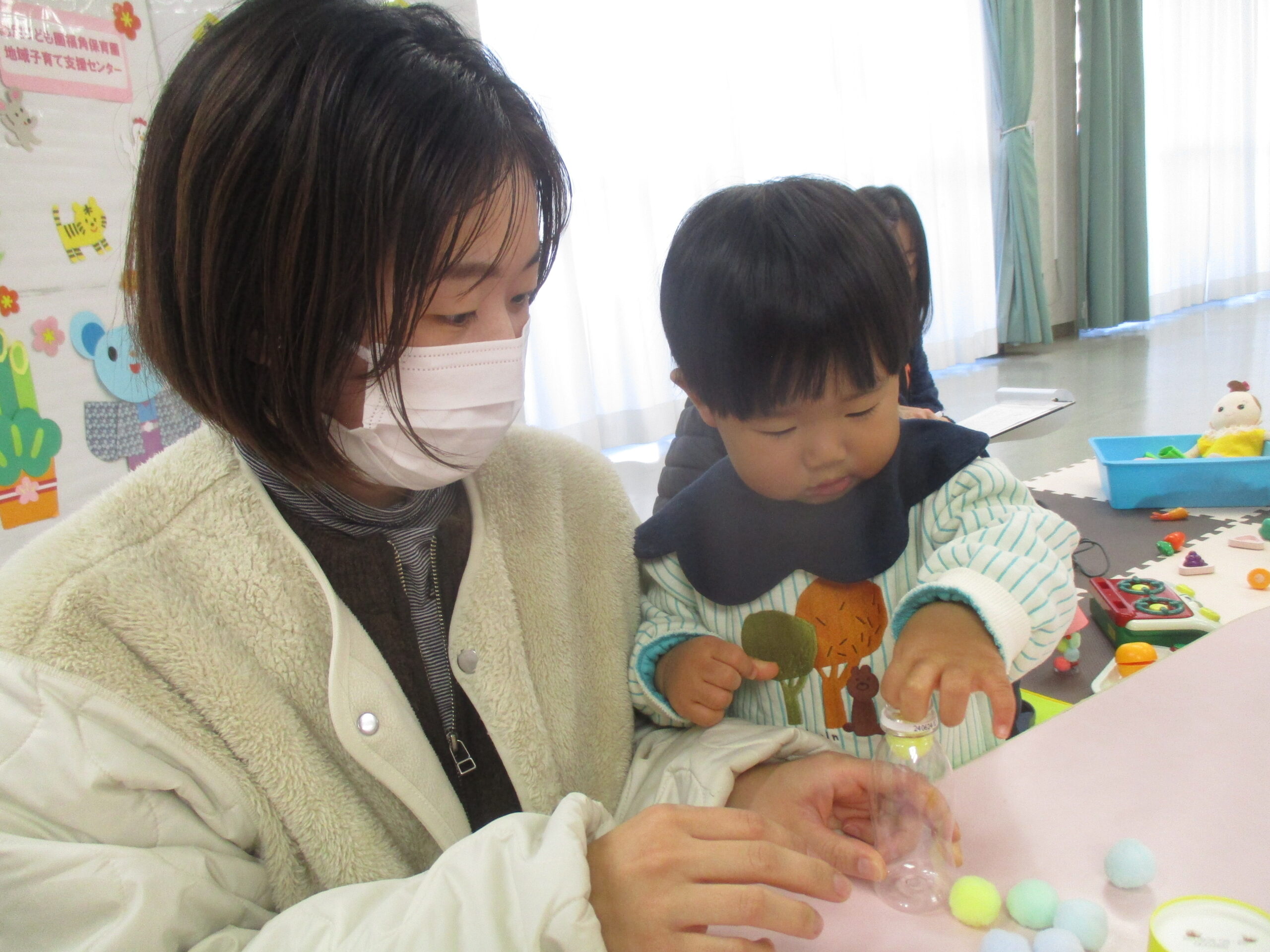 ふれあい遊びをしました!お母さんが手に持っているのは「はらぺこがぶちょ」!食いしん坊なのでなんでも食べちゃいます🍭