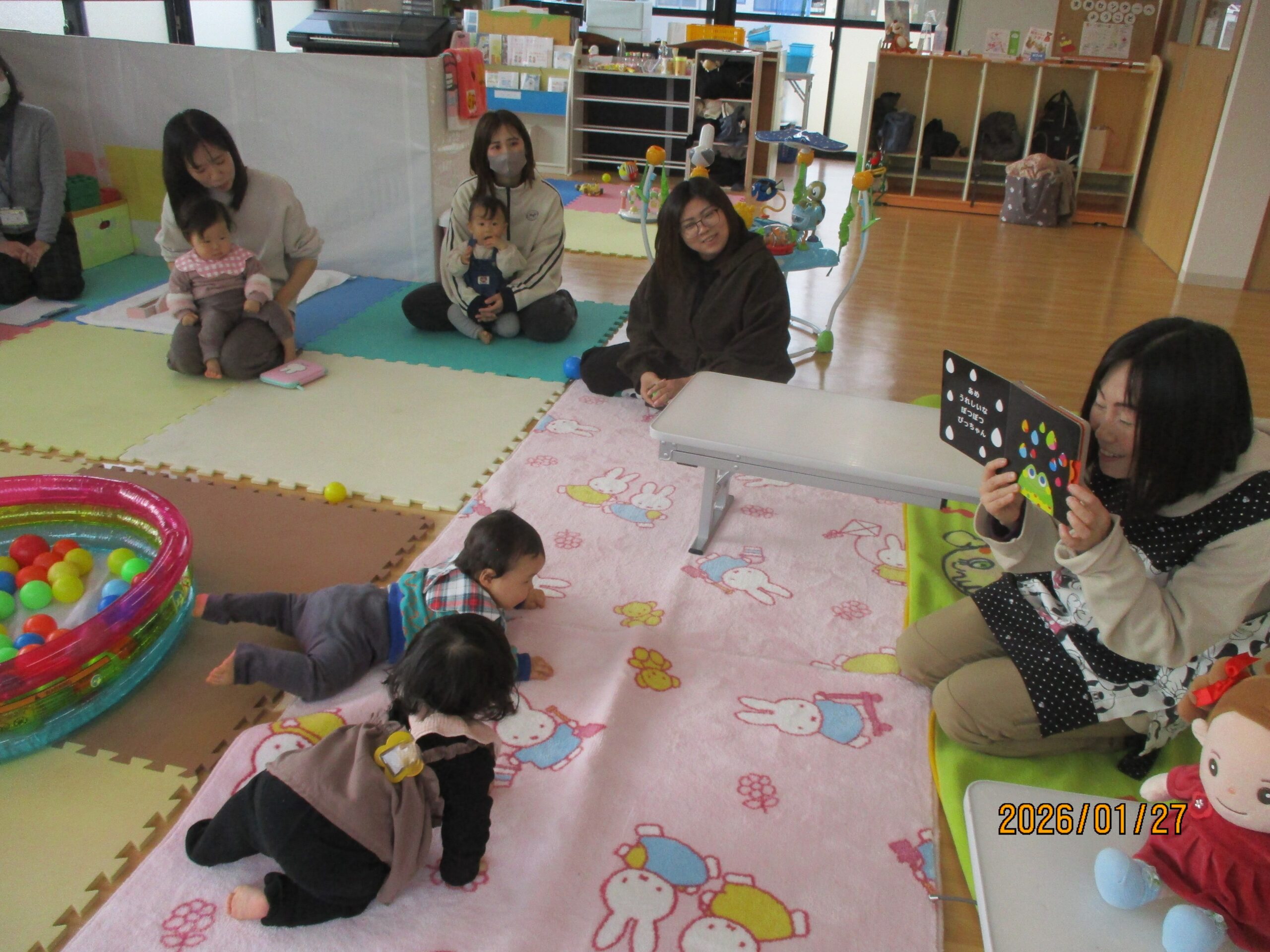 カラフルなページが出てくるたびに、子どもたちの目がまんまるに。 「次はどんなにっこりかな?」とワクワクしながら、絵本の世界にすっかり夢中になっていました。