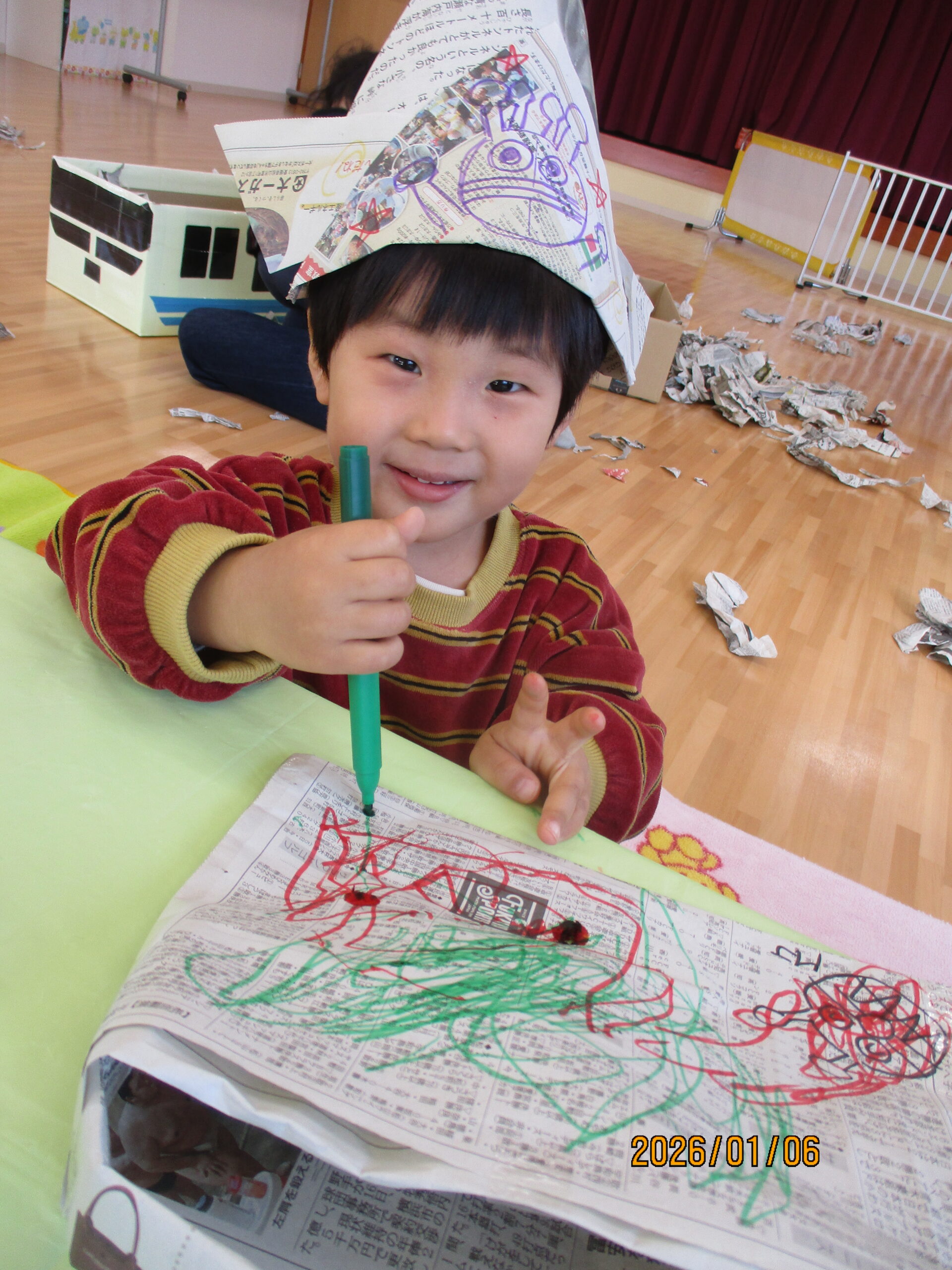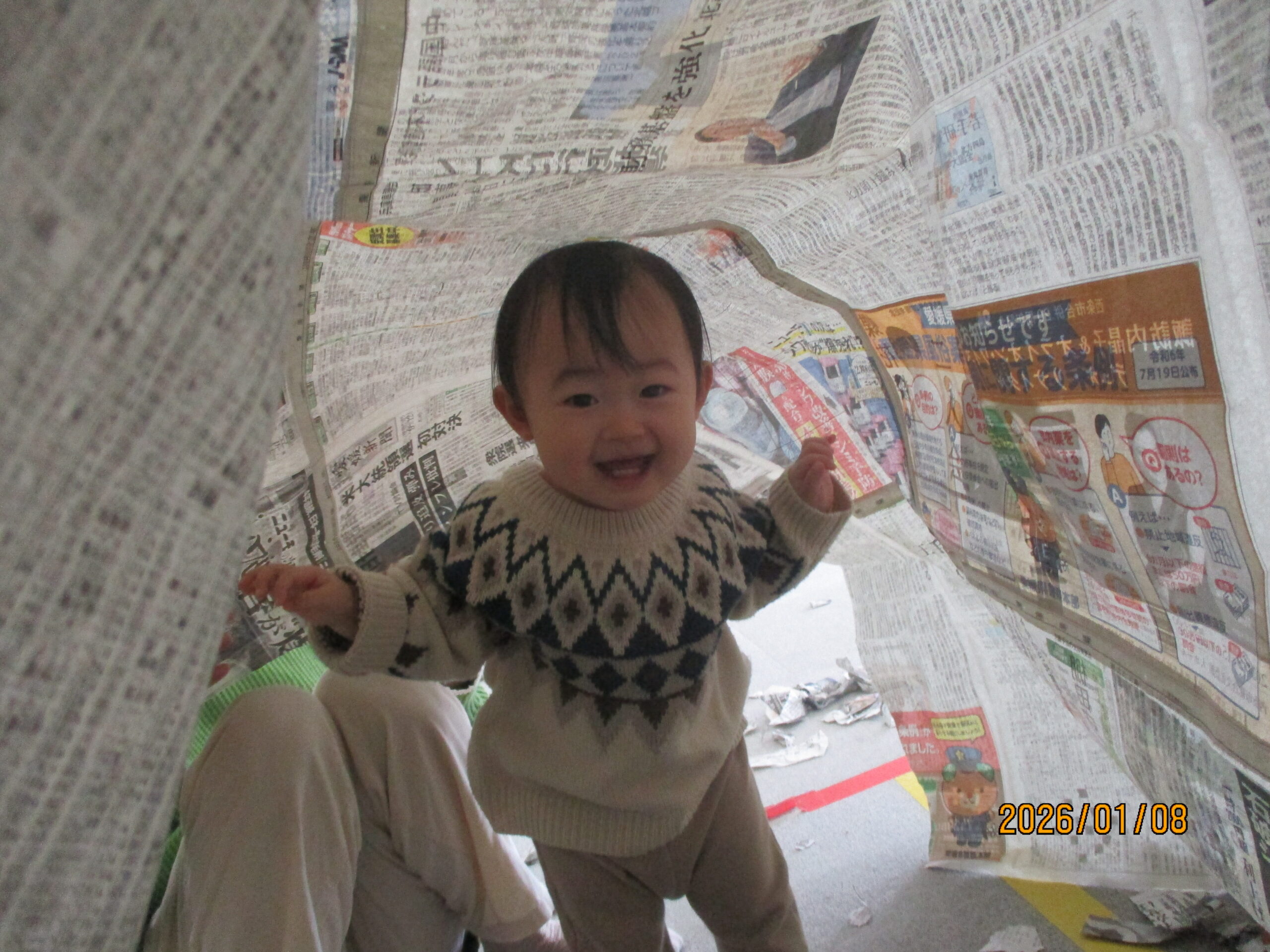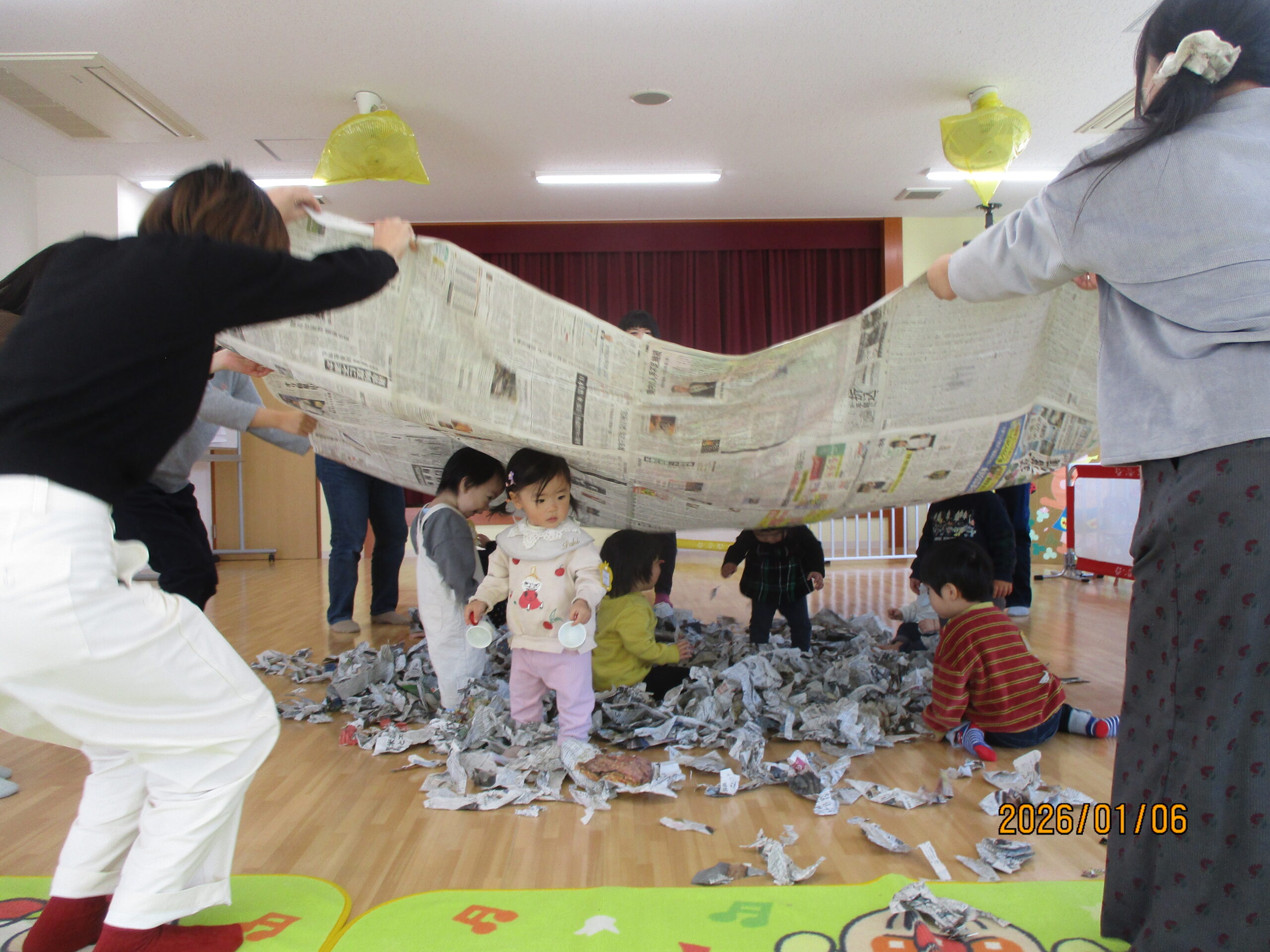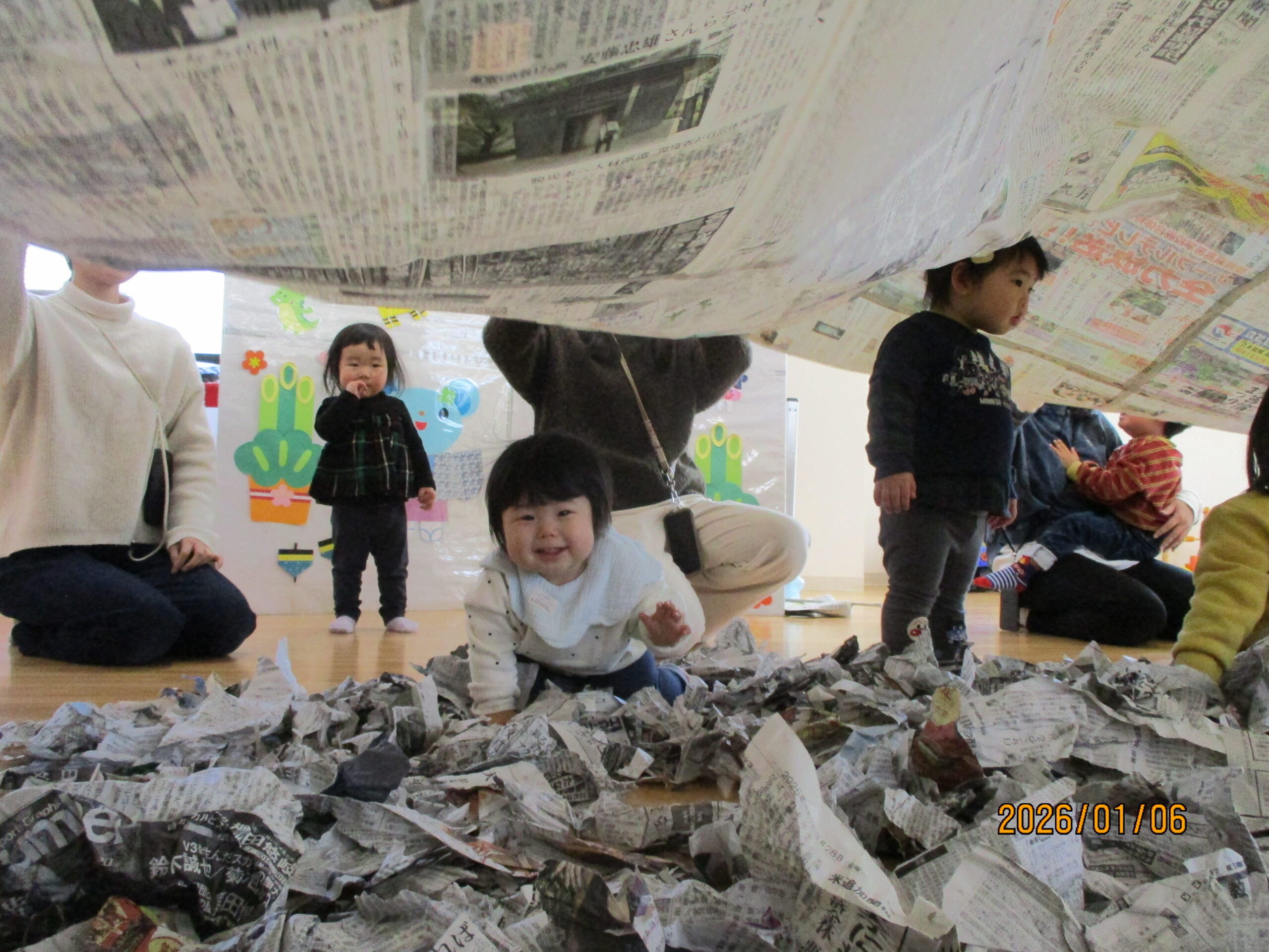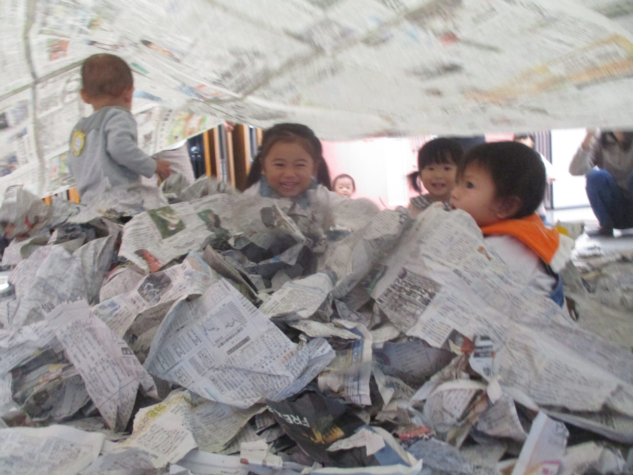 子どもたちは目をキラキラ輝かせながら、くぐったり、寝転んだり…みんないい笑顔です😊✨大盛り上がりの新聞遊びになりました!