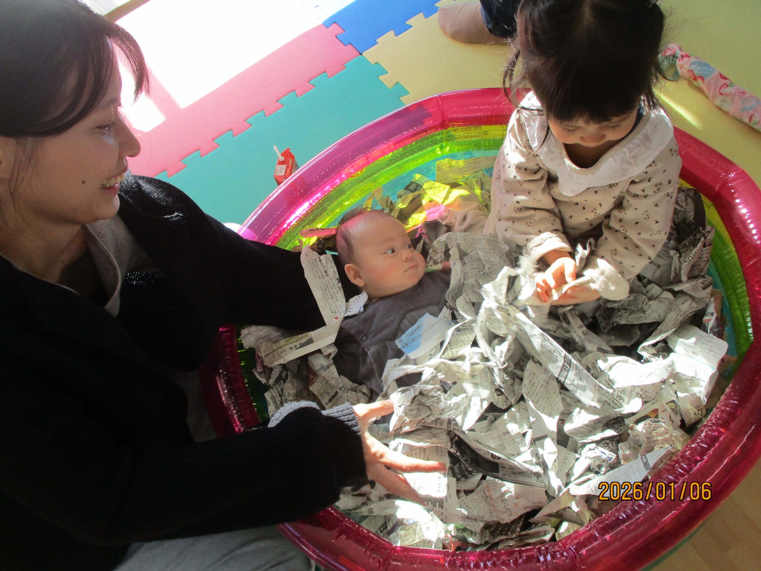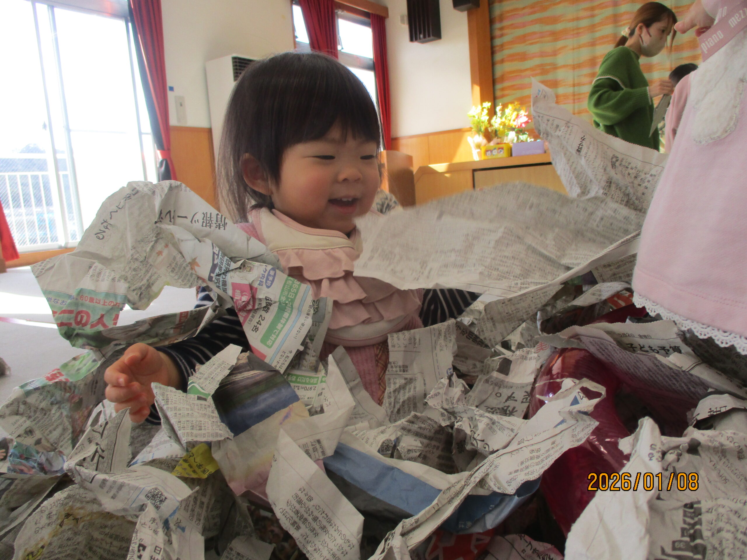 細かくちぎった新聞紙をたくさん広げると、子どもたちは大喜び! プールに入れて“新聞のお風呂”にすると、「わぁ〜!」と嬉しそうに体を沈めたり、上から新聞を降らせてみたり、寝転んでみたり…。