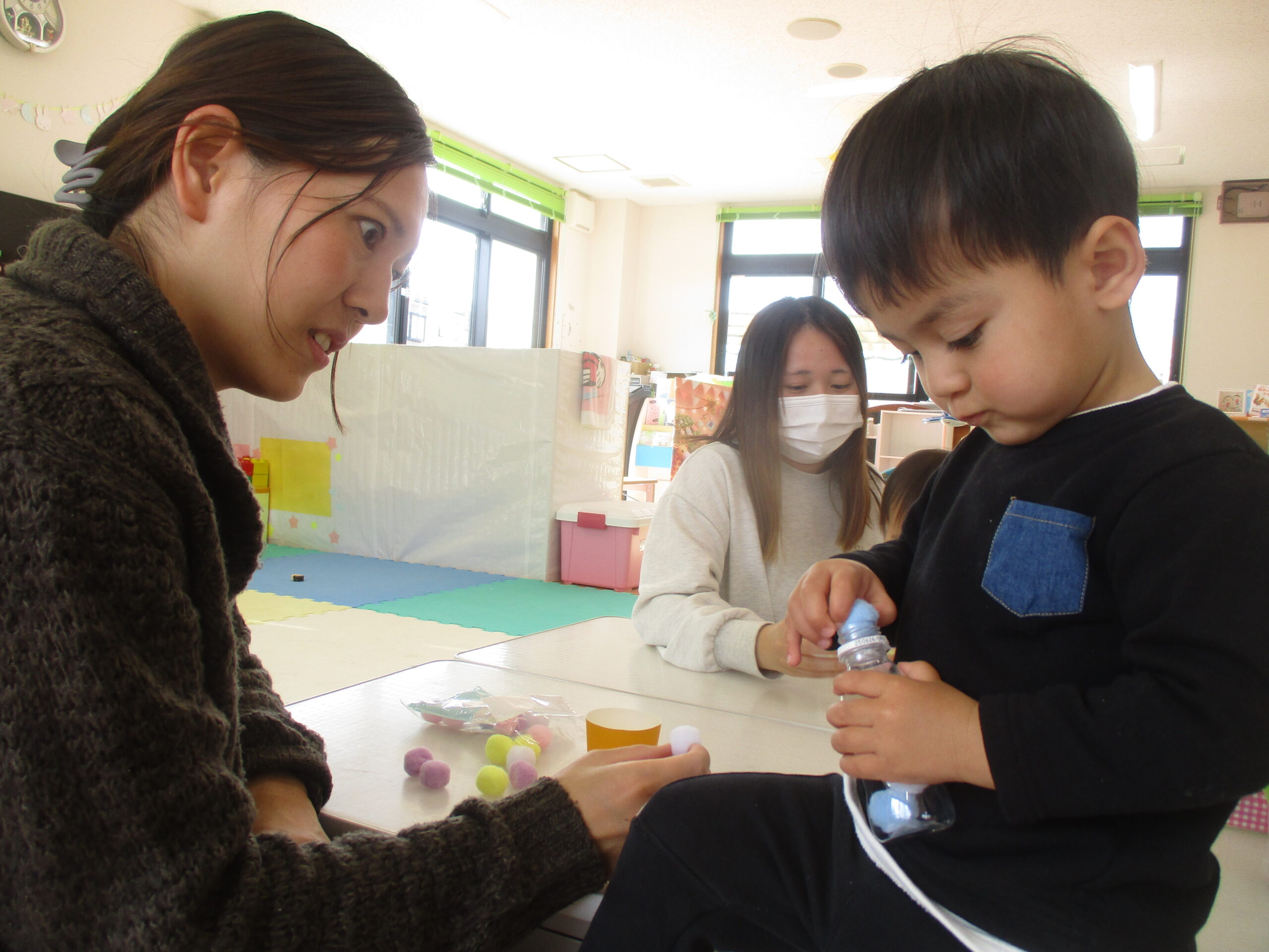 ゆらゆら揺れる鬼のおもちゃを作りました👹✨ まずは、小さなデコレーションボールを指先でつまんで、そーっと容器の中へ。 「落とさないように…!」と集中しながら、一つひとつ丁寧に入れてくれました。
