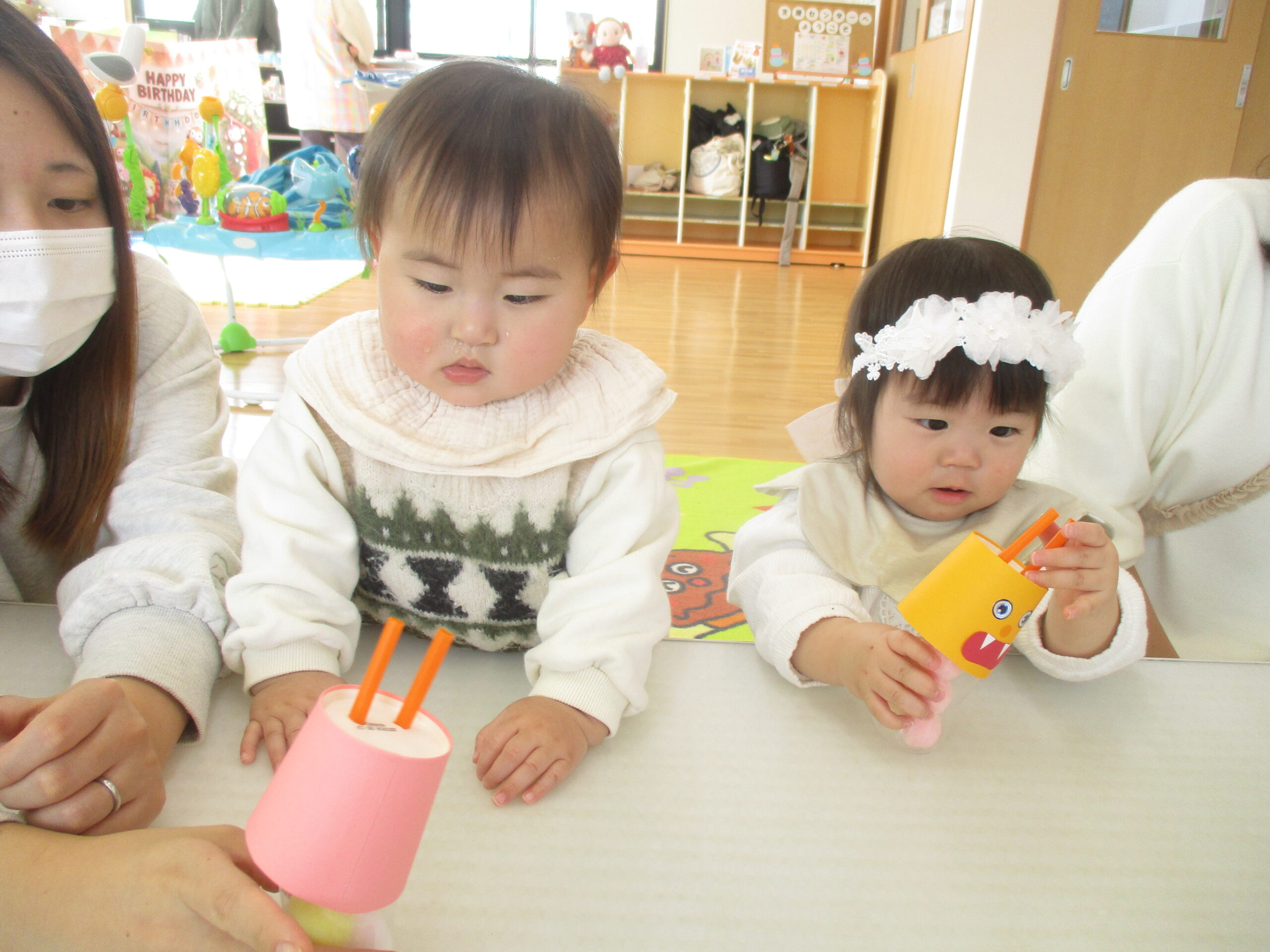 完成したおもちゃで、子どもたちは思い思いに遊んでいました💕 口に持っていってカミカミしてみたり、手に持ってシャラシャラ振って音や動きを楽しんだり…。 それぞれのペースでじっくりと感触を味わう姿がとても可愛らしかったです🍀