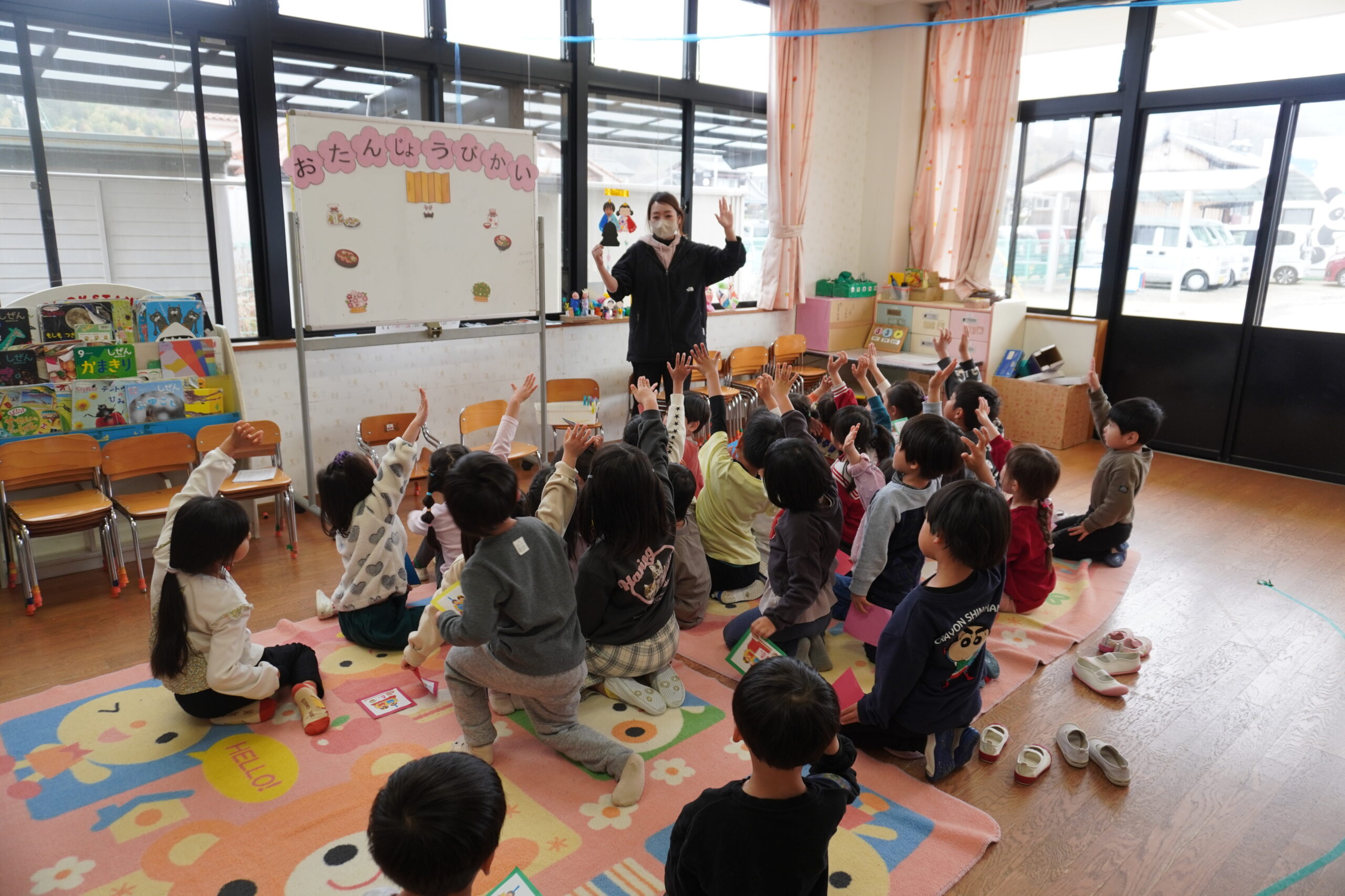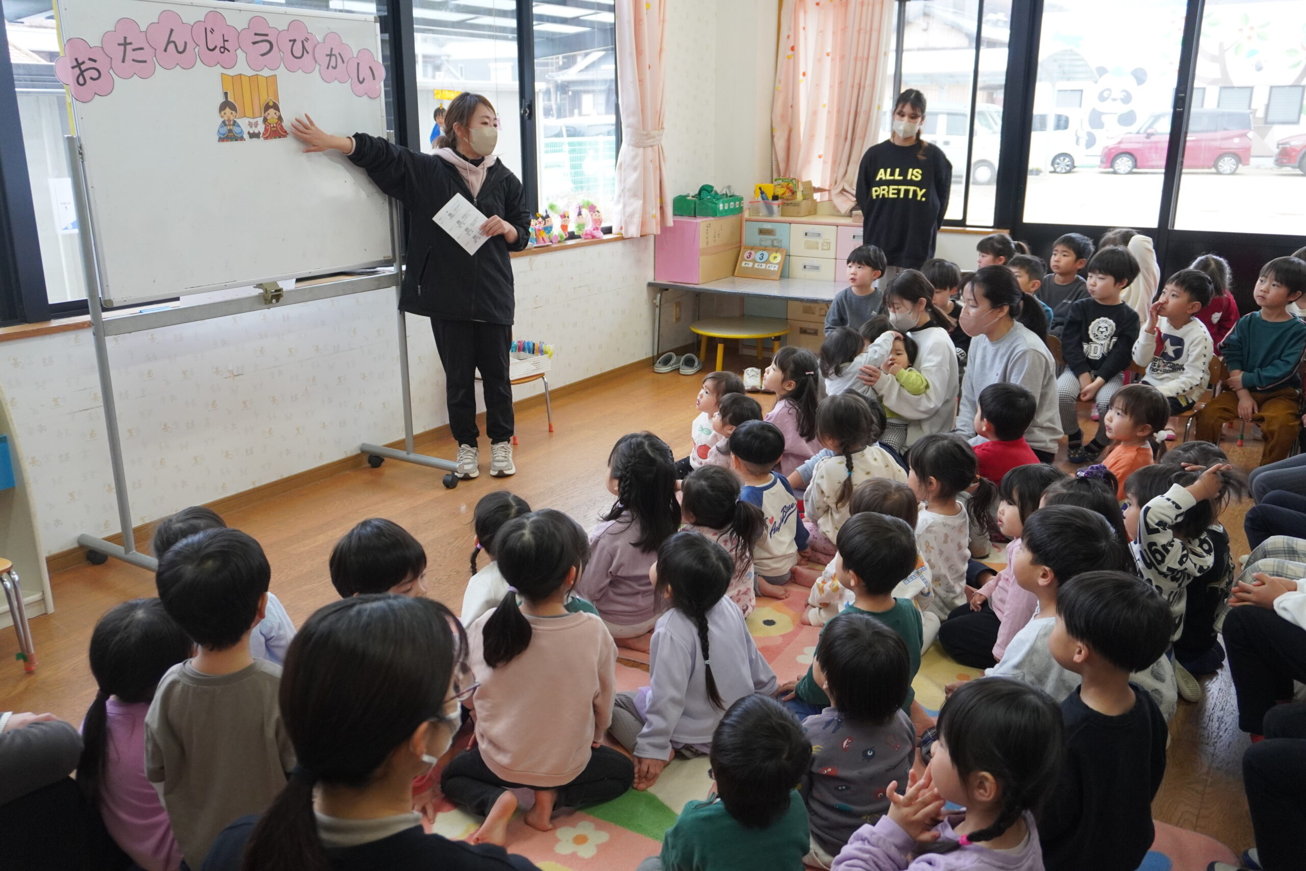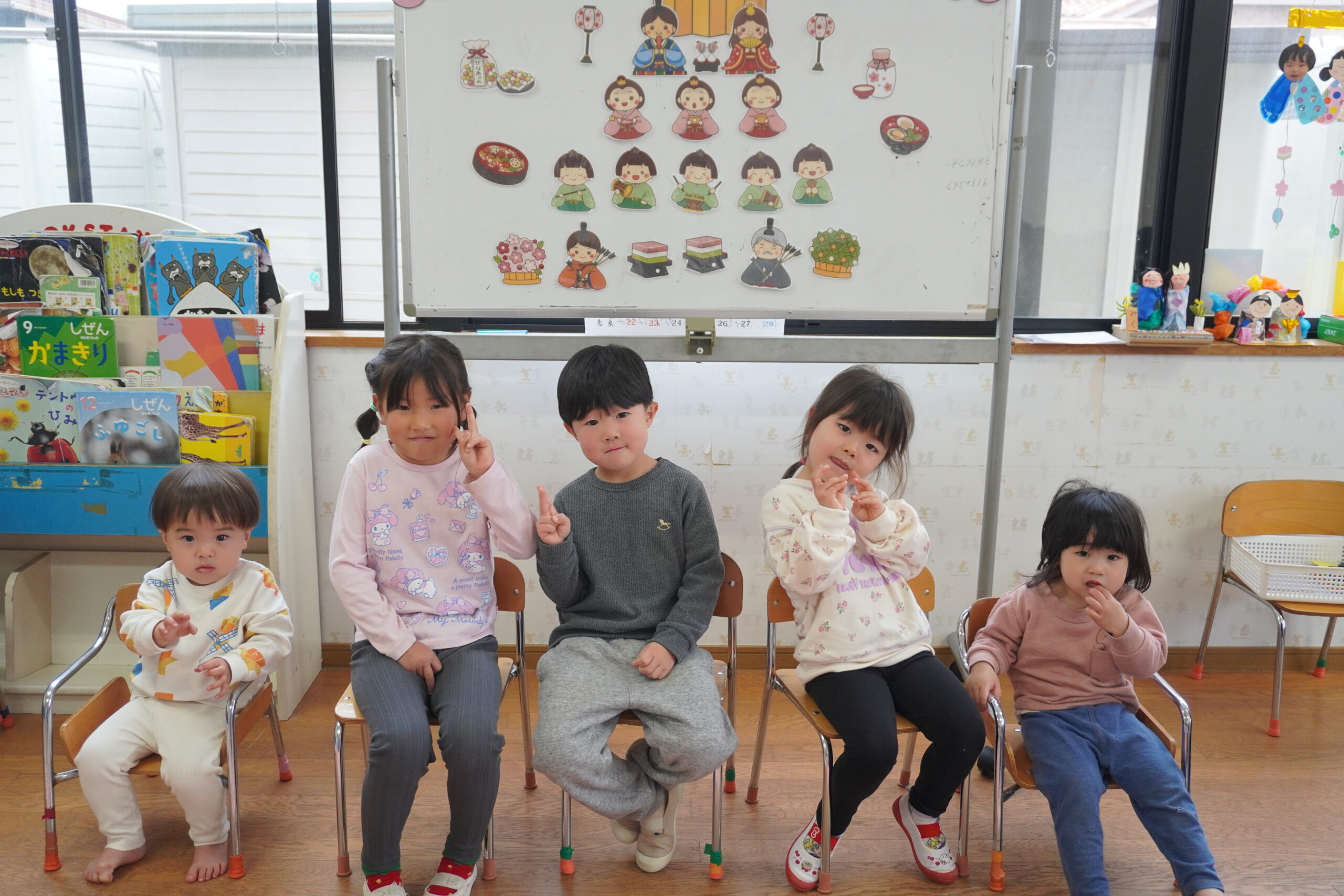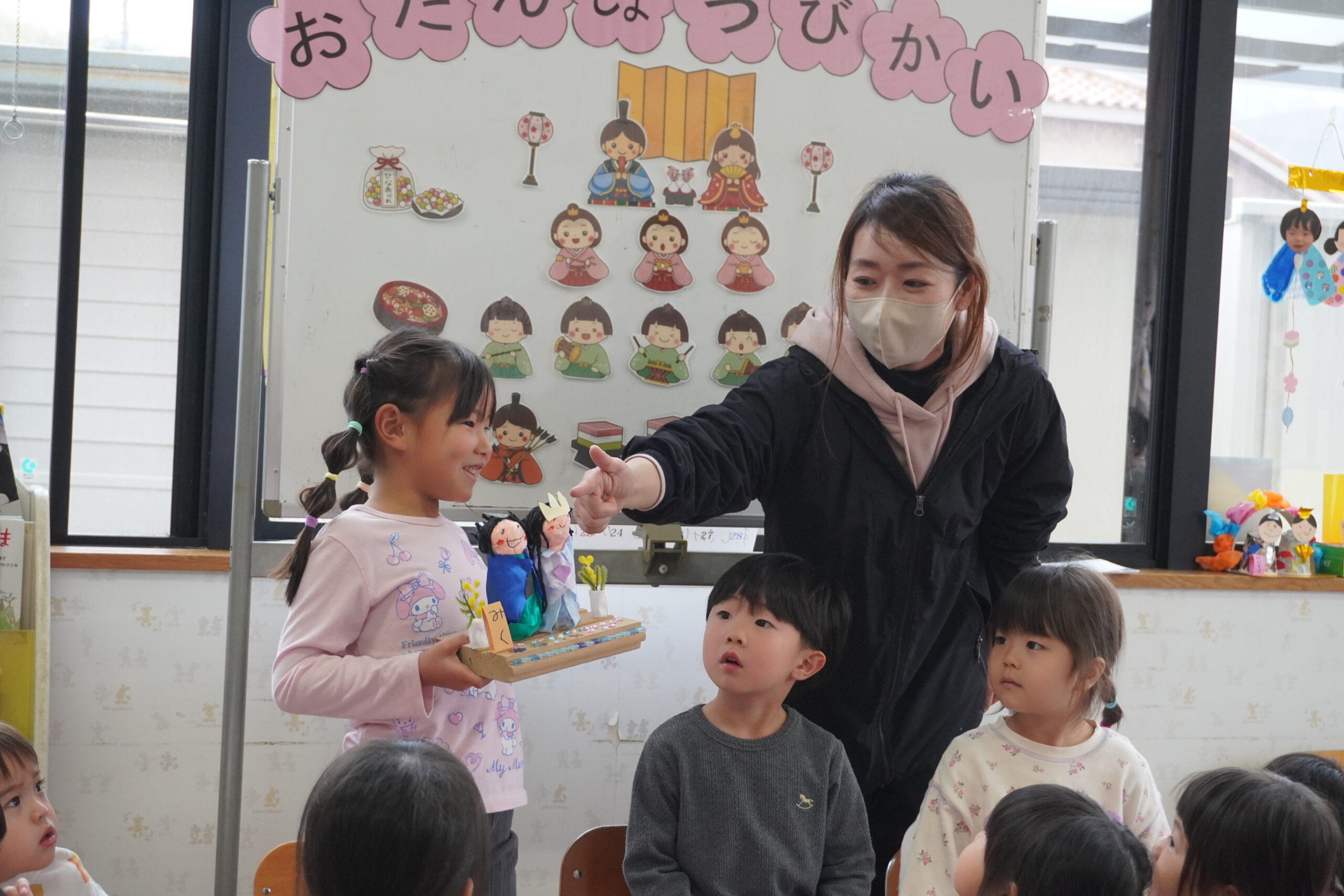 集会ではひなまつりについてのお話をしたり、歌ったりクイズをしたりして過ごしました。