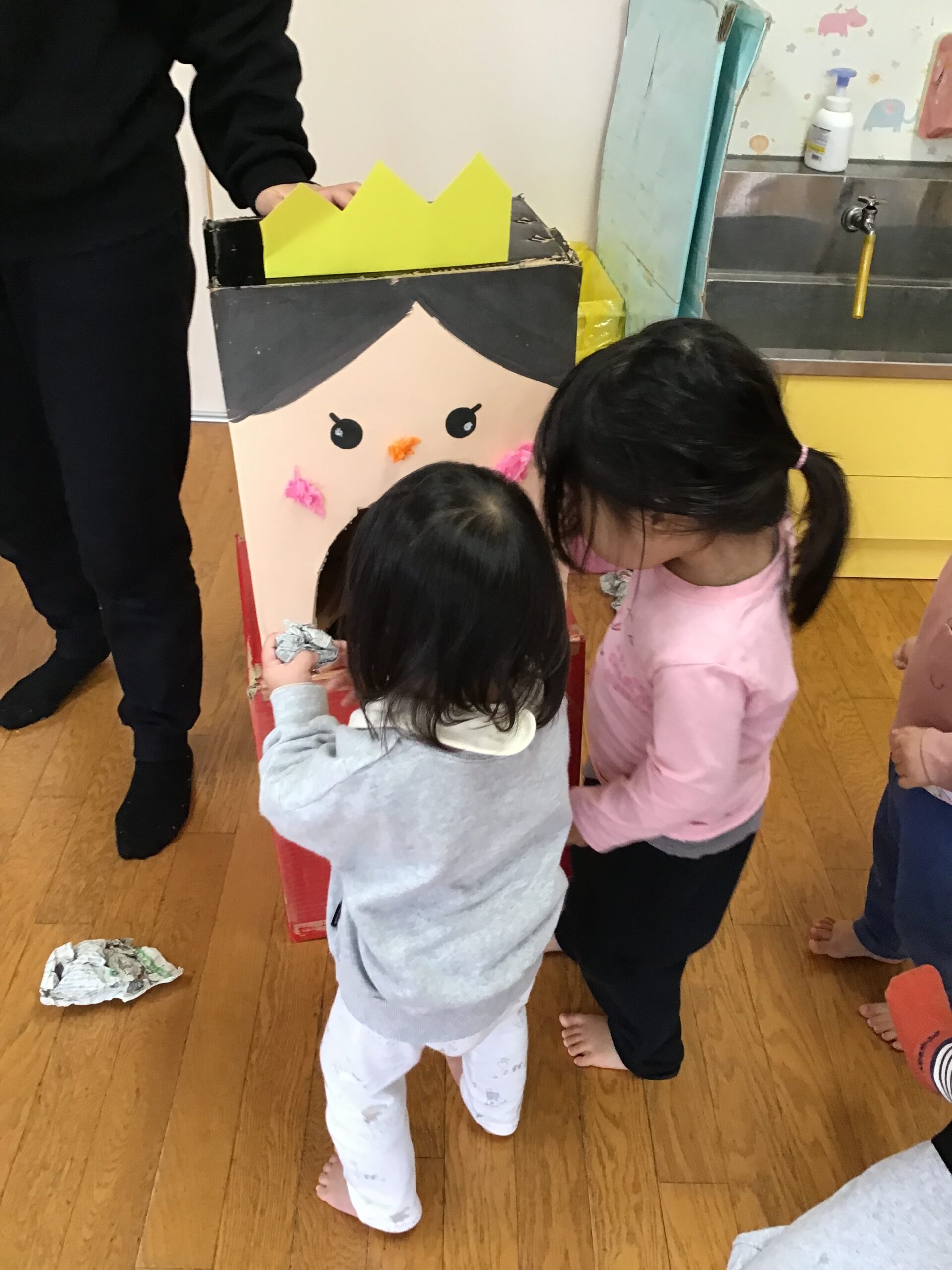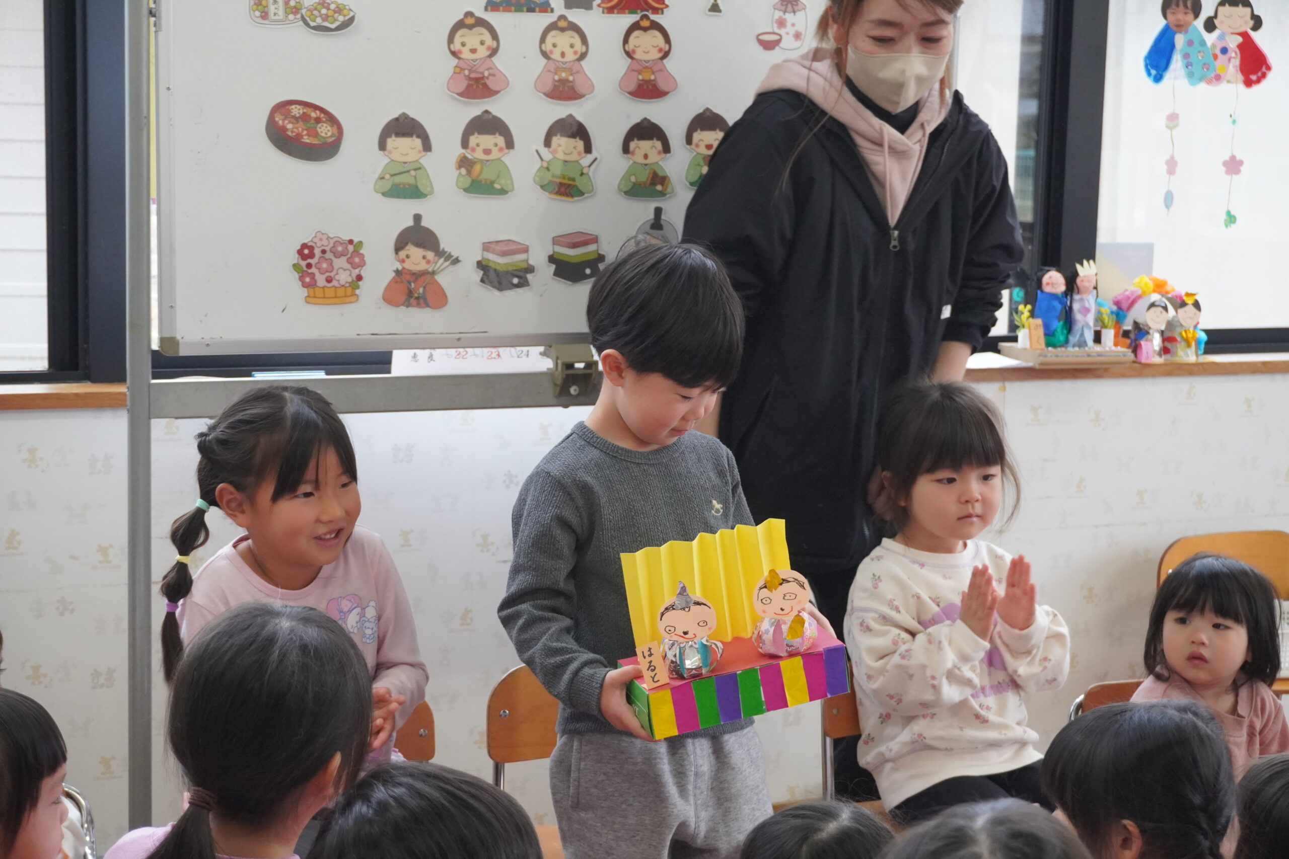 シルエットを当てた子はホワイトボードにひな飾りを貼り、みんなでひな人形を完成させました🌟