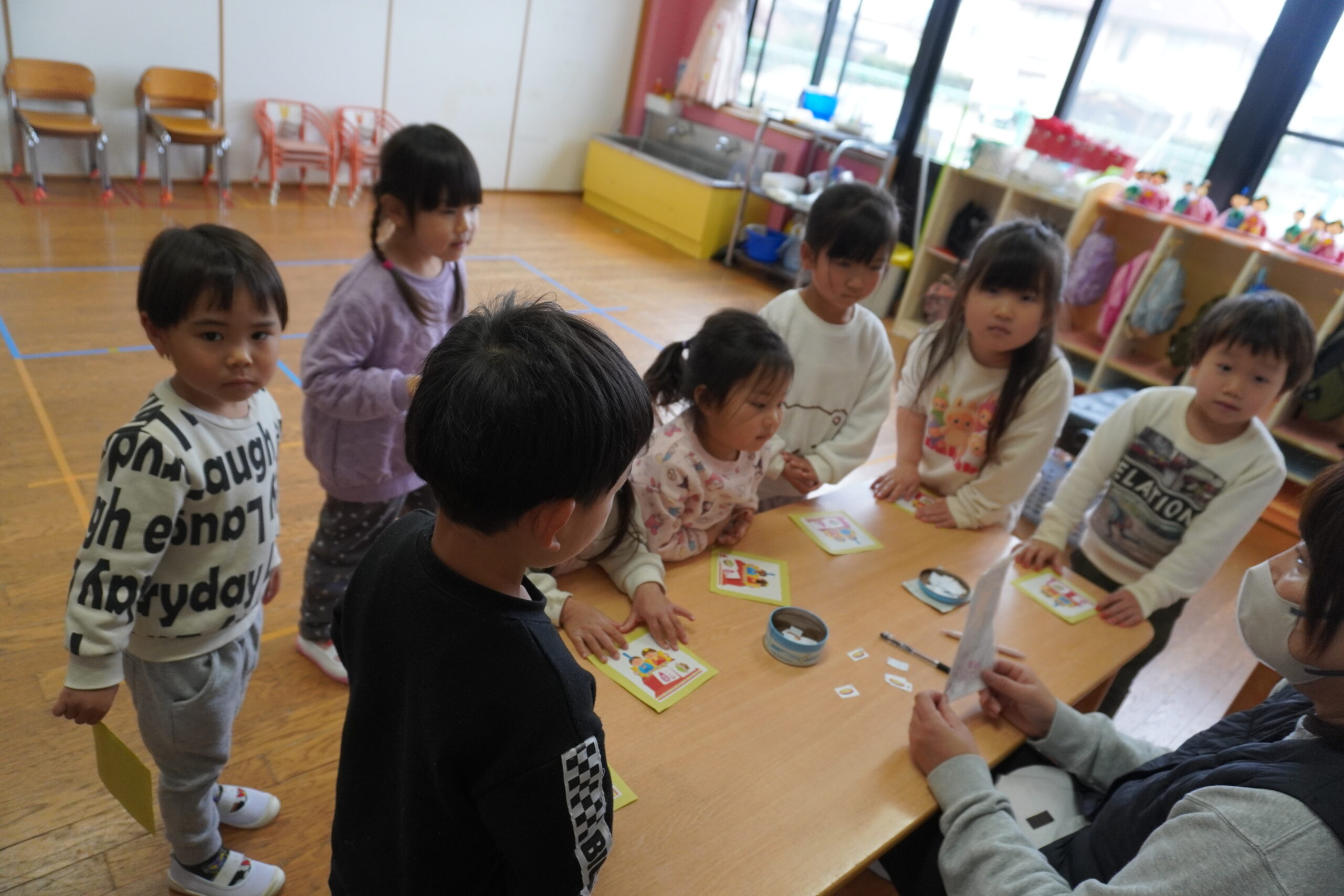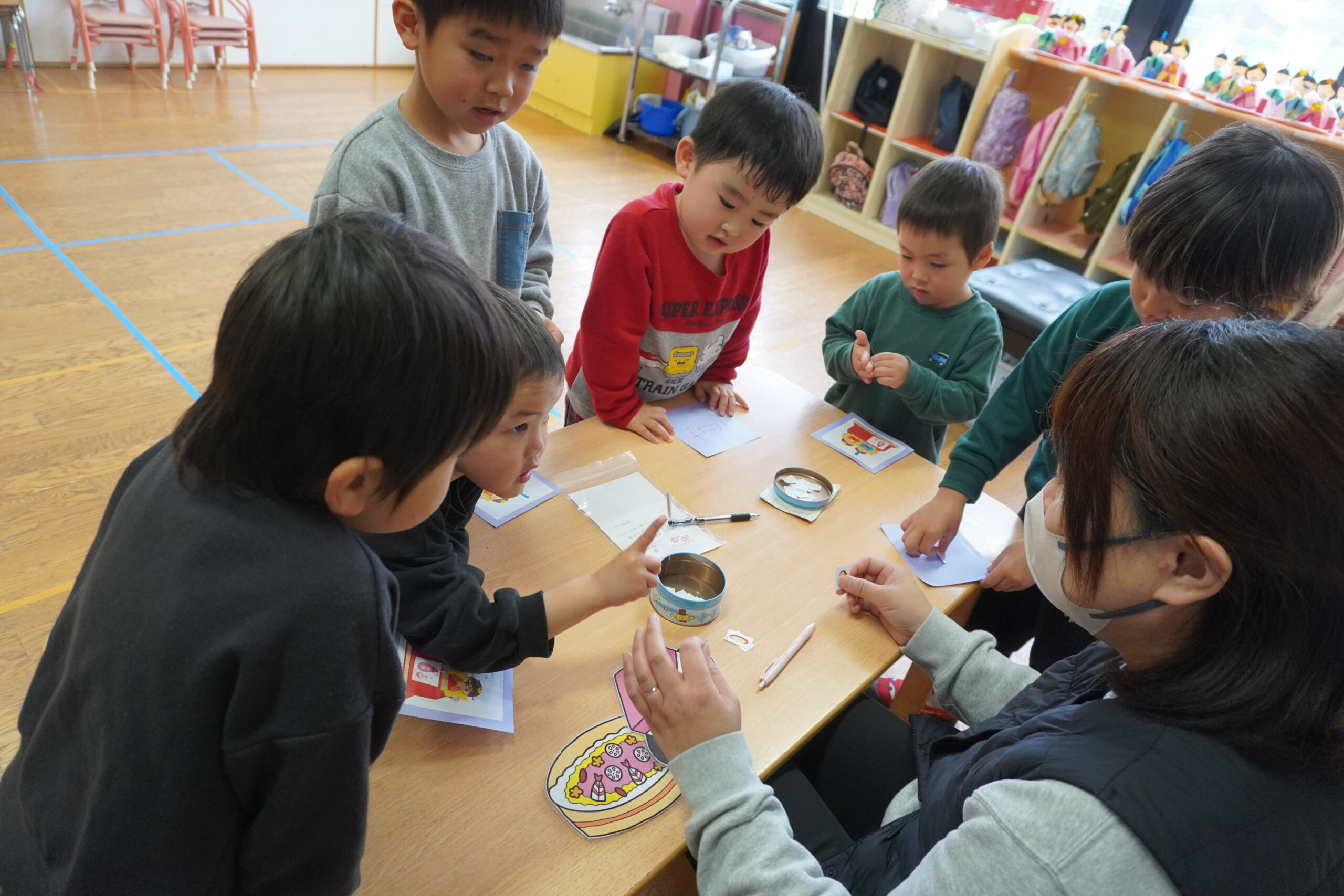 異年齢のチームに分かれ、各クラスを周り、ひなまつりに関するクイズにチャレンジしました。