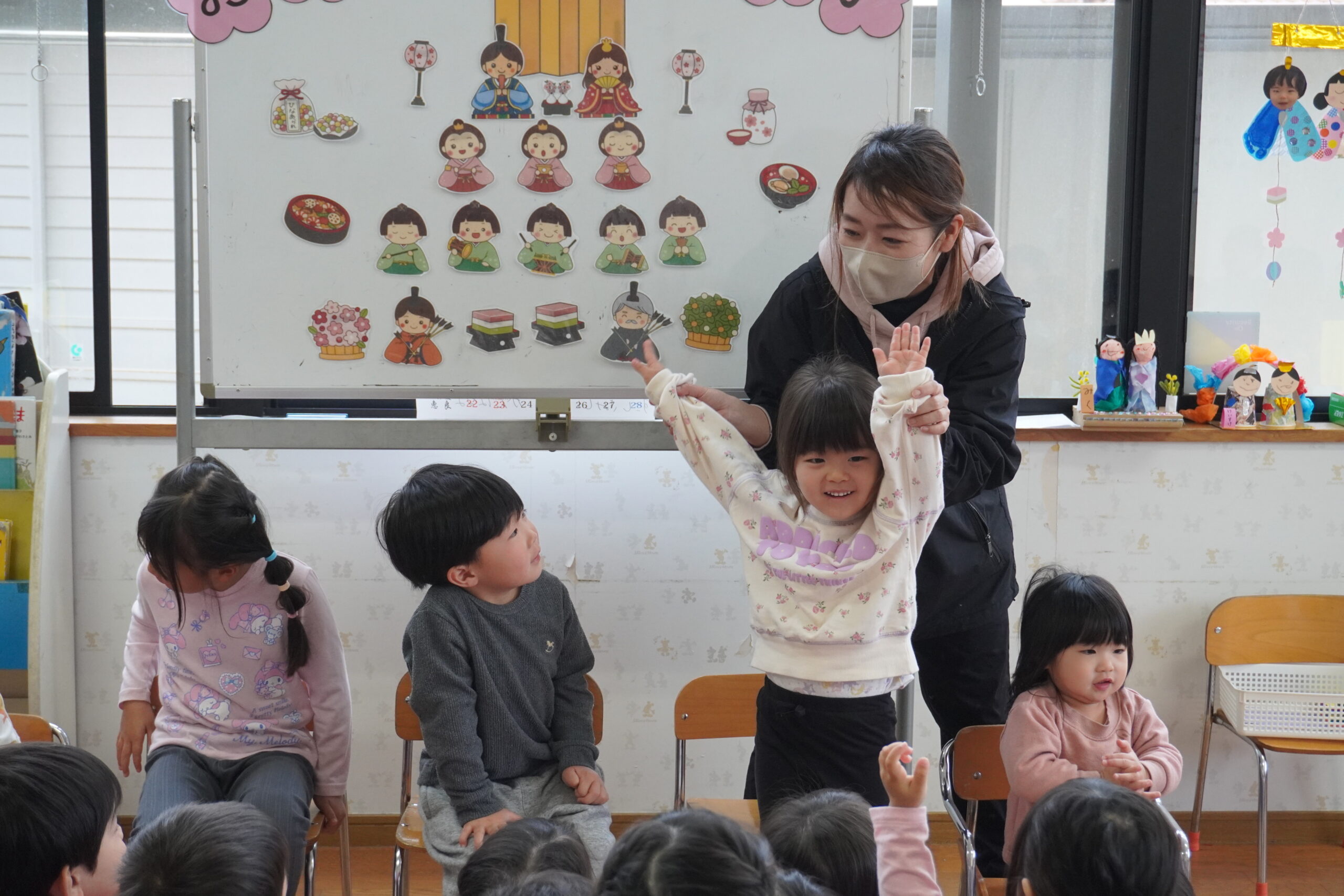 集会ではひなまつりについてのお話をしたり、歌ったりクイズをしたりして過ごしました。