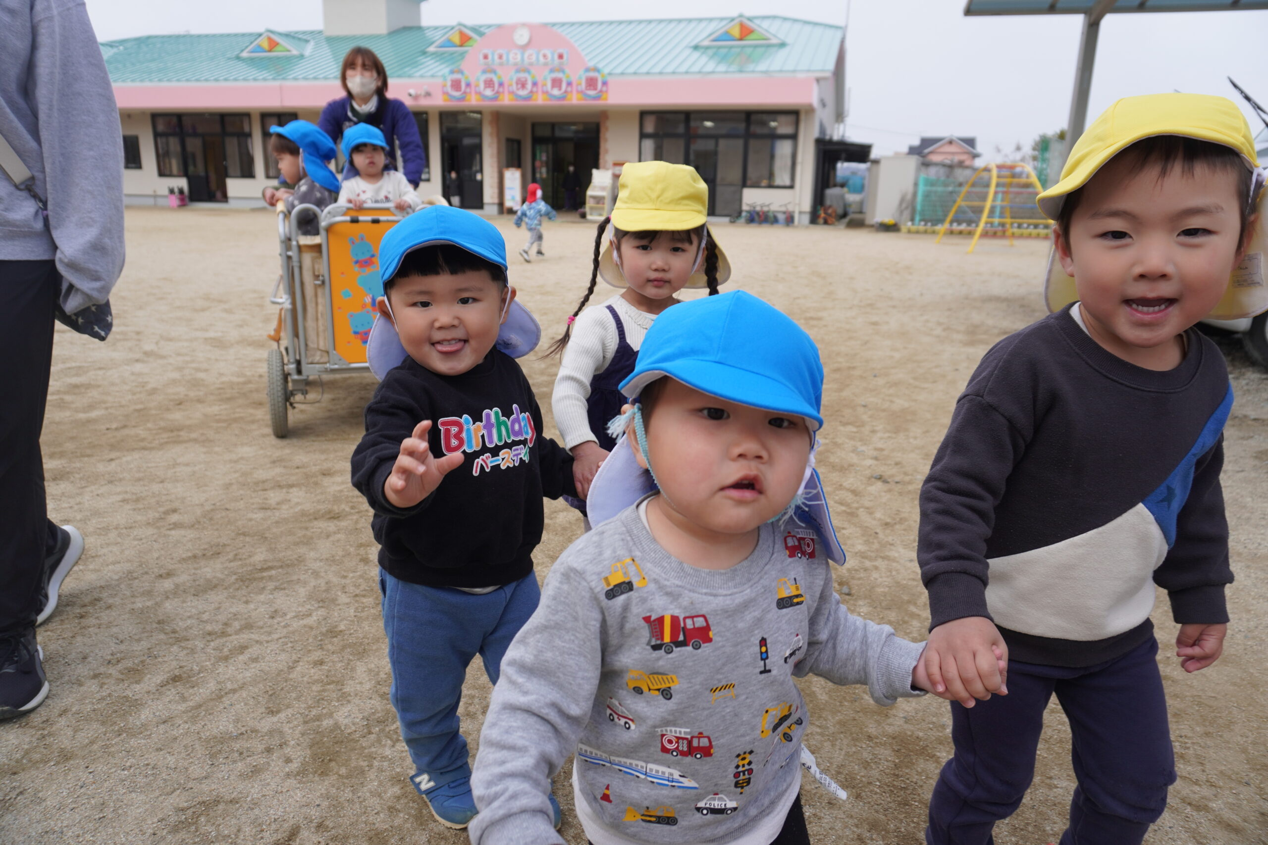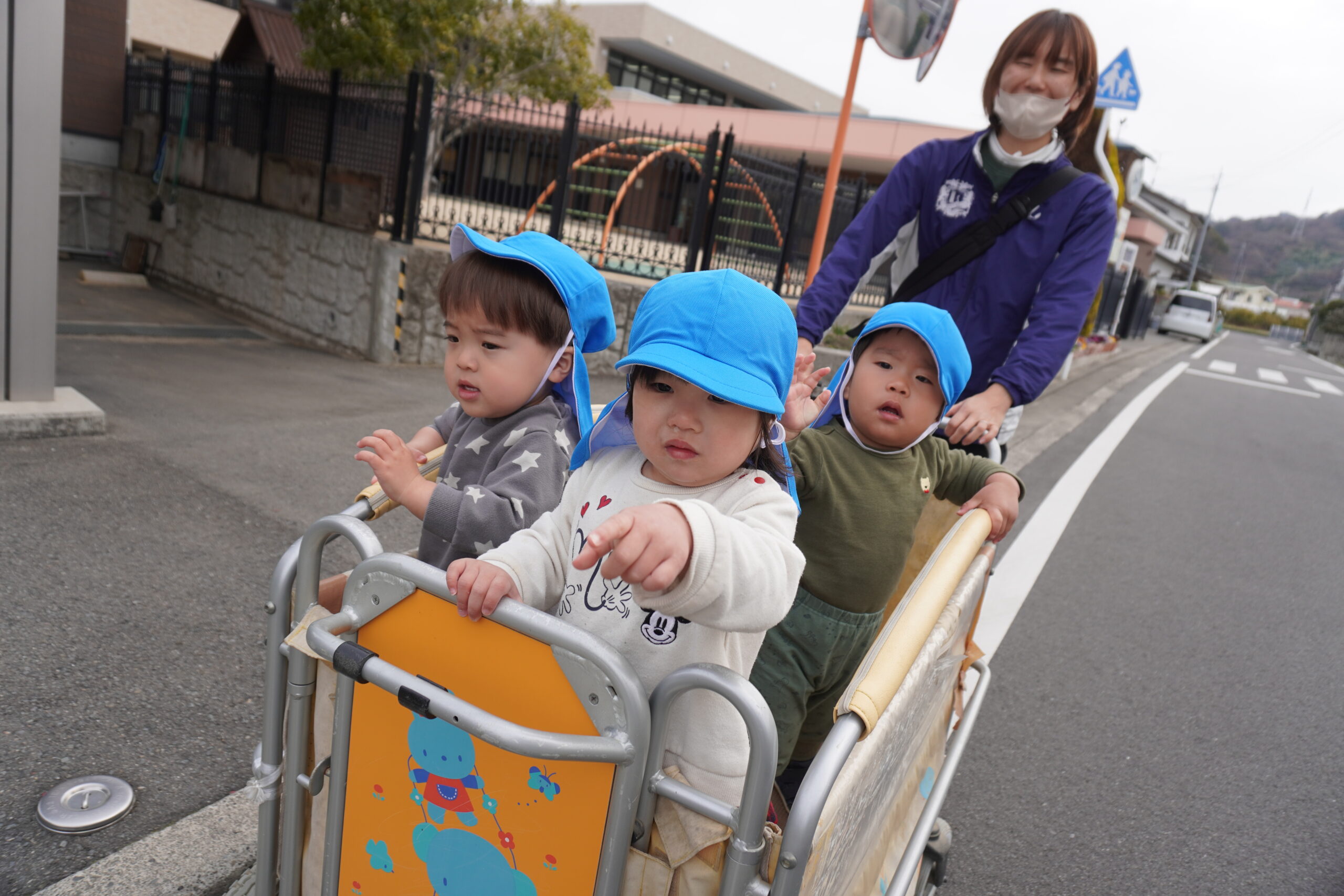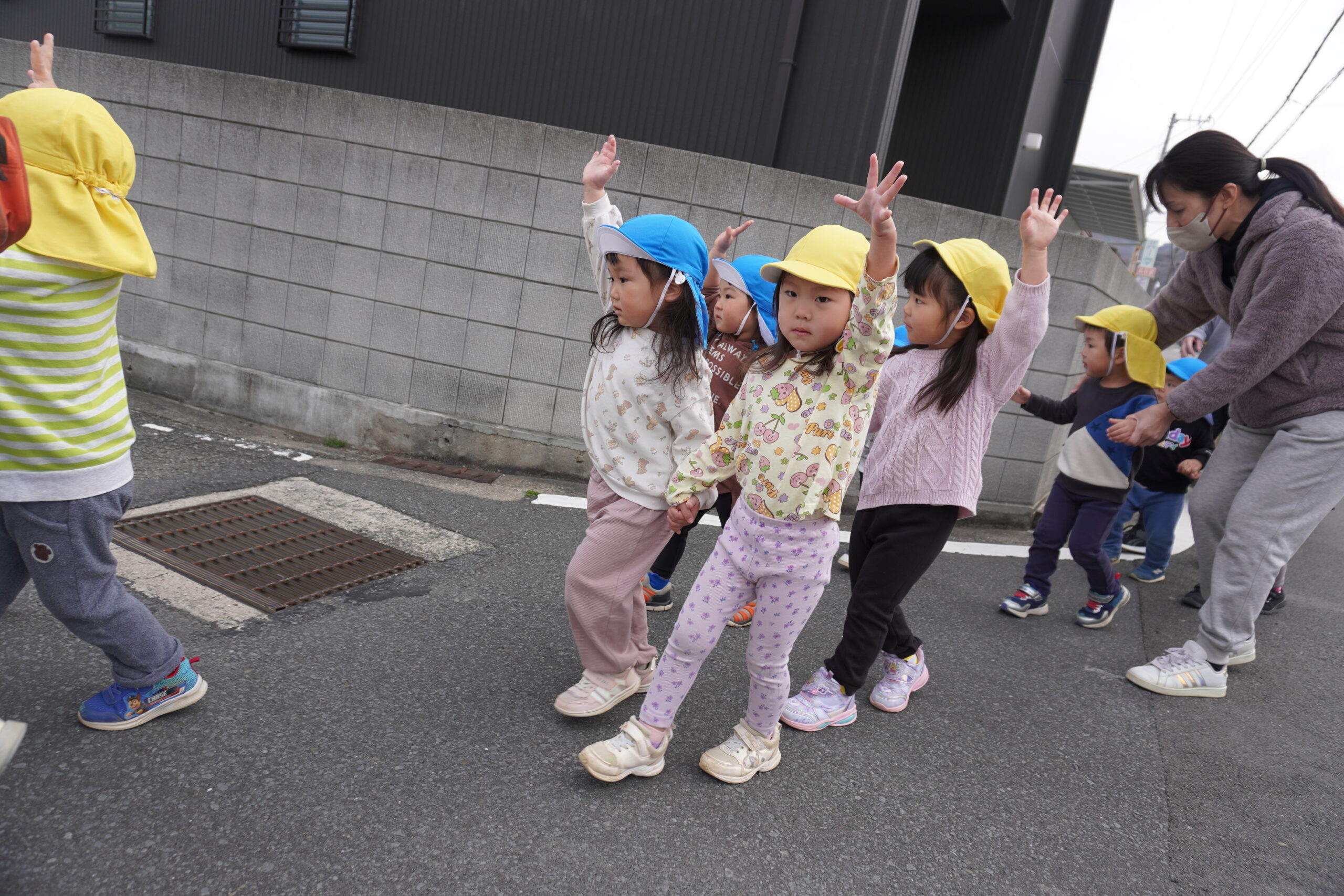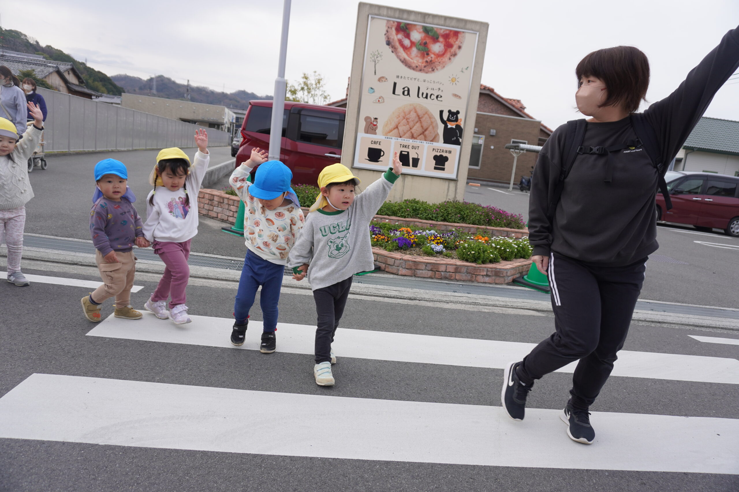 「車来てないよ。渡ろう」とあひる組さんは優しく声を掛けてあげています💖