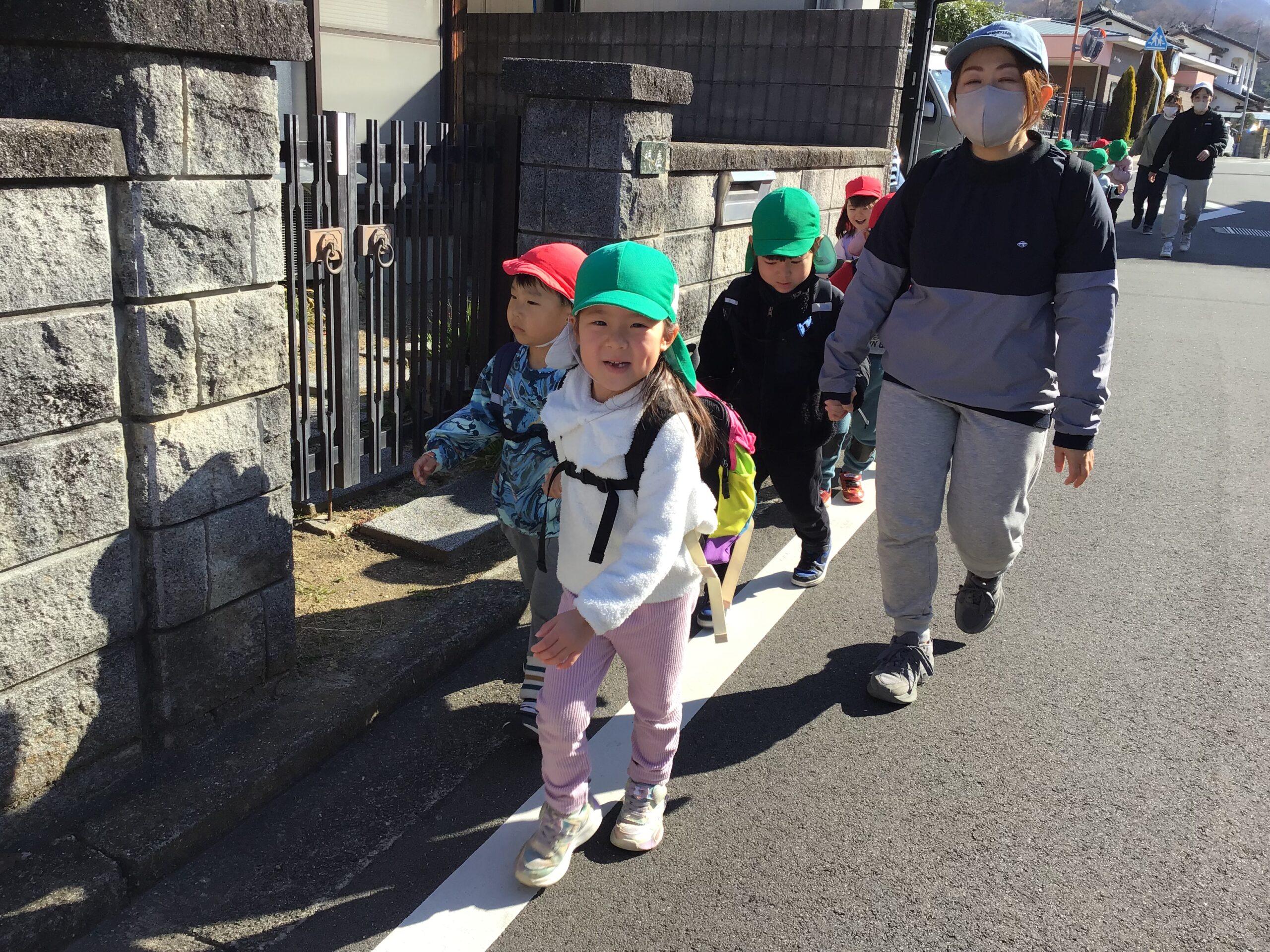 「前の友だちと隙間ができないように歩くよ。」