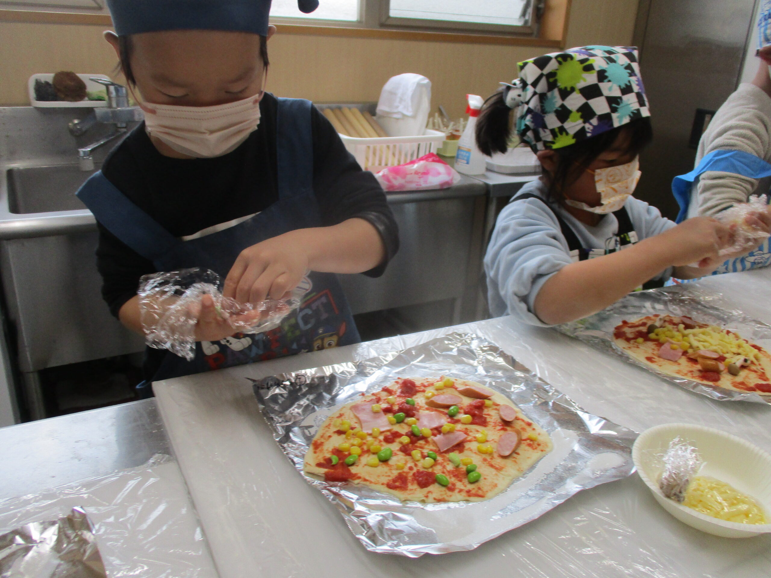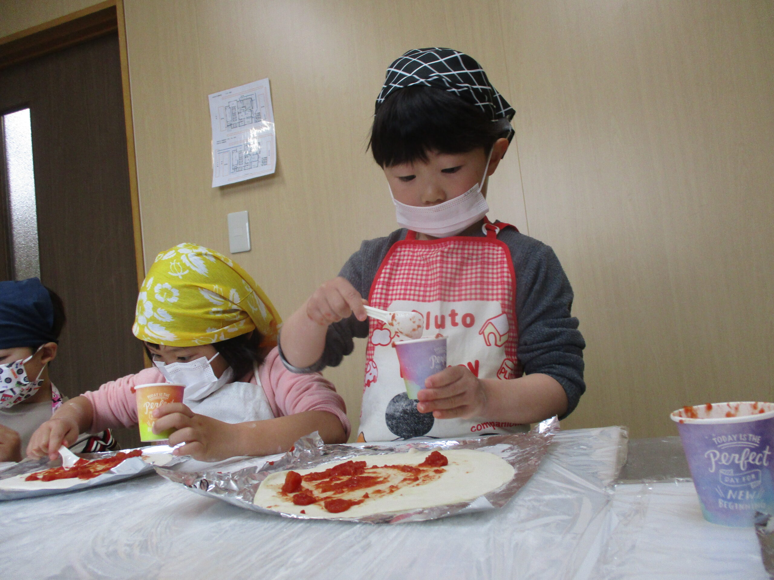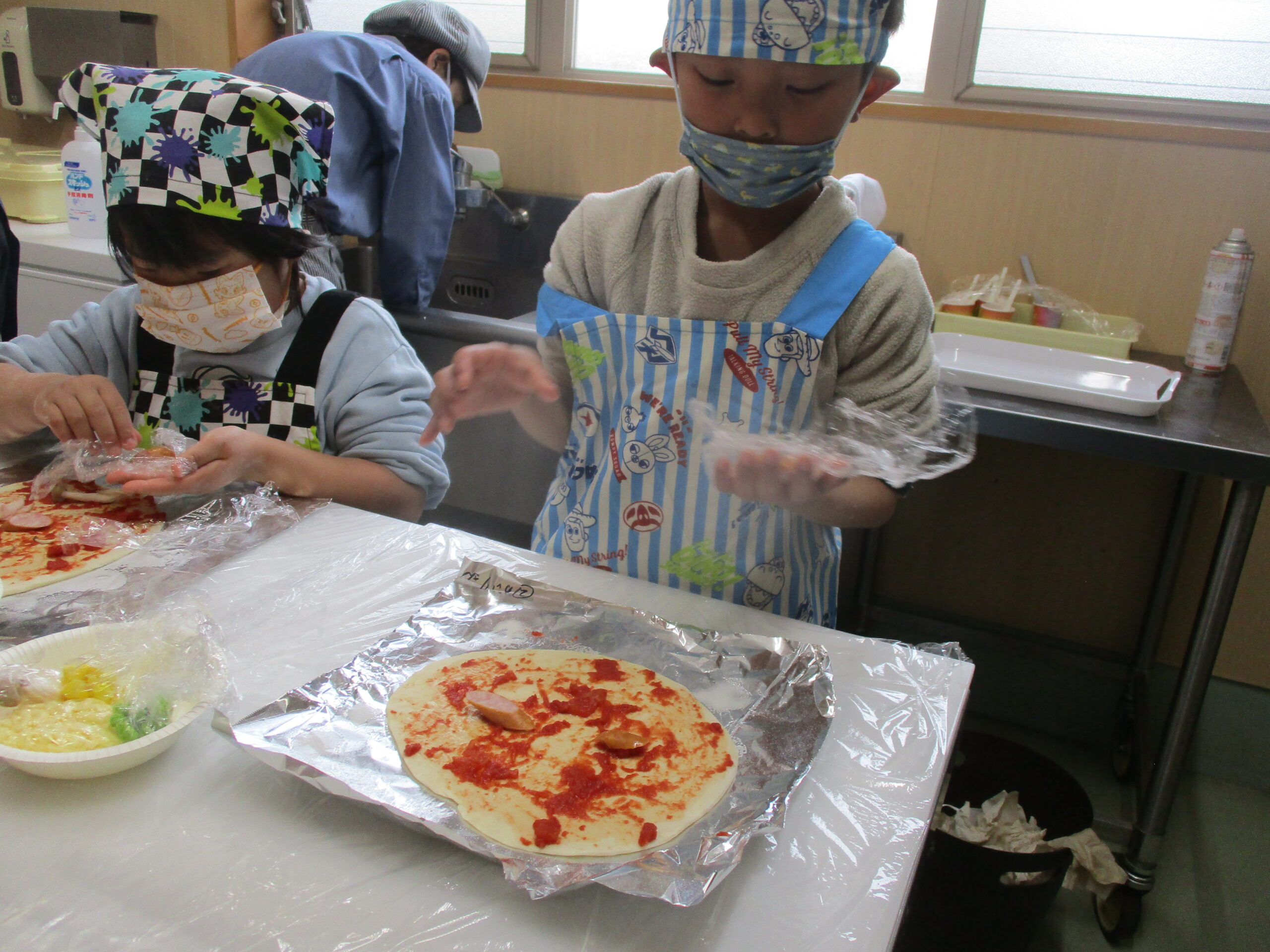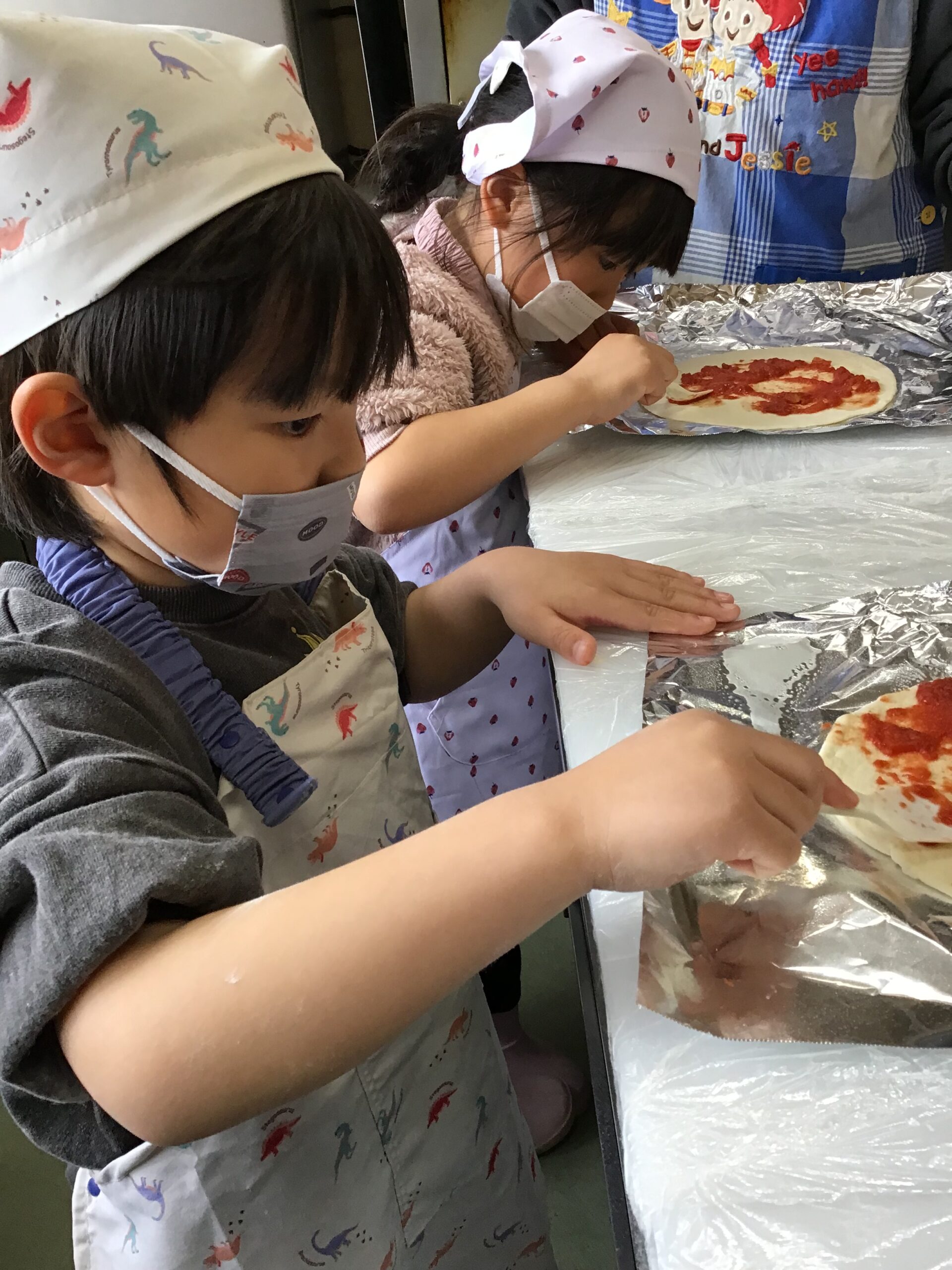 「はやくつくりた~い」とわくわくどきどき☺️☺️エプロン三角巾マスクを付けて準備万端です✌️